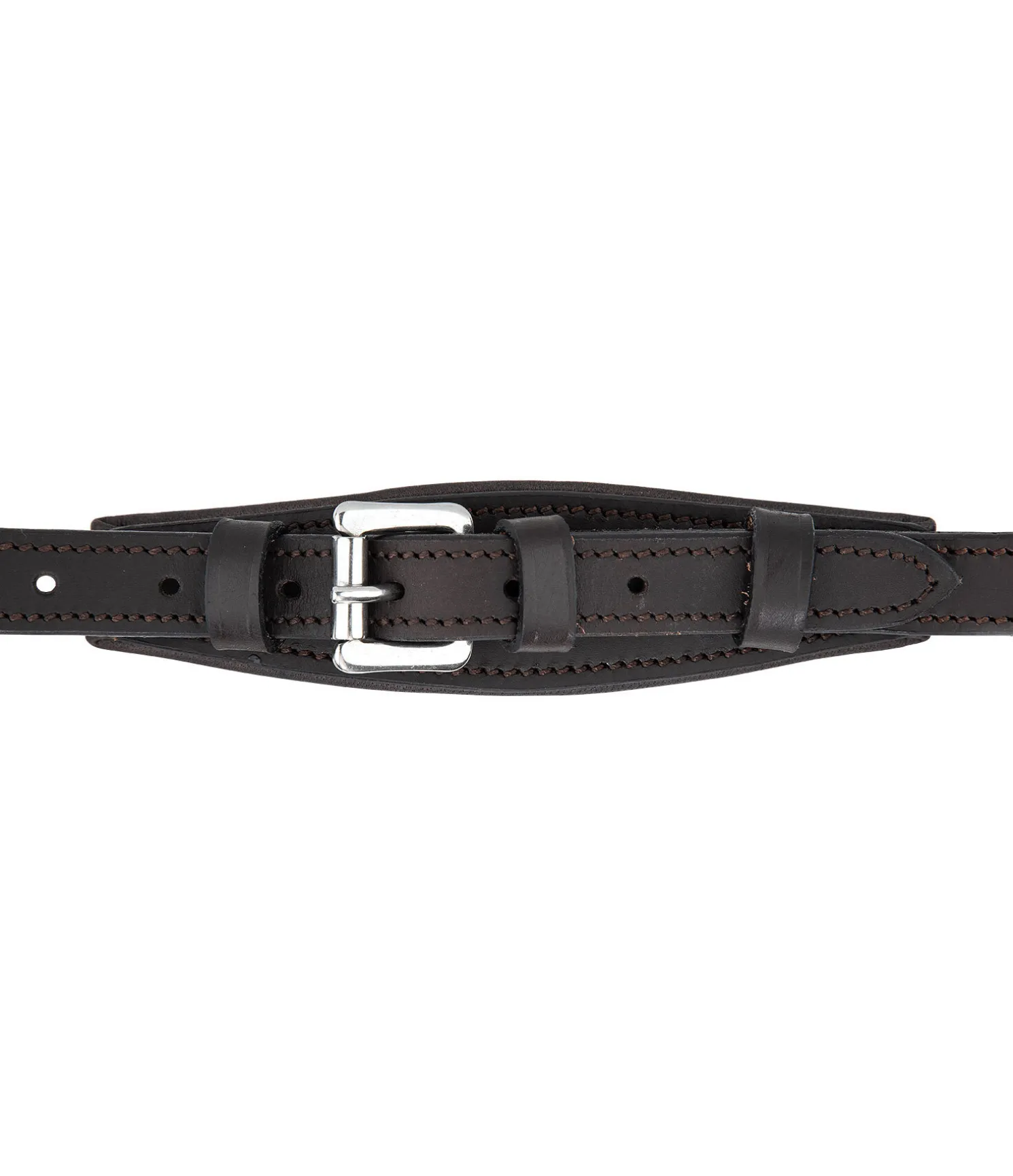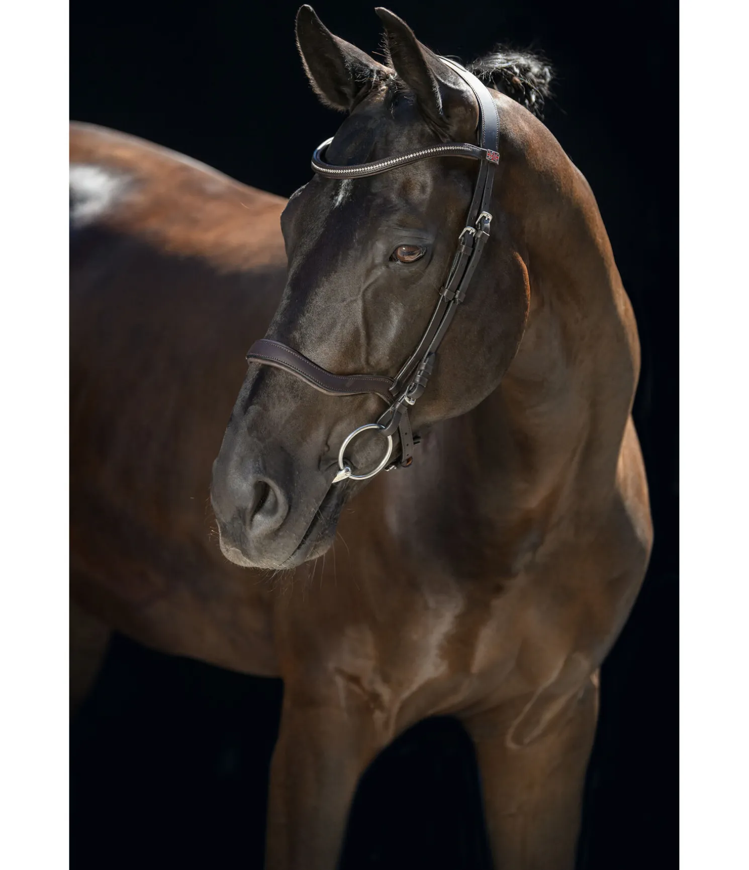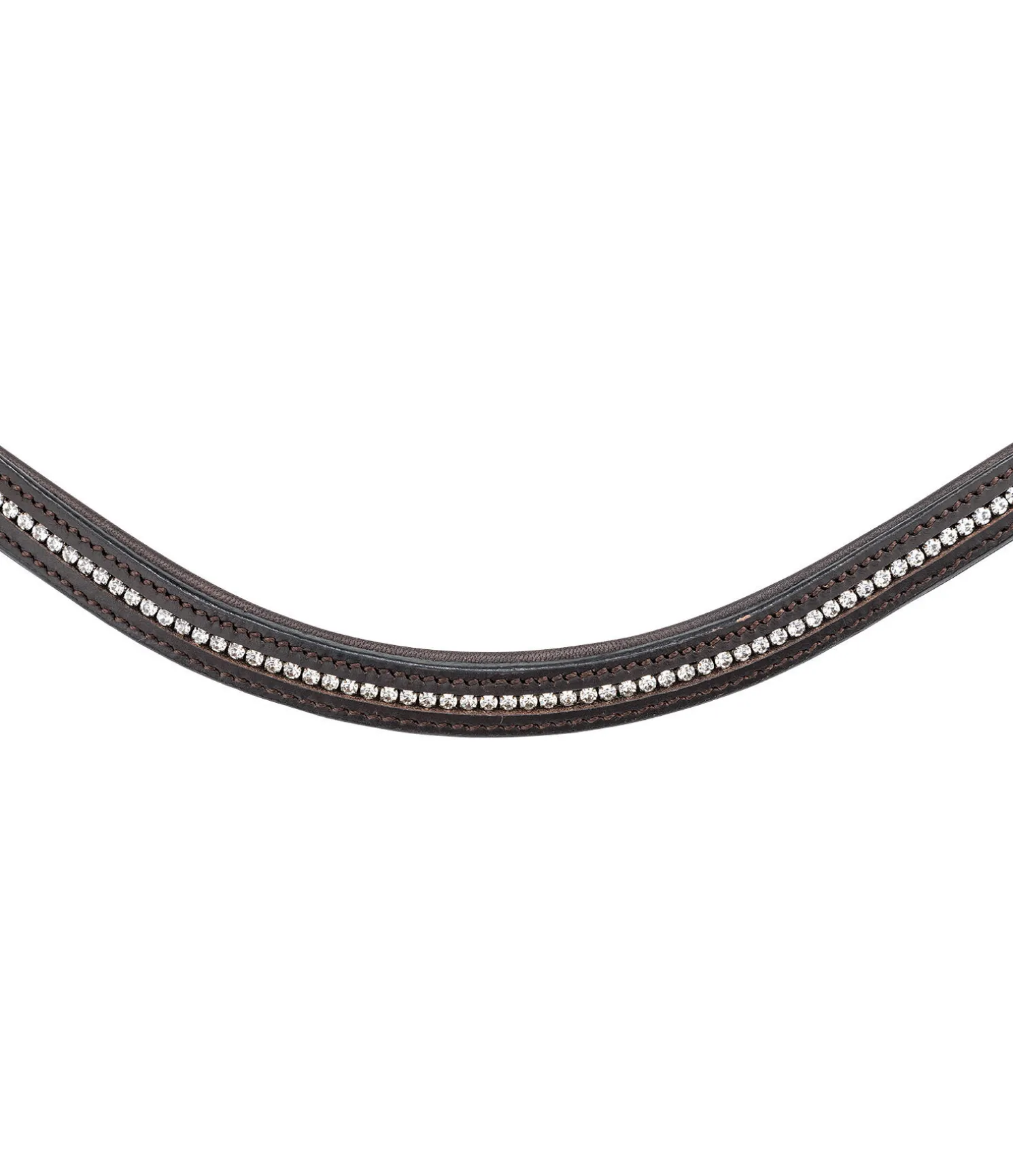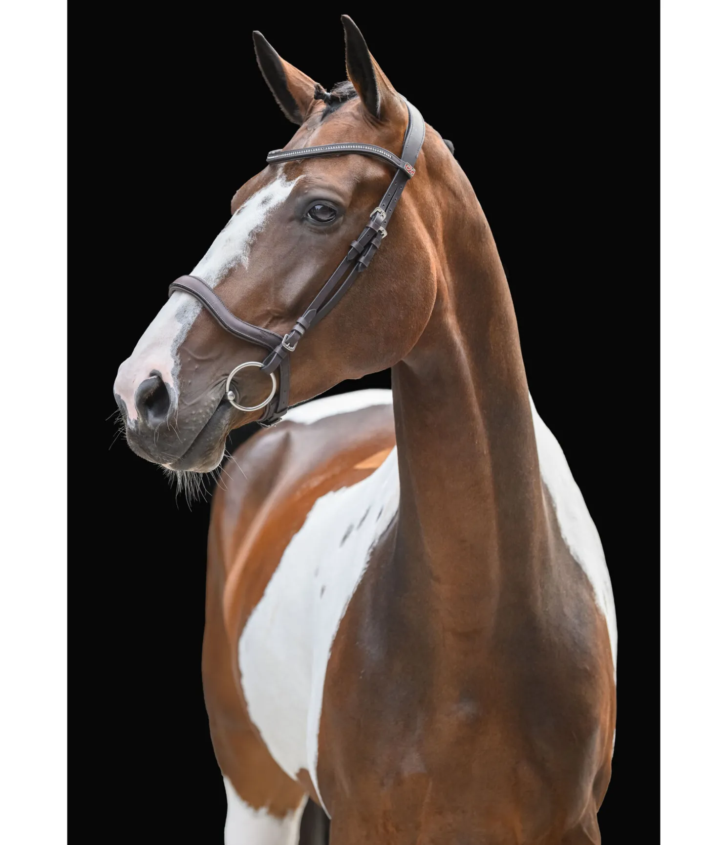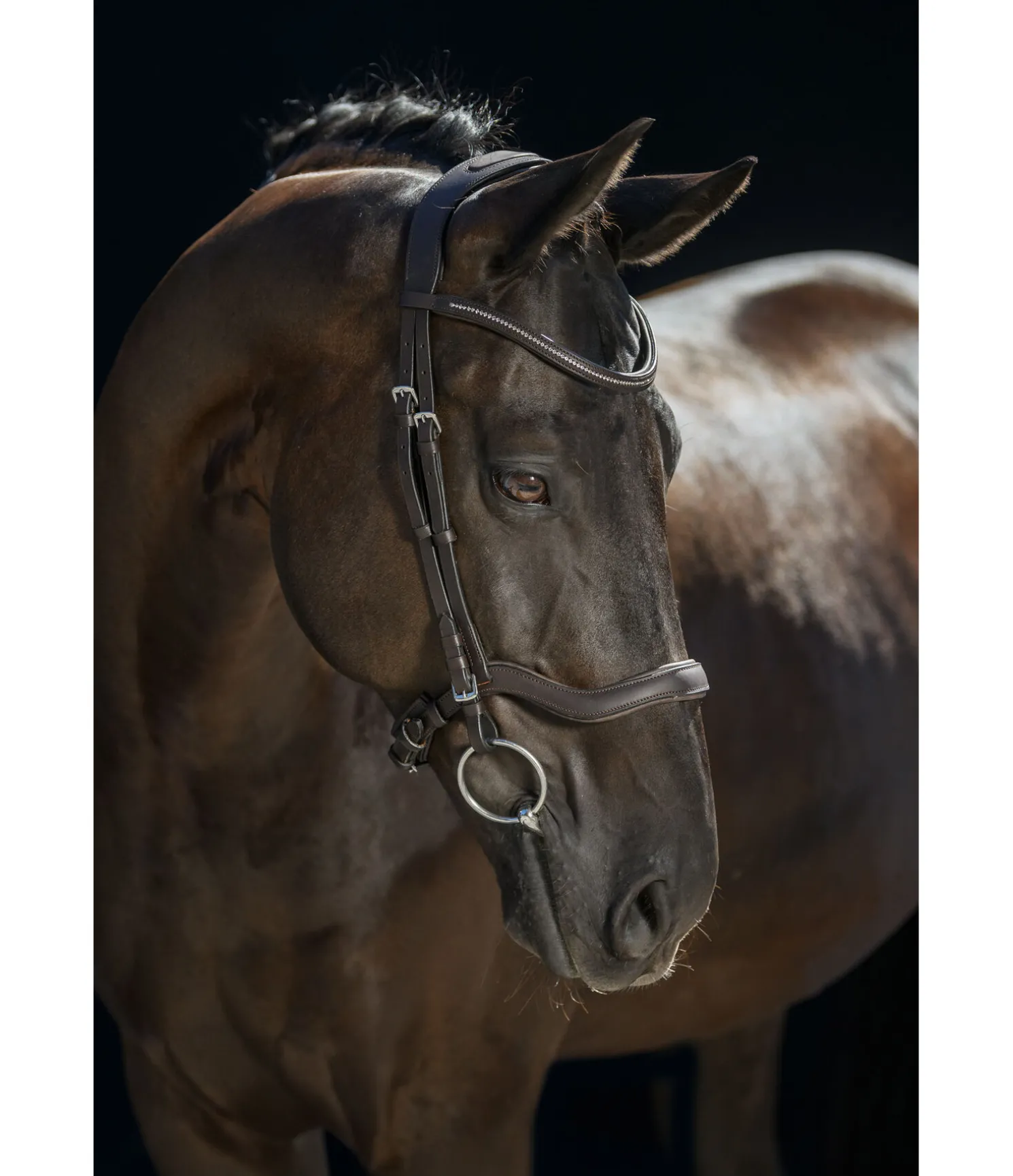 Bridon épuré avec têtière et muserolle anatomiques. Muserolle ergonomique permettant d’éviter les pressions sur les nerfs faciaux sensibles, au niveau des zygomatiques ainsi que sur la mâchoire et les dents. Doublure douce en cuir véritable. Sans noseband ni sous-gorge pour favoriser la mastication. Frontal vague classique avec strass. Bouclerie argentée. Rênes et mors non inclus.