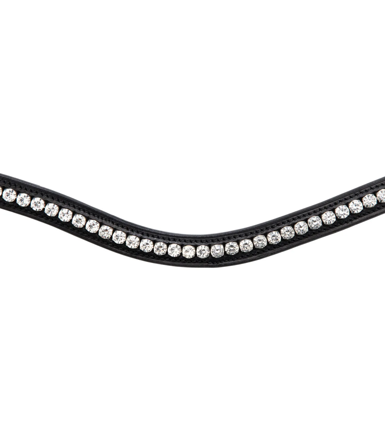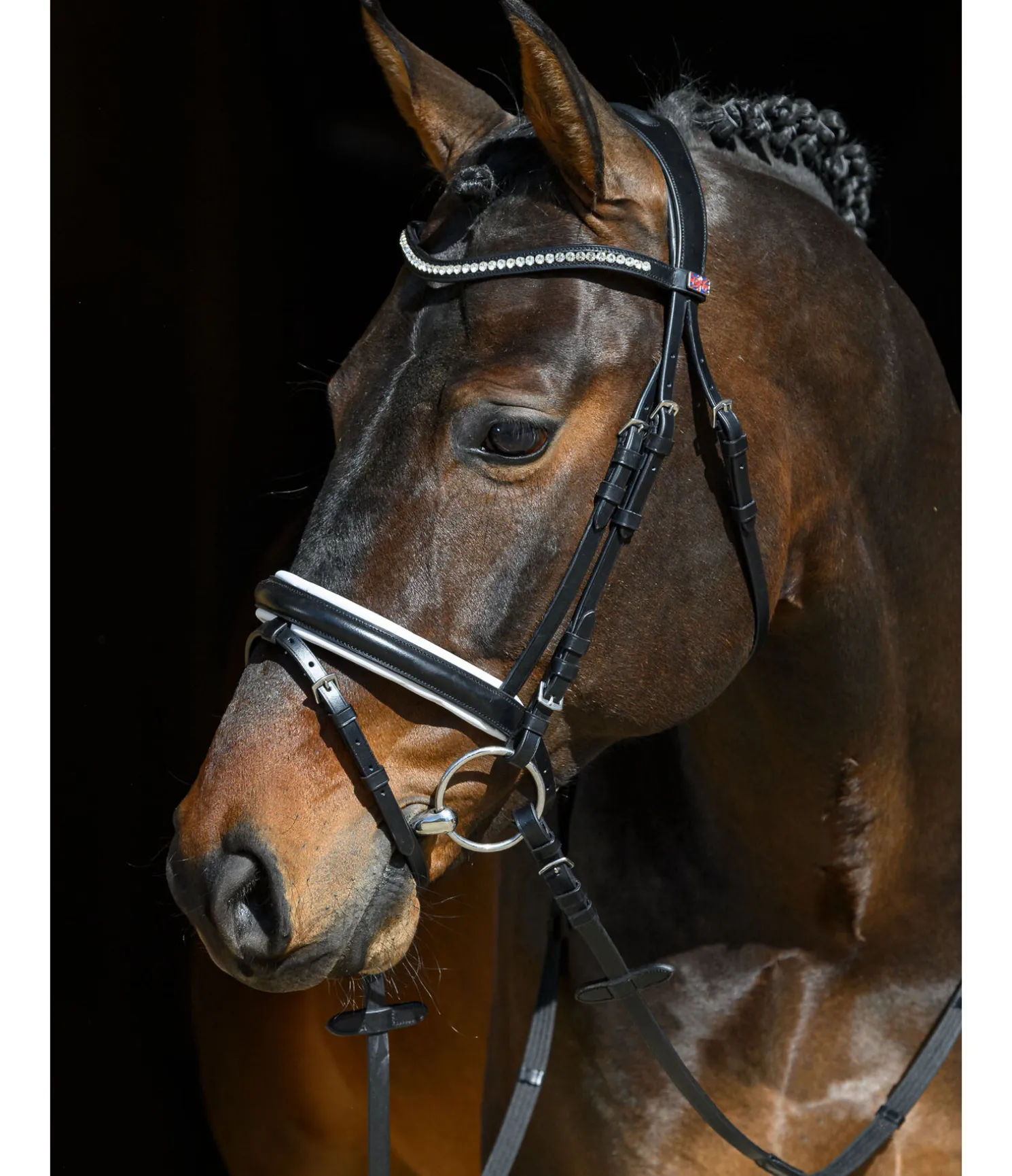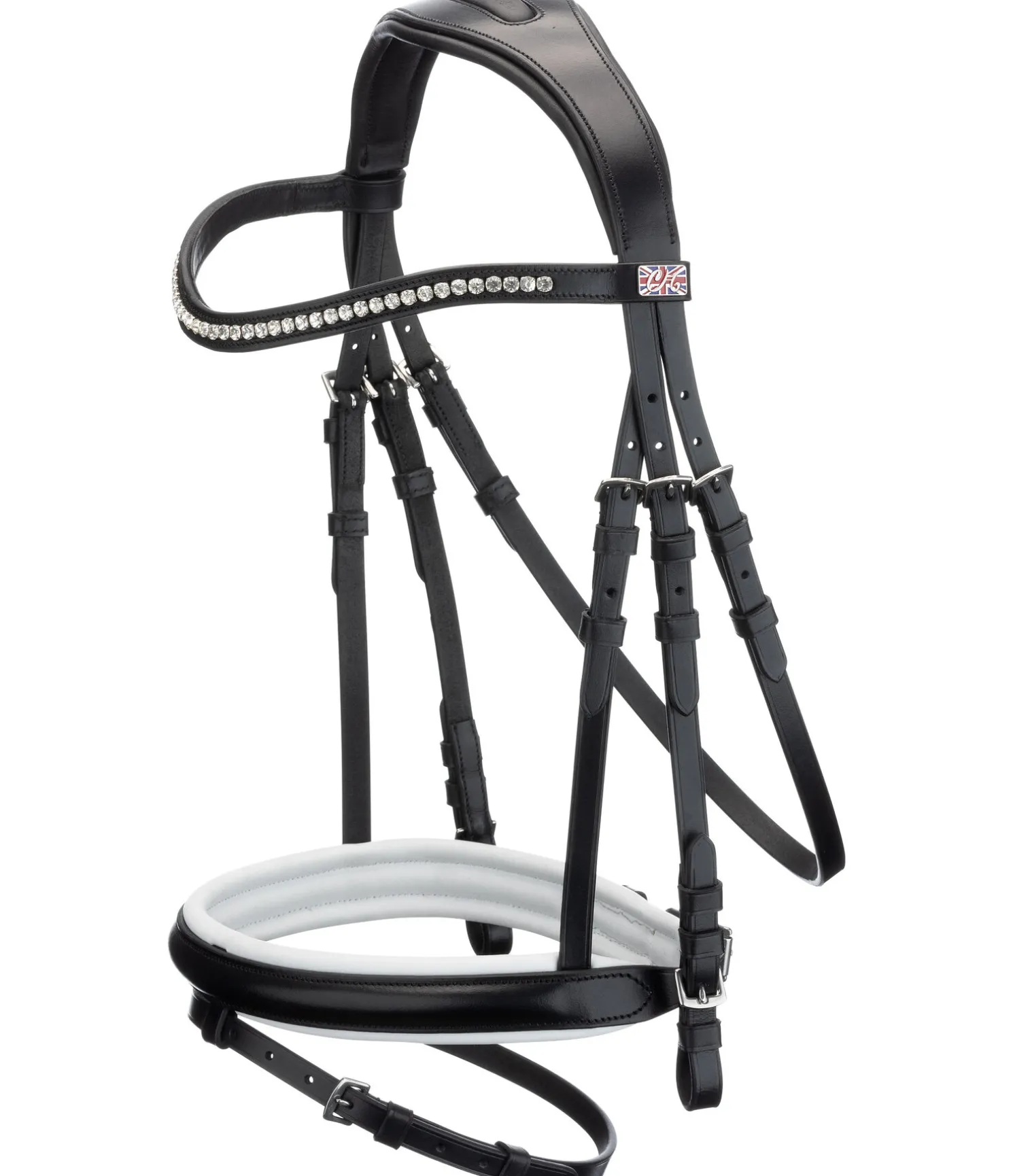 Bridon en cuir classique, têtière anatomique doublée d’une matelassure douce pour une meilleure répartition des pressions. Large muserolle française combinée avec élégante doublure blanche. Frontal vague orné de strass scintillants. Avec rênes, sans mors.
