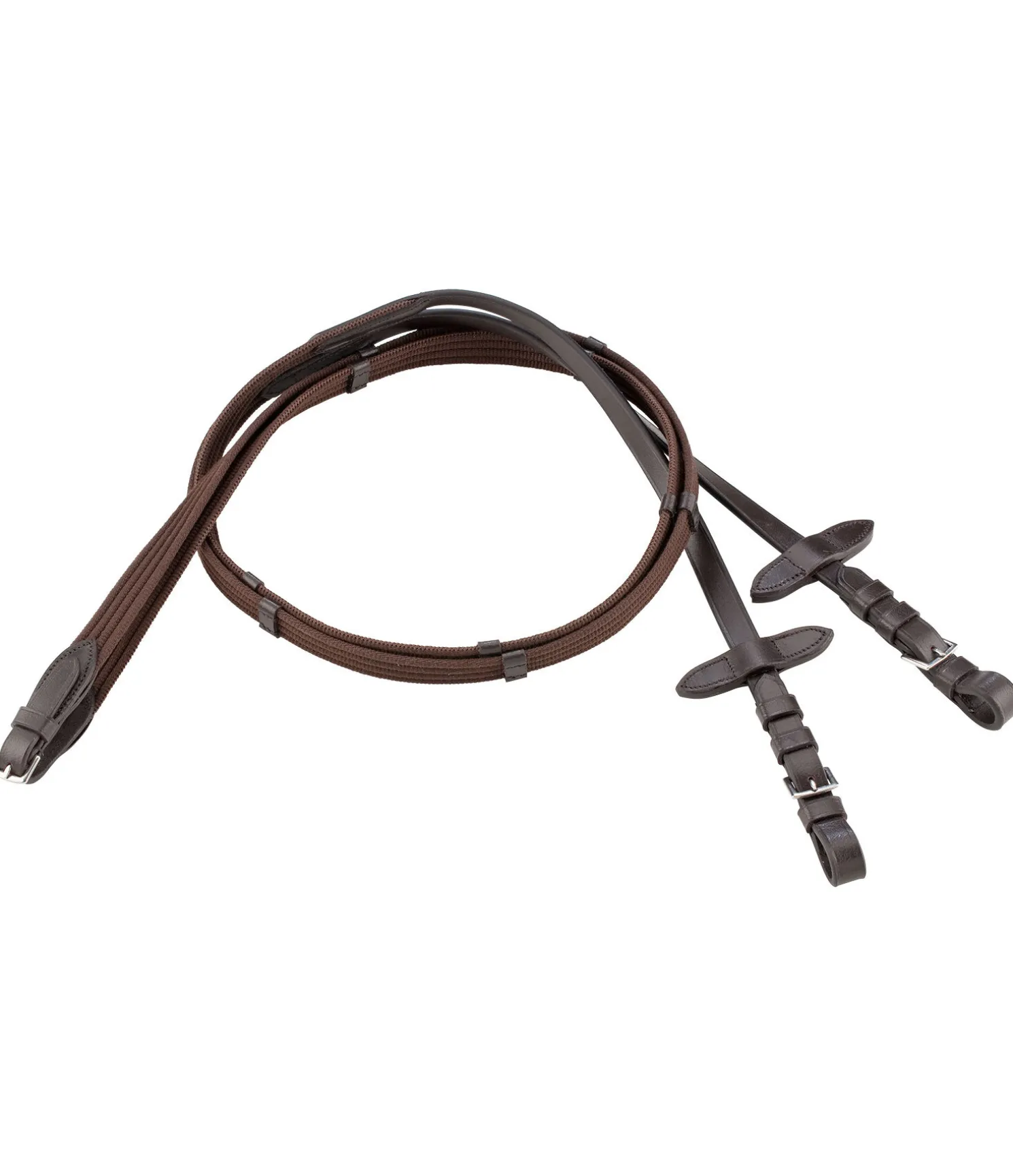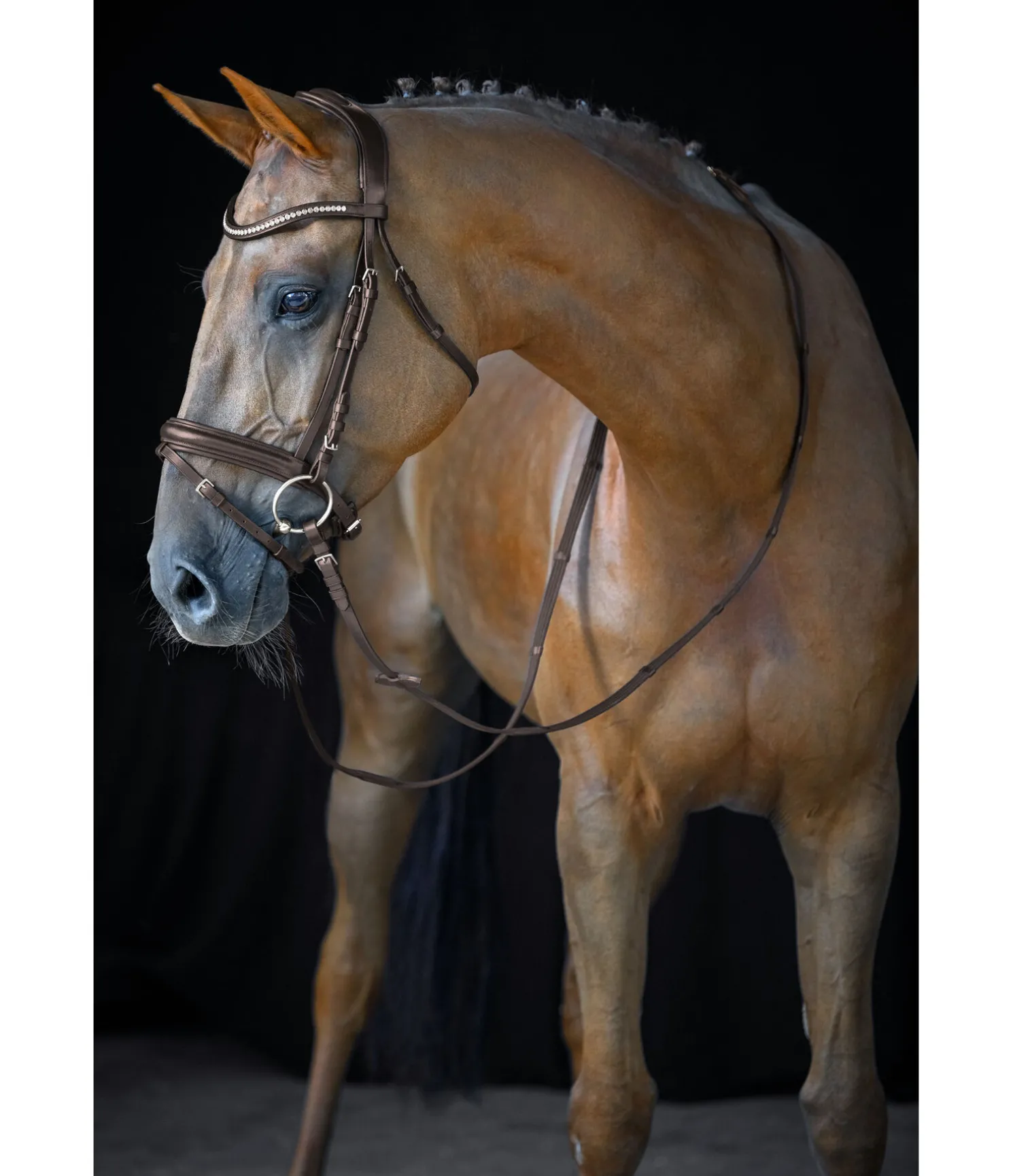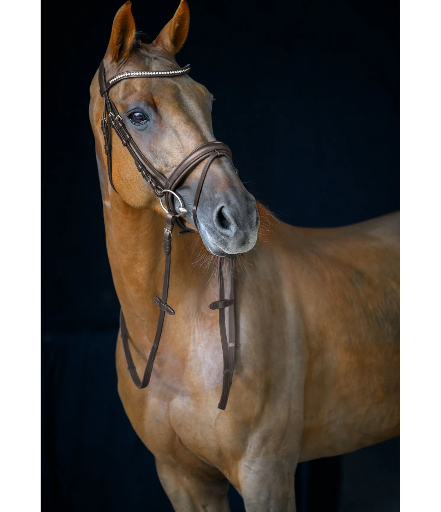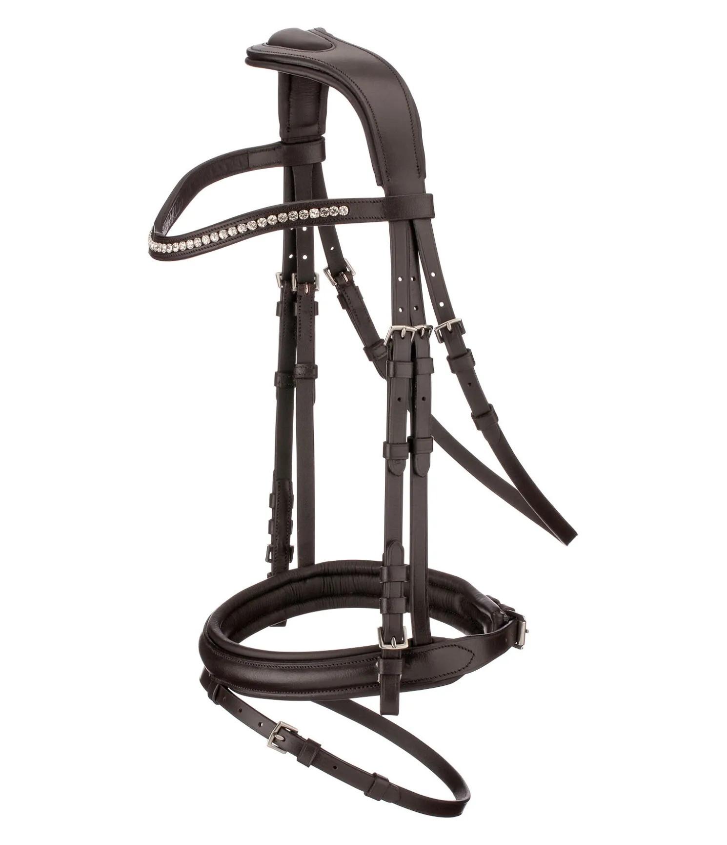 Bridon élégant en cuir avec têtière anatomique innovante pour une répartition optimale des pressions dans la zone de la nuque grâce à la découpe large aux oreilles et à la doublure épaisse. Muserolle française combinée large avec doublure douce. Frontal vague classique orné de gros strass. Bouclerie argentée. Avec rênes sangle, sans mors.