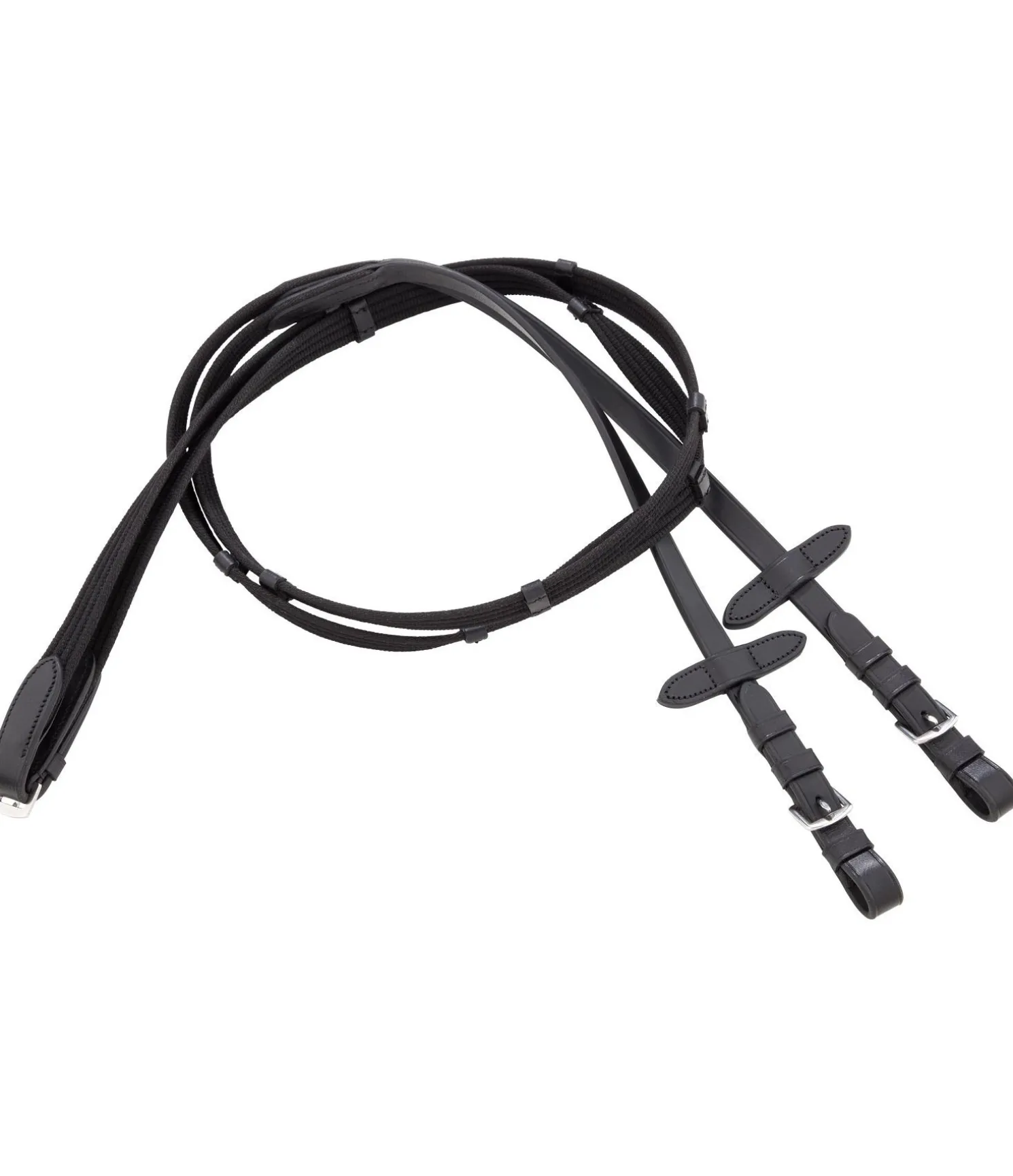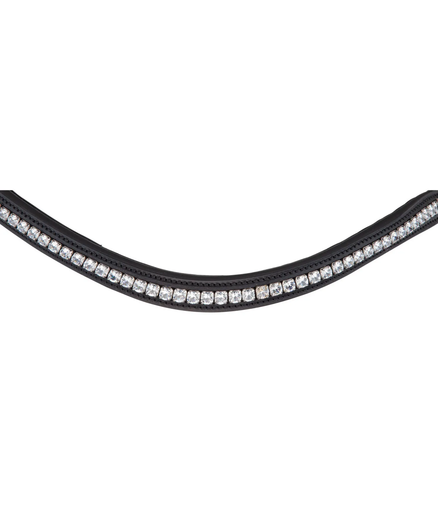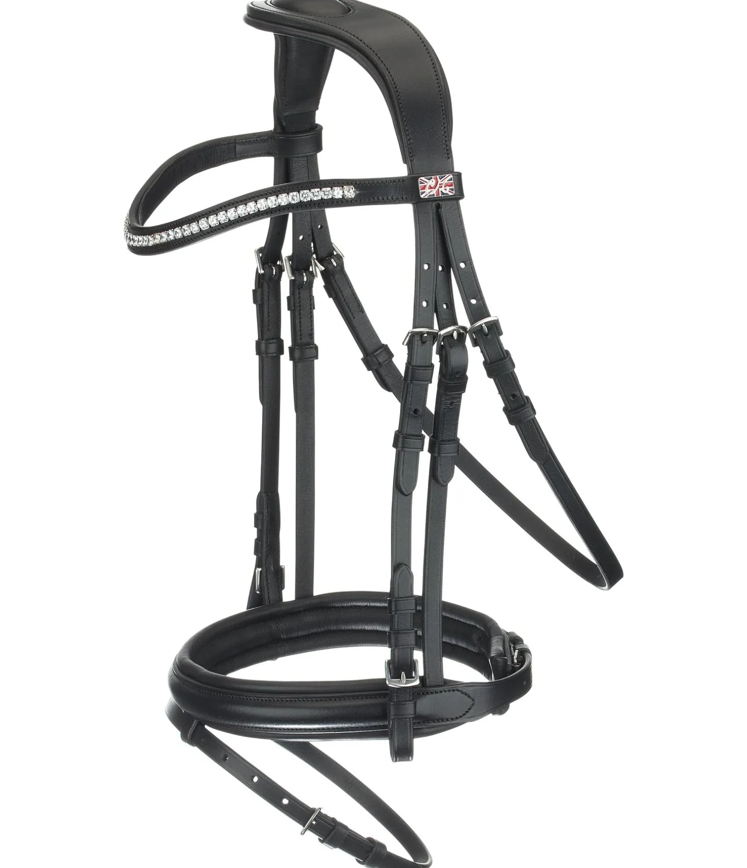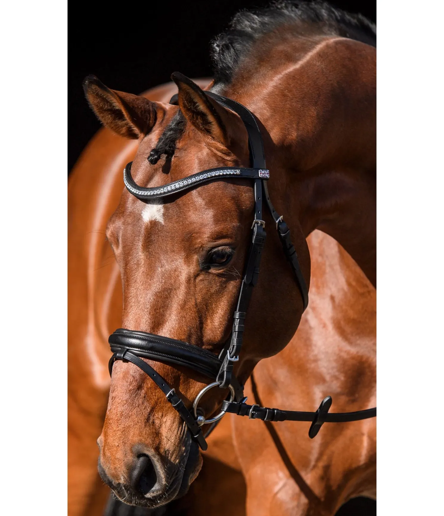 Bridon élégant en cuir avec têtière anatomique innovante pour une répartition optimale des pressions dans la zone de la nuque grâce à la découpe large aux oreilles et à la doublure épaisse. Muserolle française combinée large avec doublure douce. Frontal vague classique orné de gros strass. Bouclerie argentée. Avec rênes sangle, sans mors.