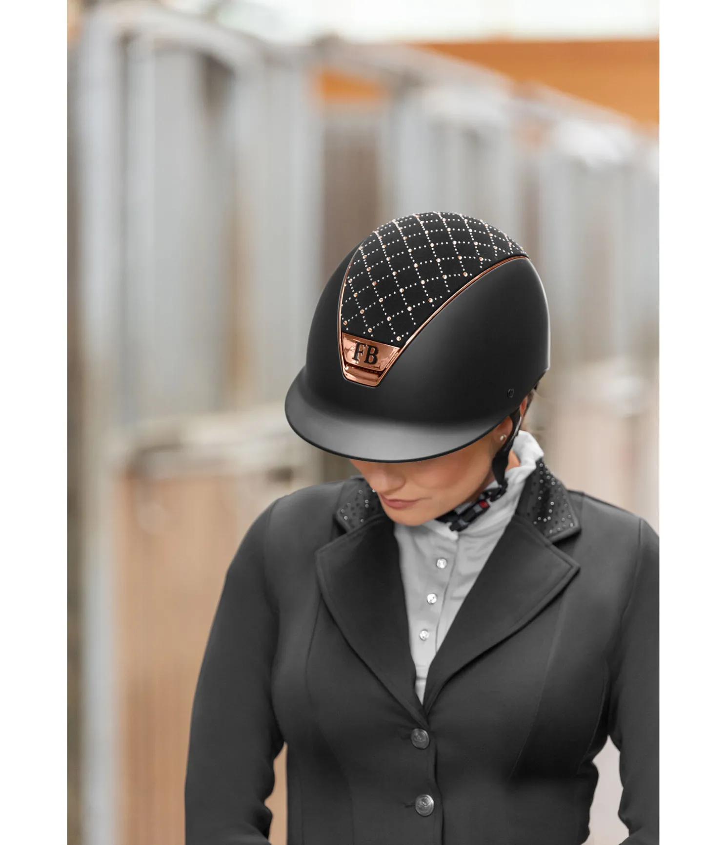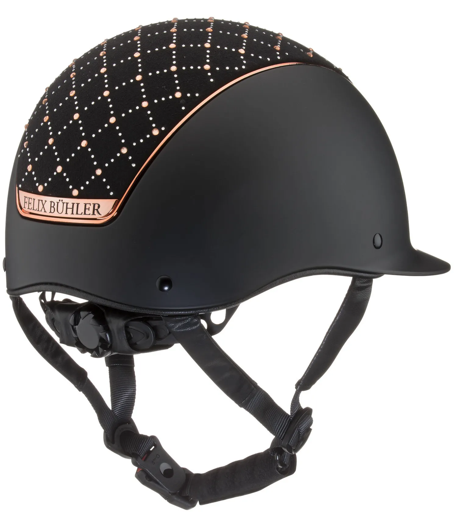 Casque d’équitation Felix Bühler haut de gamme avec décor de strass disposés en losanges. Pour garantir un niveau de sécurité maximal, ce casque est doté de la technologie Hardshell avec une coque extérieure résistante aux chocs. Les ouvertures à l’avant assurent une aération optimale sur l’ensemble de la tête grâce à des canaux de ventilation internes passant de l’avant à l’arrière du casque. La doublure intérieure absorbant l’humidité est amovible et lavable à 30°C. Le casque dispose d’une fermeture magnétique innovante pour une ouverture à une seule main, facile et rapide. Grâce à la fonction Easy-Lock/No-Unlock, l’aimant verrouille l’attache dès que la boucle est approchée du fermoir. L’ouverture accidentelle du fermoir en tirant ou en tournant la boucle est impossible. Celle-ci peut être déverrouillé uniquement en appuyant fermement sur le bouton Unlock situé sur le côté. La molette à l’arrière du casque offre un ajustement précis et individuel, au millimètre près, à la circonférence de la tête. Les sangles recouvertes soulignent le design raffiné du casque et disposent de coussinets au niveau de la nuque et du menton pour garantir un confort de port optimal au cavalier. Ce casque d’équitation est certifié selon la norme EN1384:2023.