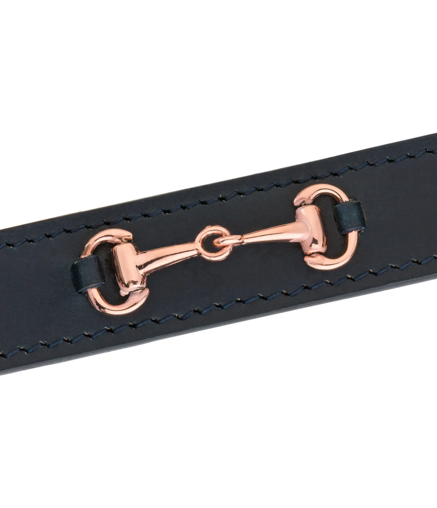 Élégante ceinture en cuir véritable. Motifs de petit mors sur toute la longueur. Coloris noir et marron avec boucle et mors argentés et coloris navy avec boucle et mors rose doré. Largeur 2,5 cm.