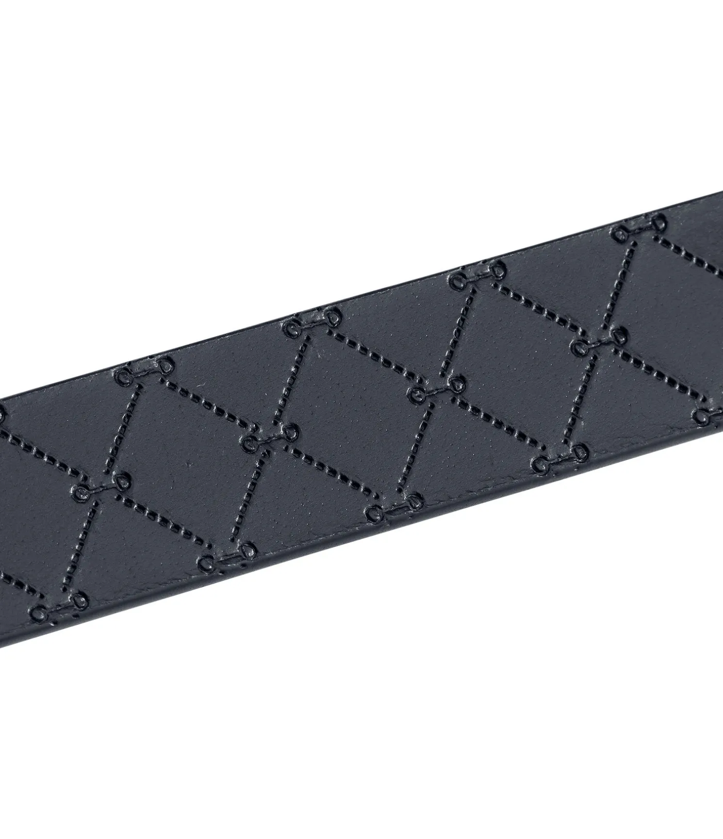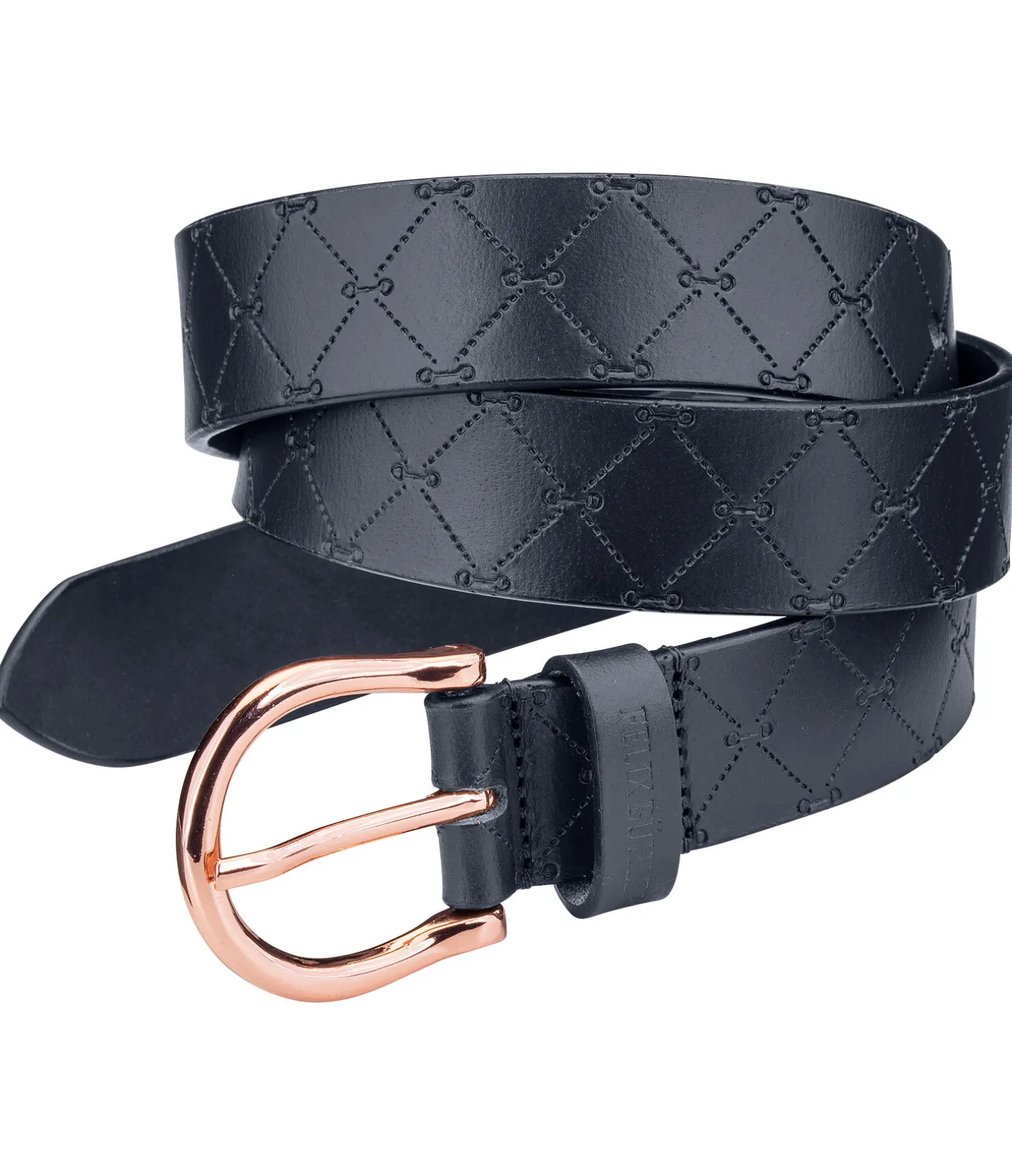 Ceinture élégante en cuir véritable avec gaufrage de petits mors. Disponible en cuir noir avec boucle argentée, en cuir de couleur navy avec boucle rose doré ou en cuir marron avec boucle dorée.