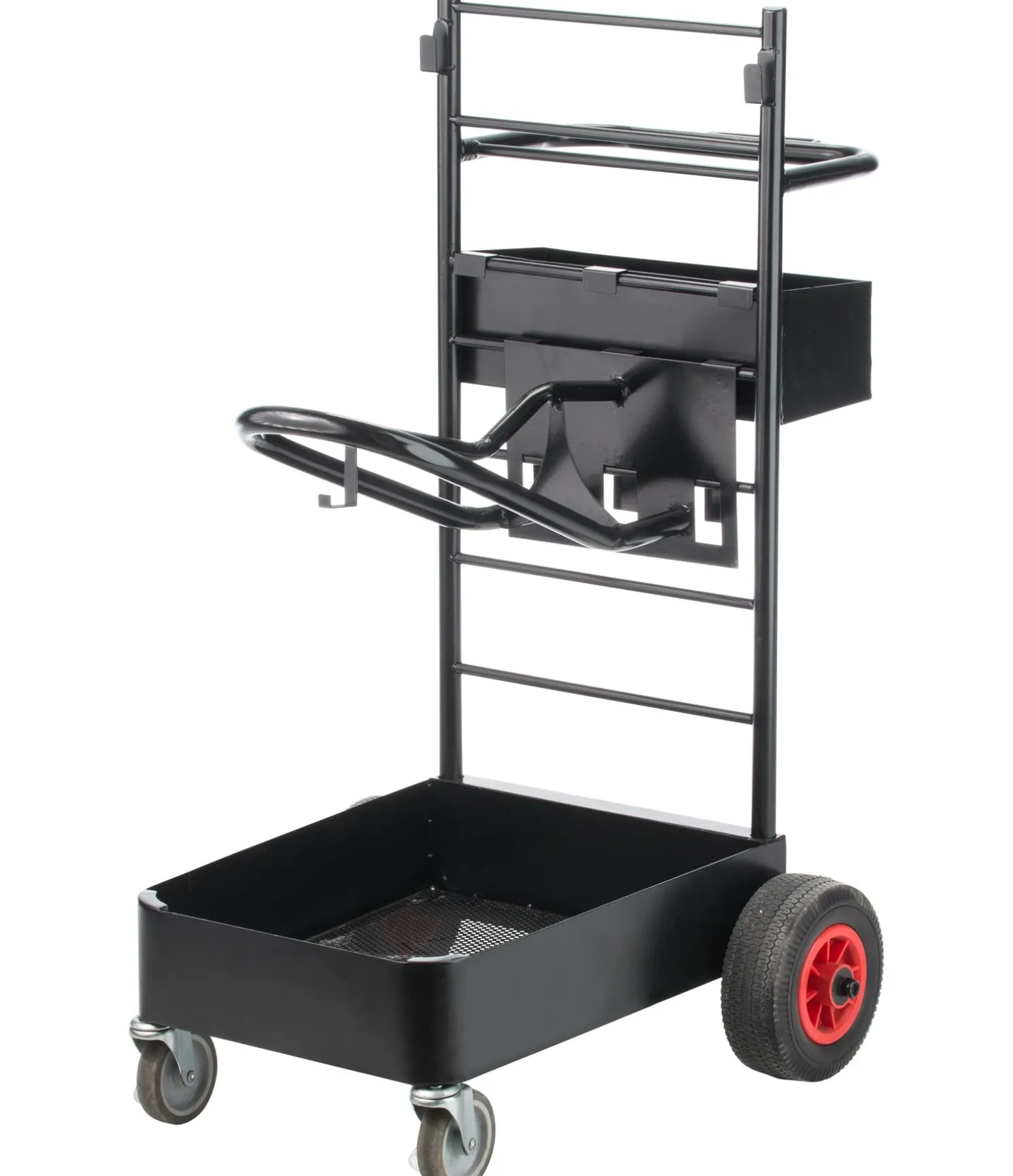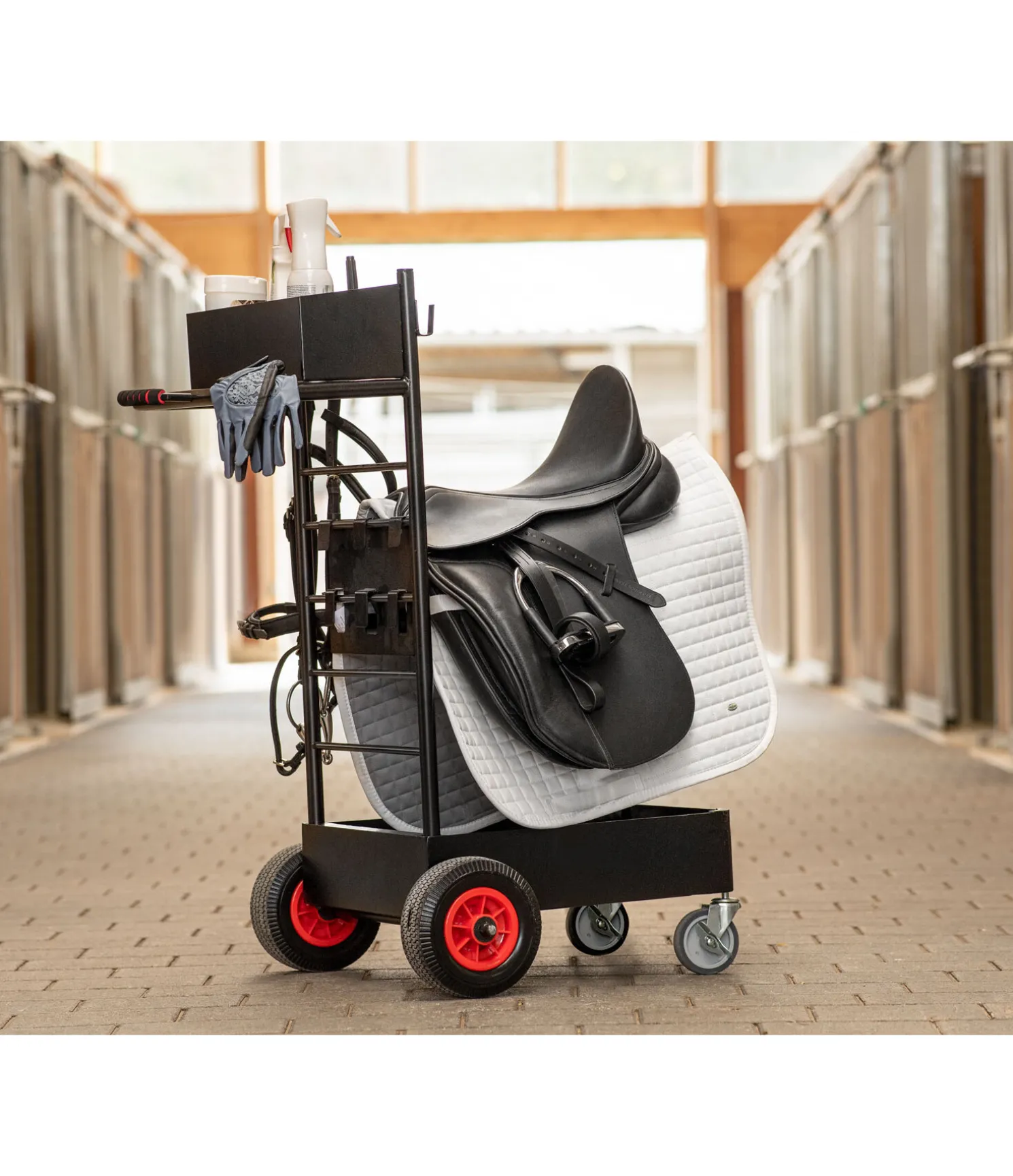 Chariot porte-selle luxueux, utilisable partout grâce à ses larges pneus. Les roues avant sont rotatives et permettent de manoeuvrer facilement le chariot. Le chariot porte-selle offre de nombreux espaces de de rangement et divers supports pour caser tout l’équipement. Dimensions : 94 cm x 63 cm.