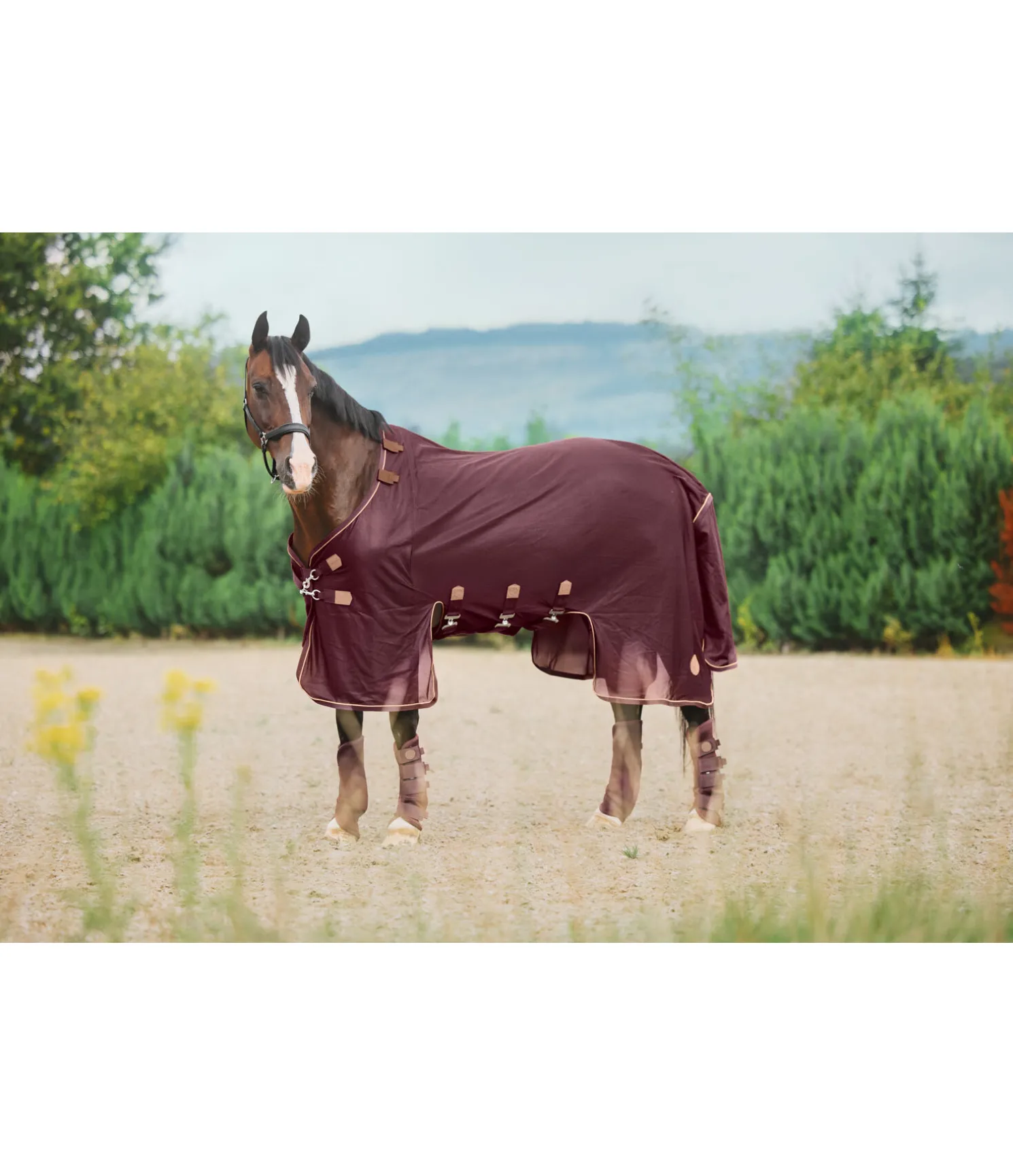 Élégante chemise anti-mouches dans une coupe Fullneck en matière à mailles légère et respirante, ornée d’un badge en synthétique avec logo embossé. Couvre-cou amovible grâce aux pattes auto-agrippantes. Doublure intérieure satinée avec motif à carreaux au niveau des épaules et de la crinière, pour éviter la casse de crins et maintenir la robe brillante. Rabat ventral avec sursangles réglables amovibles, généreux rabat de queue et courroie de queue. Coupe extra longue à l’avant et à l’arrière pour une protection idéale. Fermeture de poitrail pratique équilibrée en plusieurs points avec 2 mousquetons. 100 % polyester.