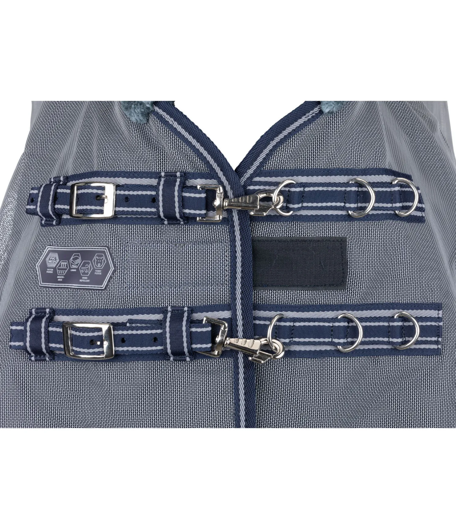 Chemise d’écurie polyvalente en tissu Mesh à base de PVC particulièrement résistant et empêchant la poussière de rester accrochée. Fonction séchante et doublure intérieure absorbant l’humidité. Idéale en tant que chemise d’écurie, séchante ou de transport. Plis d’aisance en polaire extensibles pour une liberté de mouvement optimale. Pad de garrot moelleux en polaire Teddy. Double fermeture de poitrail réglable avec mousquetons et patte auto-agrippante supplémentaire pour un maintien sûr. Sursangles croisées, courroie de queue réglable et rabat de queue. Extérieur en mesh : 100 % PVC, doublure polaire 100 % polyester.