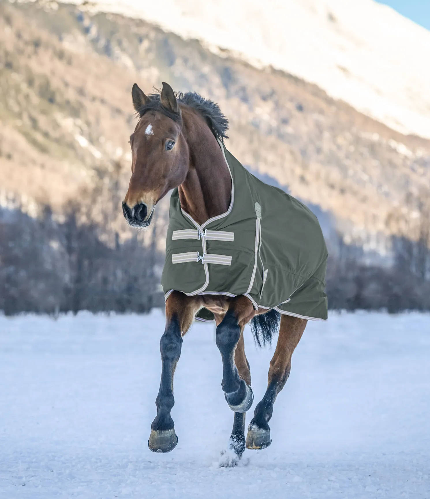 Chemise d’extérieur Highneck technique. Matière Ripstop (600 deniers) et imperméable (3.000 mm). La coupe Highneck permet d’éviter les pressions au niveau du garrot et empêche l’infiltration d’eau au niveau des épaules pour une protection efficace en cas de forte averse. Plis d’aisance pour une liberté de mouvement optimale. Double fermeture de poitrail avec crochets en T et patte auto-agrippante supplémentaire. Sursangles croisées réglables et rabat de queue. Anneaux permettant la fixation de courroies de cuisses (non incluses). Courroie de queue réglable incluse. Doublure lisse protégeant la robe. 100 % polyester.