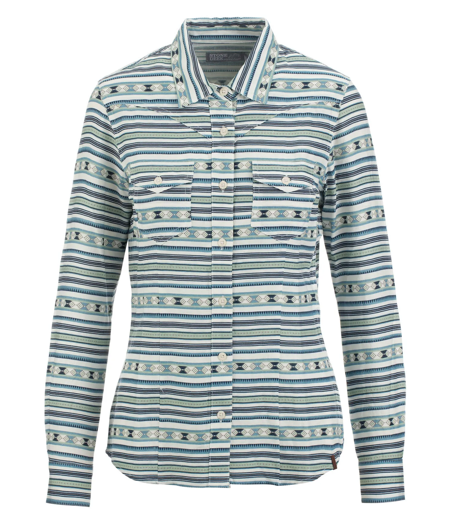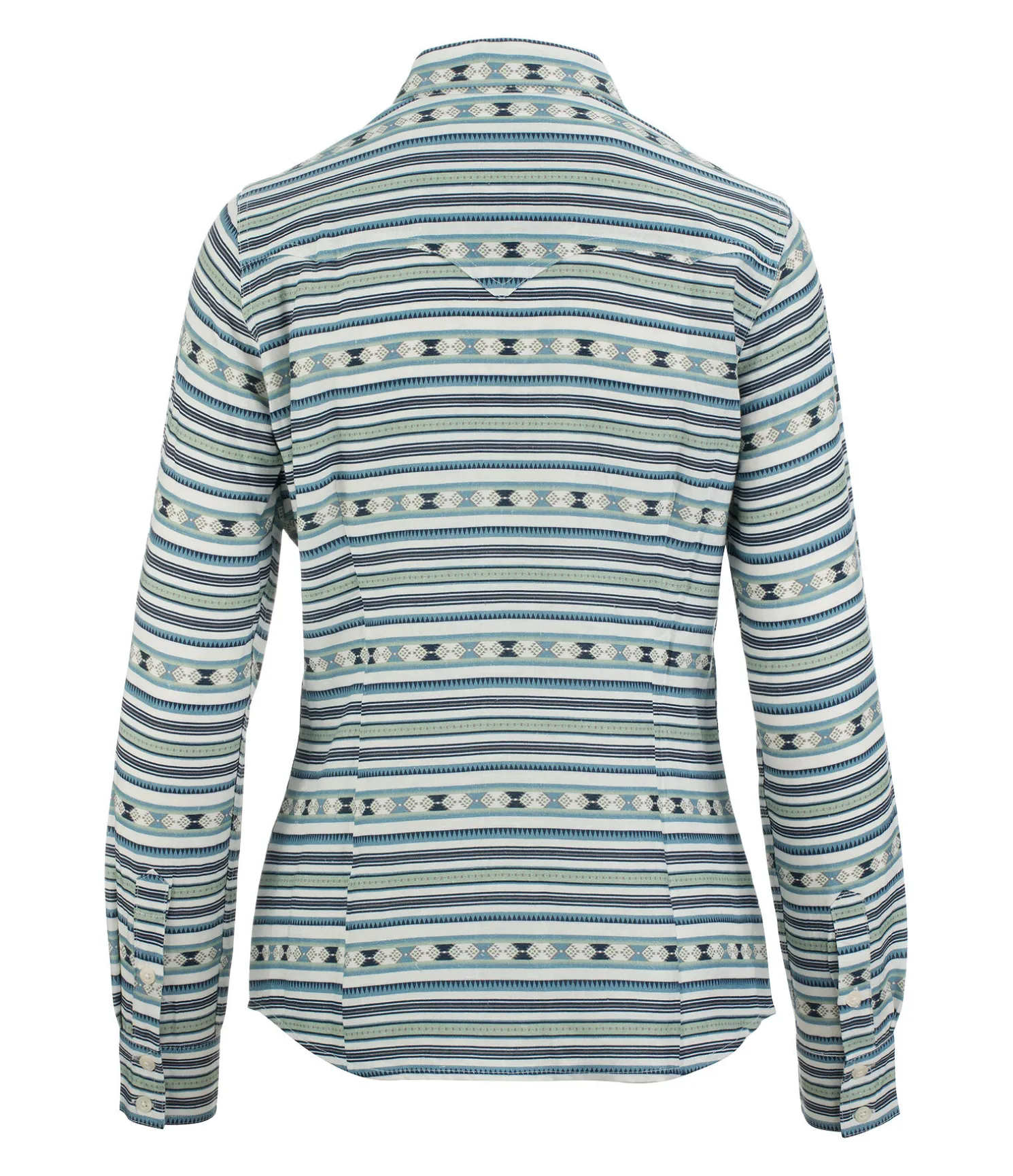 Chemise femme chic et légèrement cintrée avec motifs aztèques et poches à rabat sur la poitrine. Empiècement western aux épaules. Respirant. 70% viscose, 30% lin.