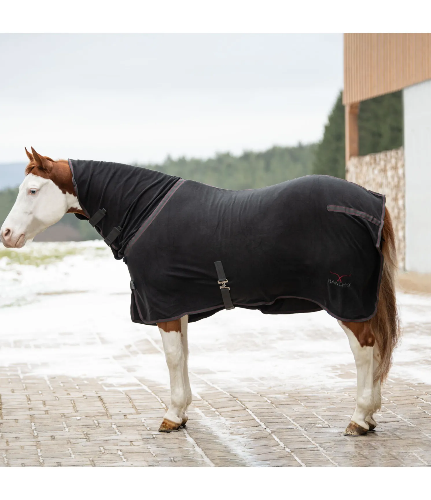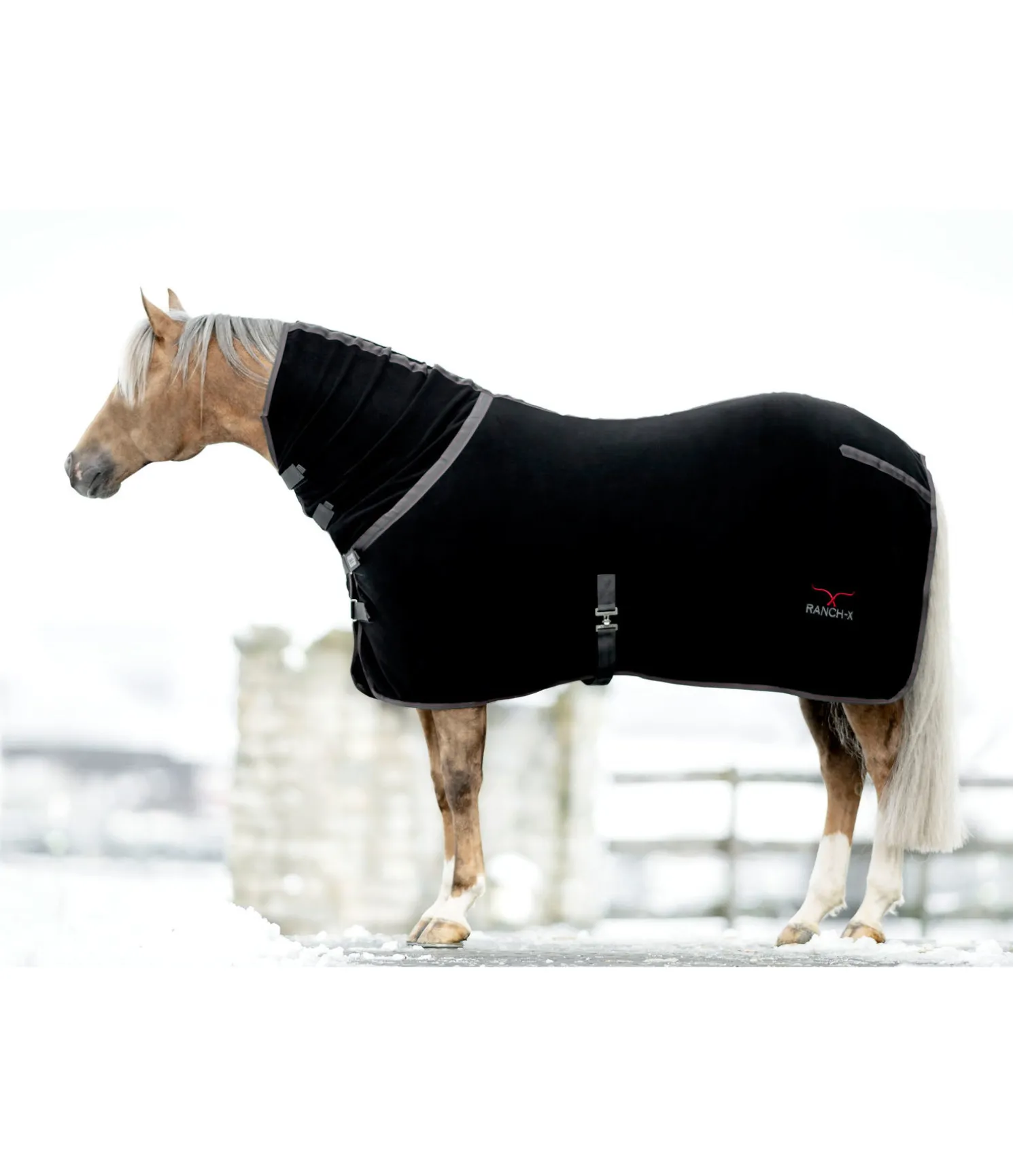 Chemise séchante respirante exclusive en polaire RANCH-X, avec couvre-cou et sangle ventrale. Polaire anti-bouloches qui permet d’évacuer efficacement l’humidité vers l’extérieur pour faire sécher le cheval tout en douceur. Courroie de queue amovible et 4 pattes auto-agrippantes à l’avant, pour un maintien efficace au niveau des épaules et de l’encolure. Coupe spéciale chevaux western. 100 % polyester.