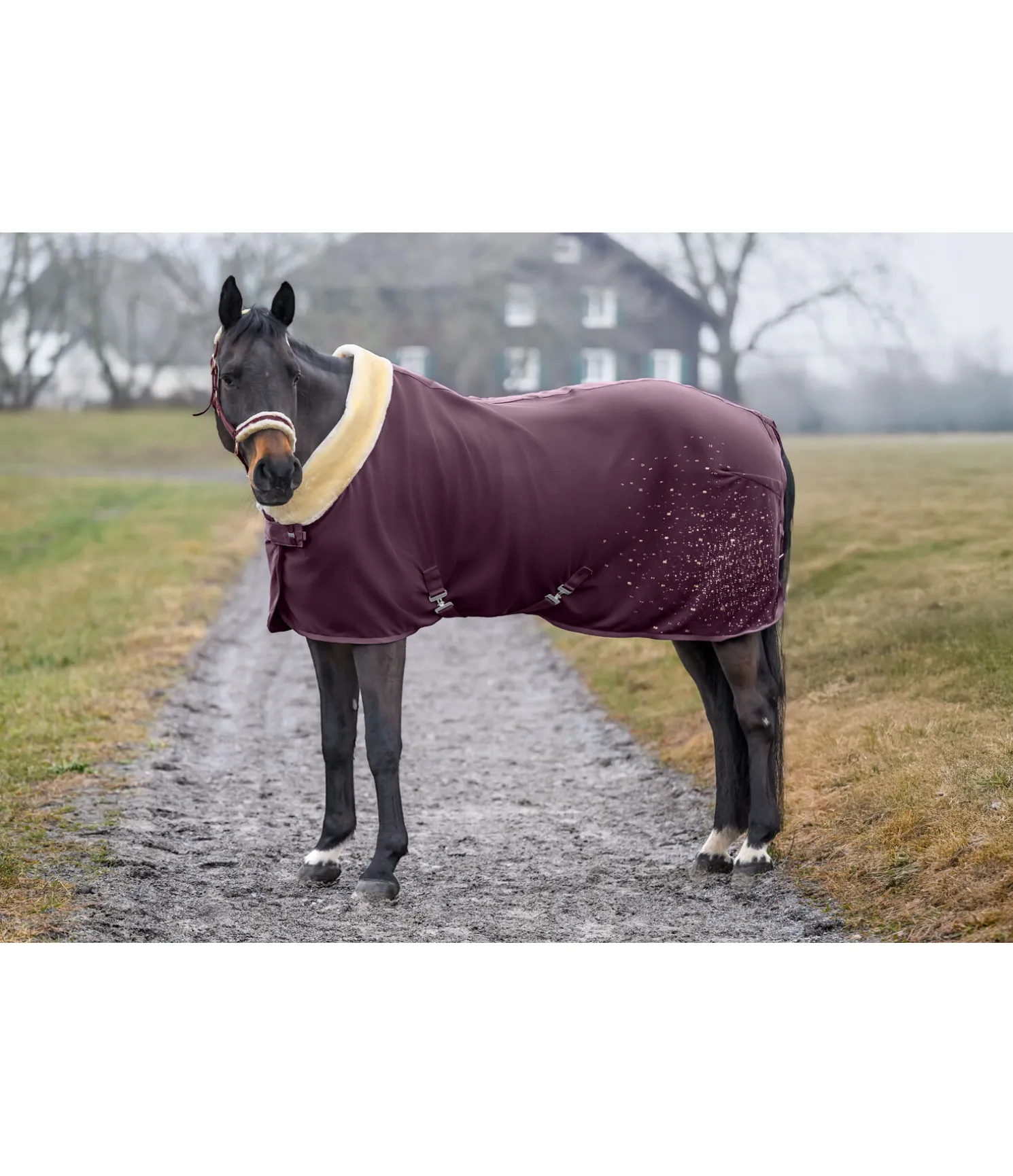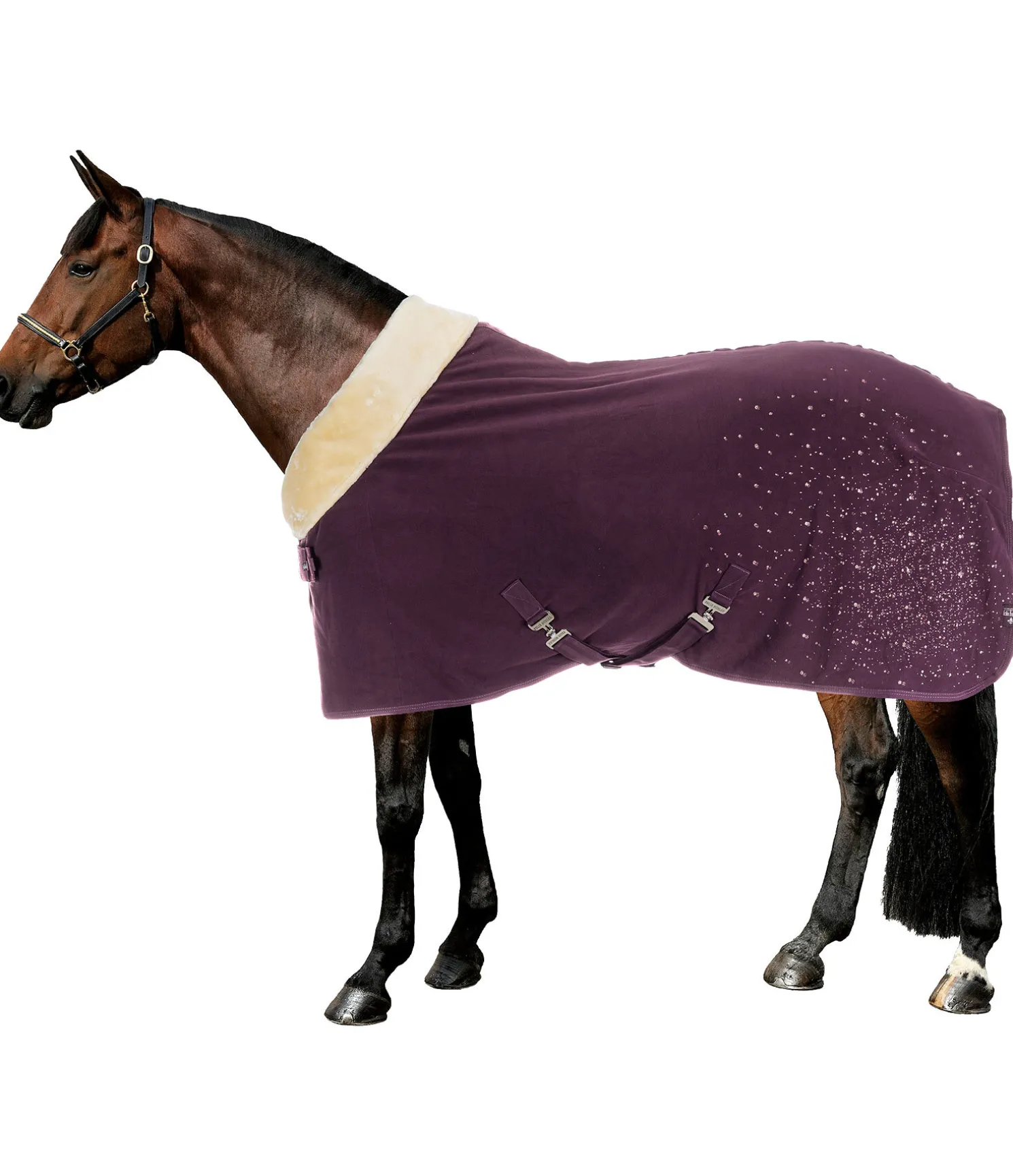 Chemise séchante chaude et douce avec col rembourré en polaire Teddy. Joli imprimé scintillant sur la partie arrière gauche de la couverture. Doublure lisse protégeant la robe au niveau des épaules et du poitrail, pour éviter les irritations dues aux frottements. Sursangles croisées amovibles de chaque côté. Fermeture de poitrail dissimulée avec crochet en T. Courroie de queue réglable incluse. Bouclerie argentée pour la couleur S et GA et rose doré pour la couleur NV. 100 % polyester.
