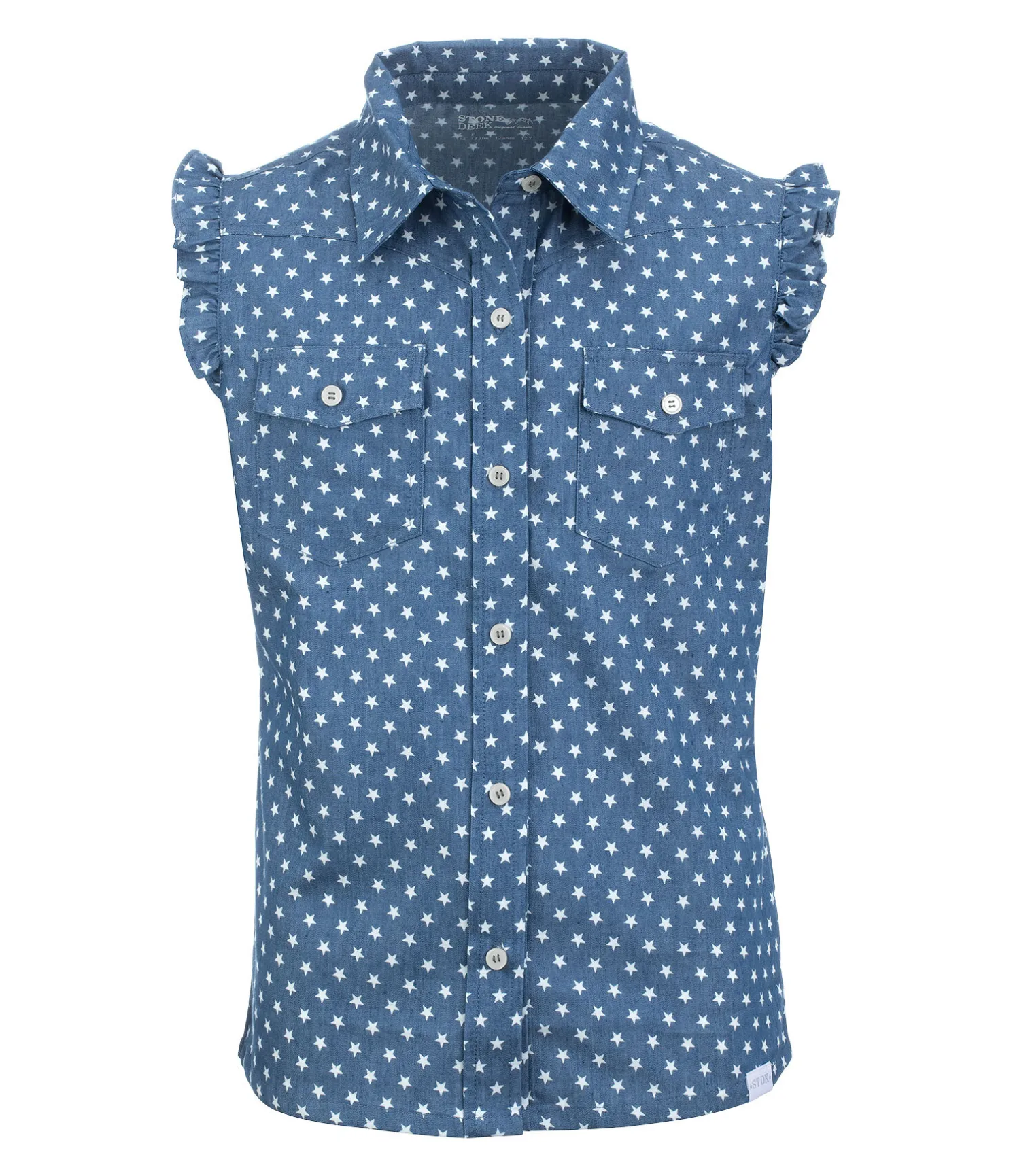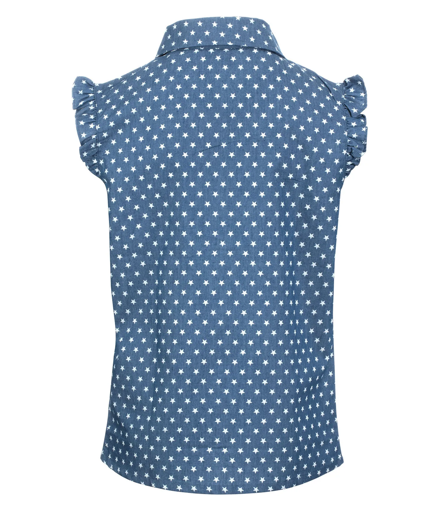 Jolie chemisier sans manches avec imprimé étoilé all-over et empiècement western. 2 poches poitrine. Respirante. 100 % coton.