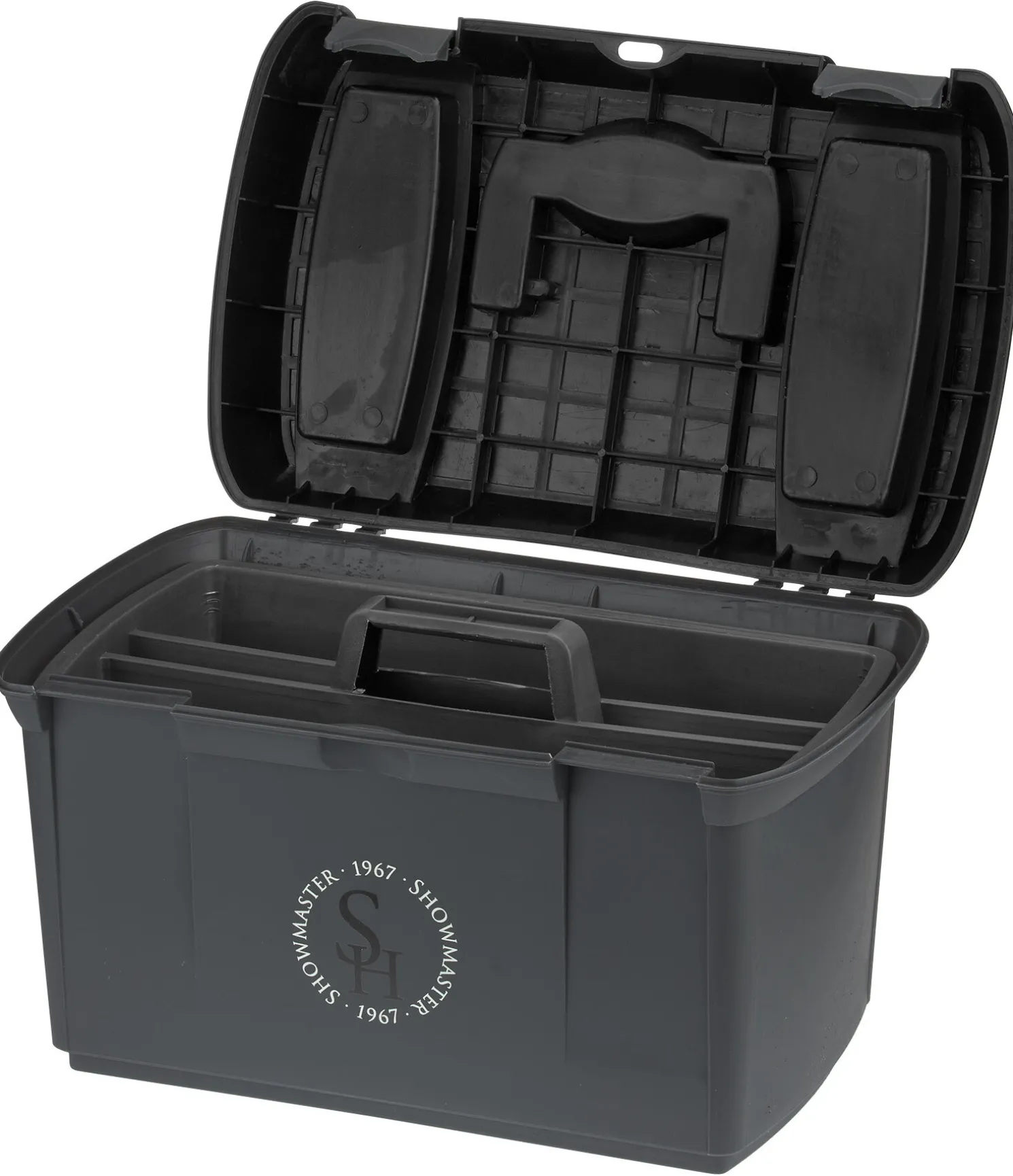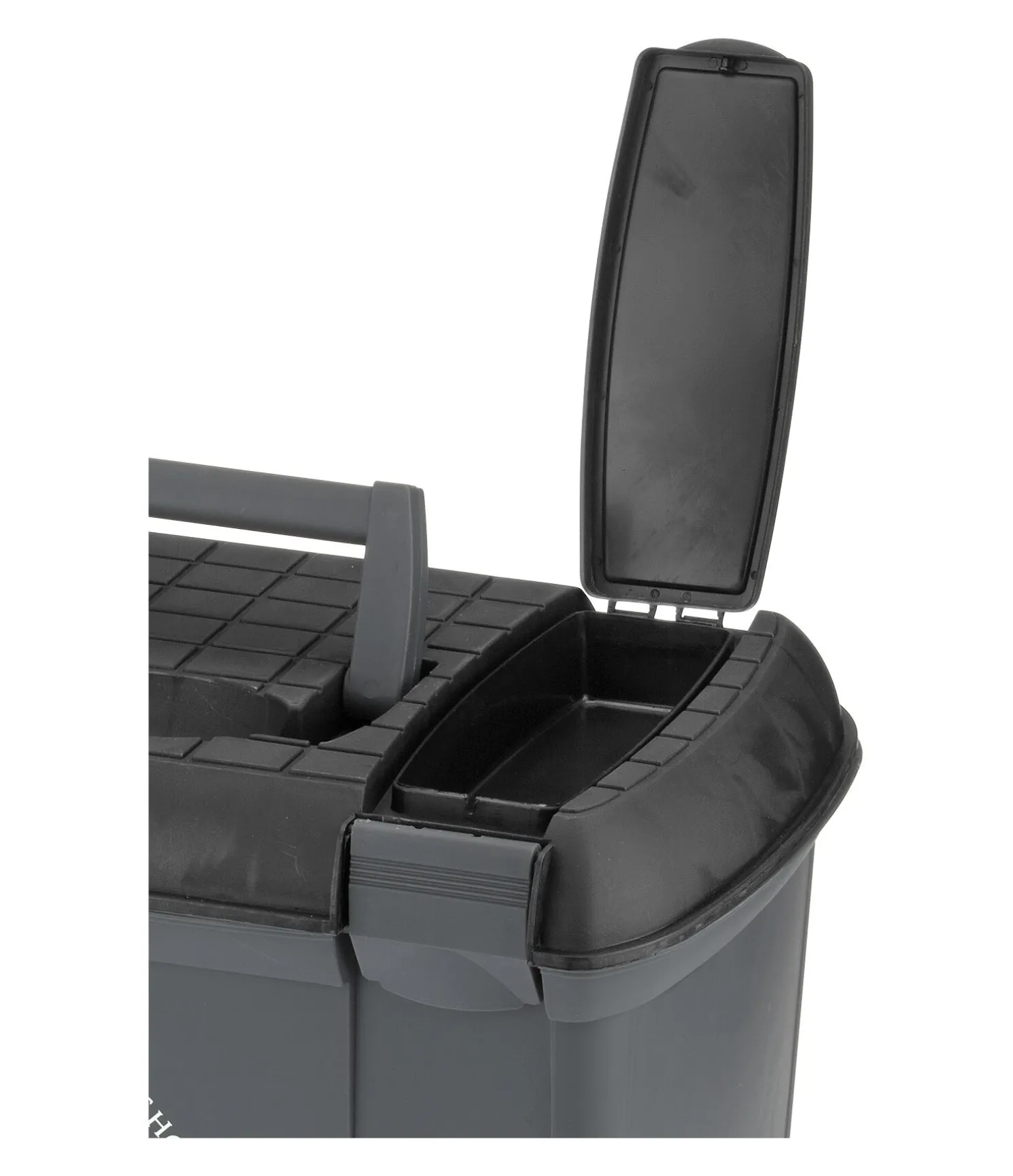 Coffre de pansage solide en plastique avec intérieur compartimenté. Compartiment pour petits accessoires amovible. Verrouillable. Cadenas non inclu. 39 x 25 x 25 cm.