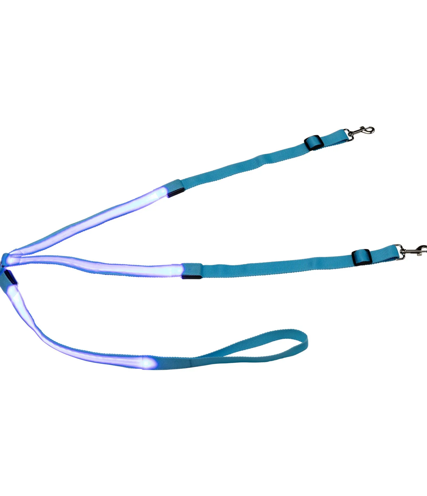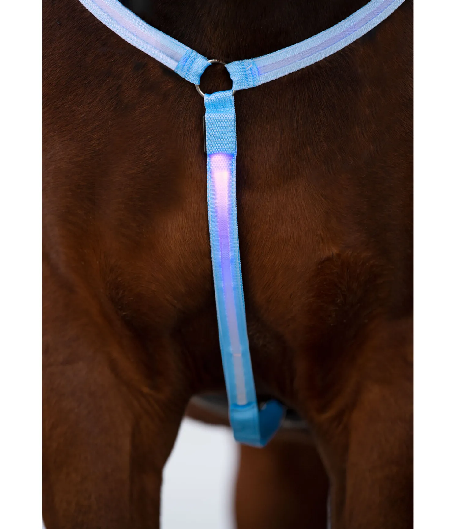 Collier de chasse lumineux fonctionnel avec boucle pour le fixer à la sangle et 2 mousquetons pour le fixer à la selle. 3 fonctions lumineuses différentes sur les 3 bandes concernées. Réglable de double-poney à cheval. Rechargeable par USB.