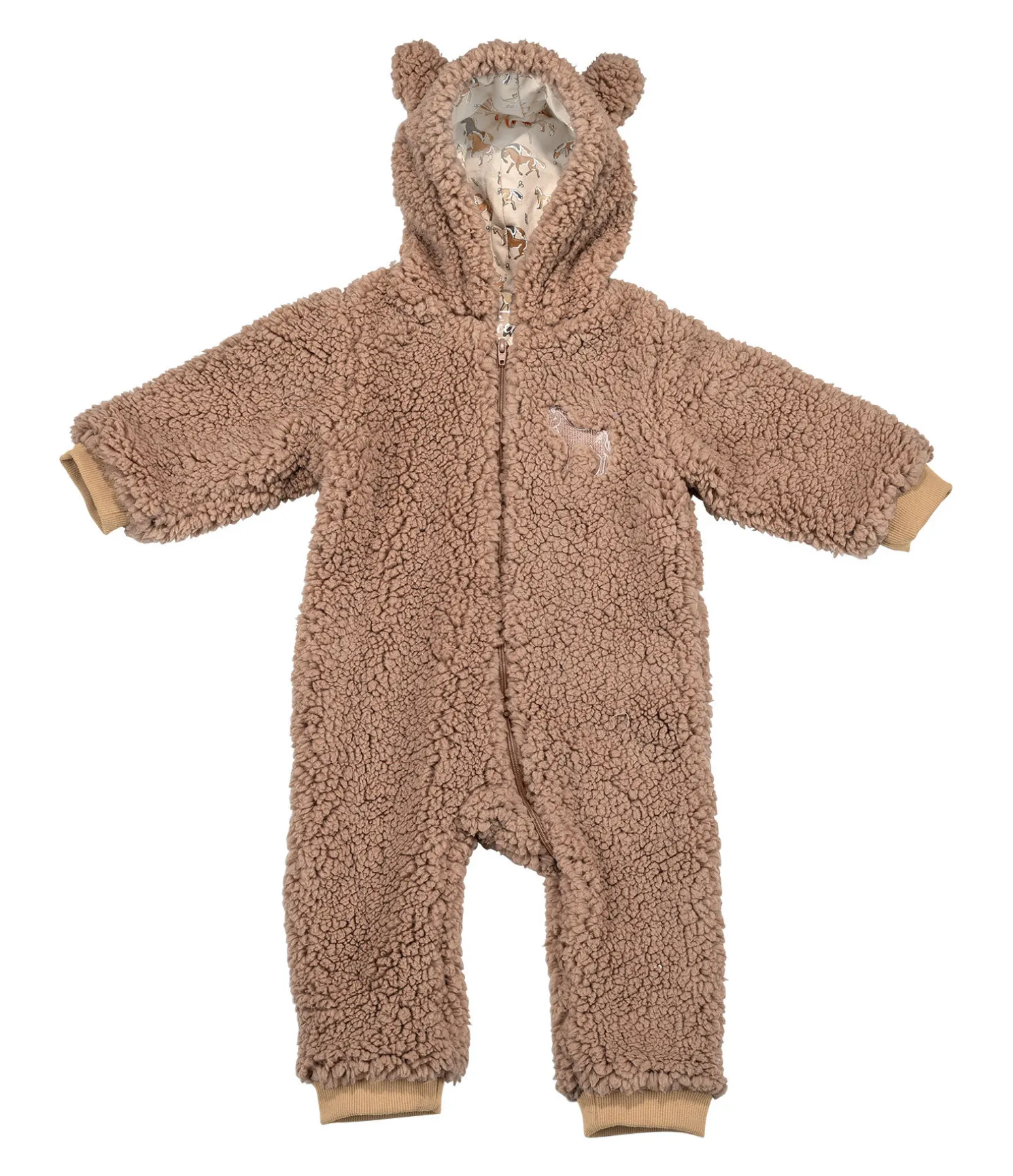 Combinaison douce et moelleuse avec capuche en polaire. Sur la capuche se trouvent des petites oreilles en peluche. La longue fermeture à glissière permet un enfilage facile. Finition en bord-côte sur les bas des manches et des jambes. Jolie broderie cheval sur la poitrine. Doublure intérieure avec imprimé all-over. 100 % polyester, doublure 100 % coton. Taille 3 = 62 / 68 ; taille 9 = 74 / 80 ; taille 18 = 86 / 92