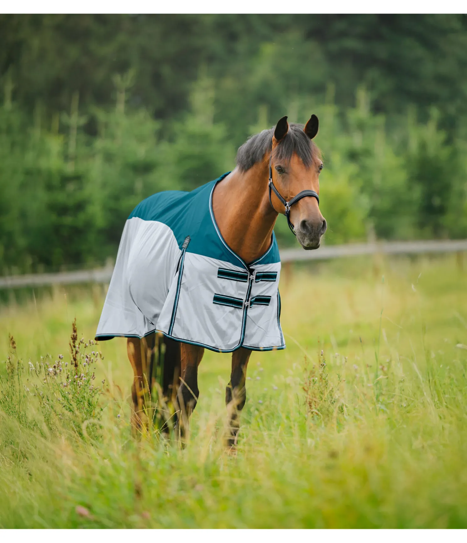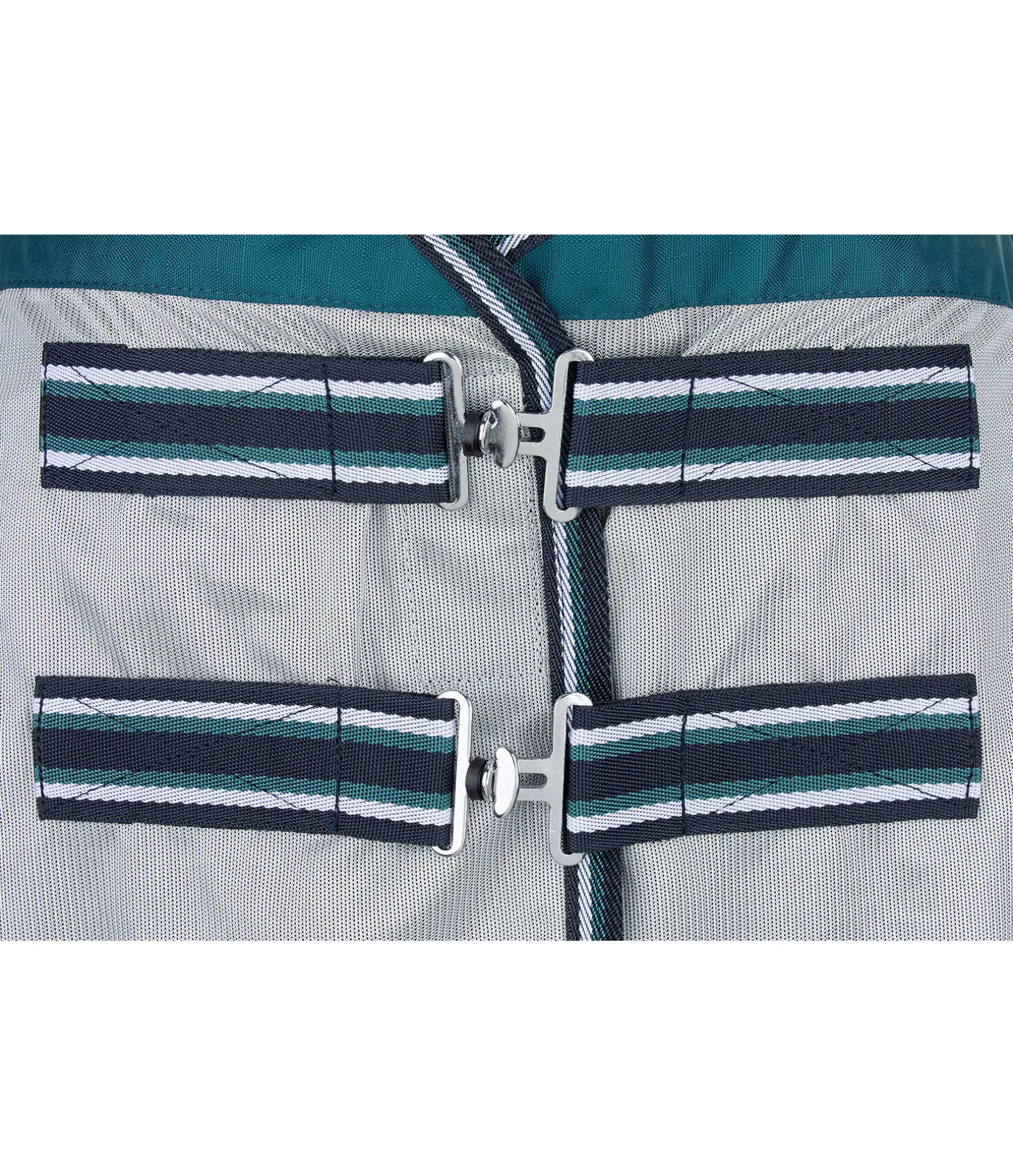Couverture de pluie imperméable et respirante en 600 deniers ripstop (colonne d’eau 3.000 mm, couture arrière soudée) avec empiècements latéraux en filet aéré à maille fine pour protéger des mouches même les jours de pluie. Protège efficacement la région des reins et le dos contre l’humidité et le vent. Plis d’aisance pour une liberté de mouvement optimale, double fermeture de poitrail à crochet en T avec patte auto-agrippante supplémentaire, sursangles croisées réglables et rabat de queue. Dispositif pour fixer les courroies de cuisse (courroies de cuisse non incluses) et courroie de queue réglable en longueur . Rembourrage au garrot pour éviter les points de pression et les irritations dues aux frottements. Doublure intérieure lisse et respectueuse de la robe. 100 % polyester. Notre conseil : ne pas hésiter à combiner avec l’extension de poitrail Kadir référence 422466.