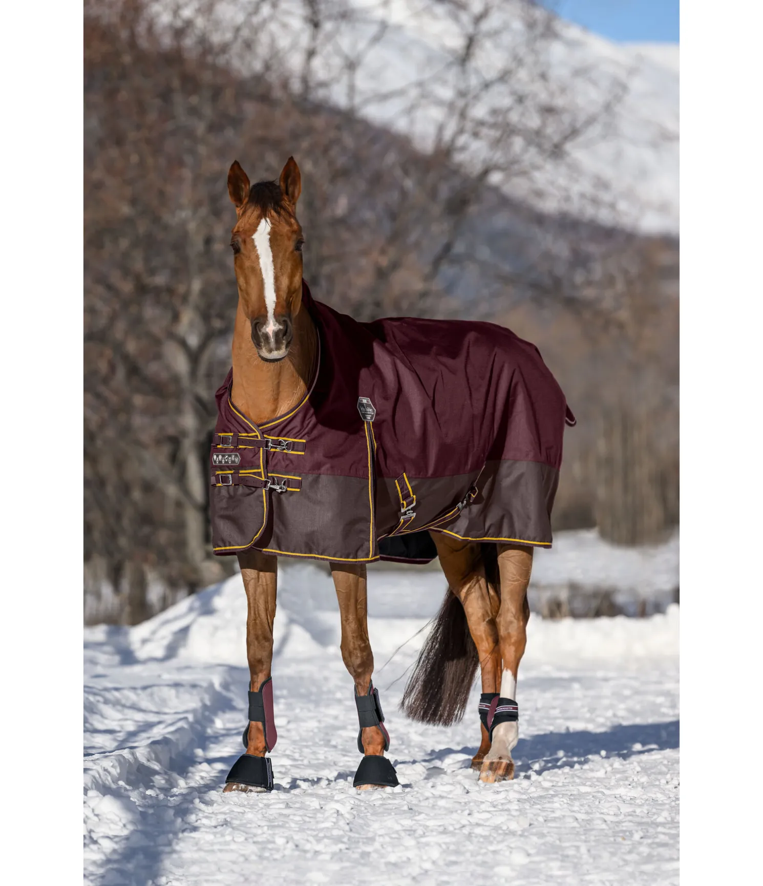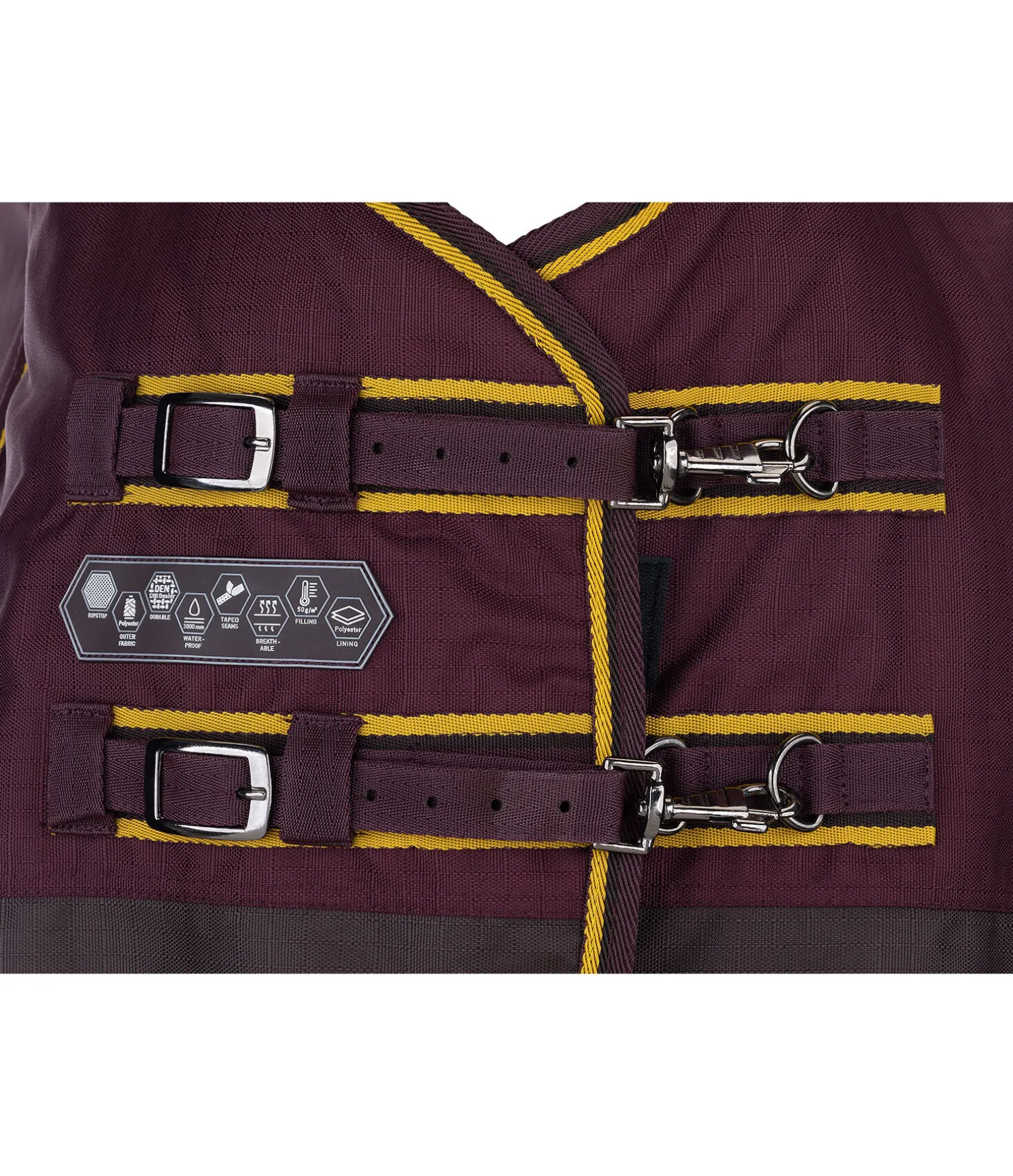 Couverture d’extérieur bicolore résistante et imperméable (3 000 mm) en matière Ripstop solide (1 200 deniers). Coussins au niveau du garrot pour le protéger et éviter les pressions. Garnissage 50 g léger. Doublure lisse protégeant la robe. Double fermeture de poitrail réglable avec mousquetons et patte auto-agrippante supplémentaire pour un maintien sûr. Grands plis d’aisance pour une liberté de mouvement optimale. Sursangles croisées, anneaux permettant de fixer des courroies de cuisses (non incluses) et courroie de queue réglable. 100 % polyester.