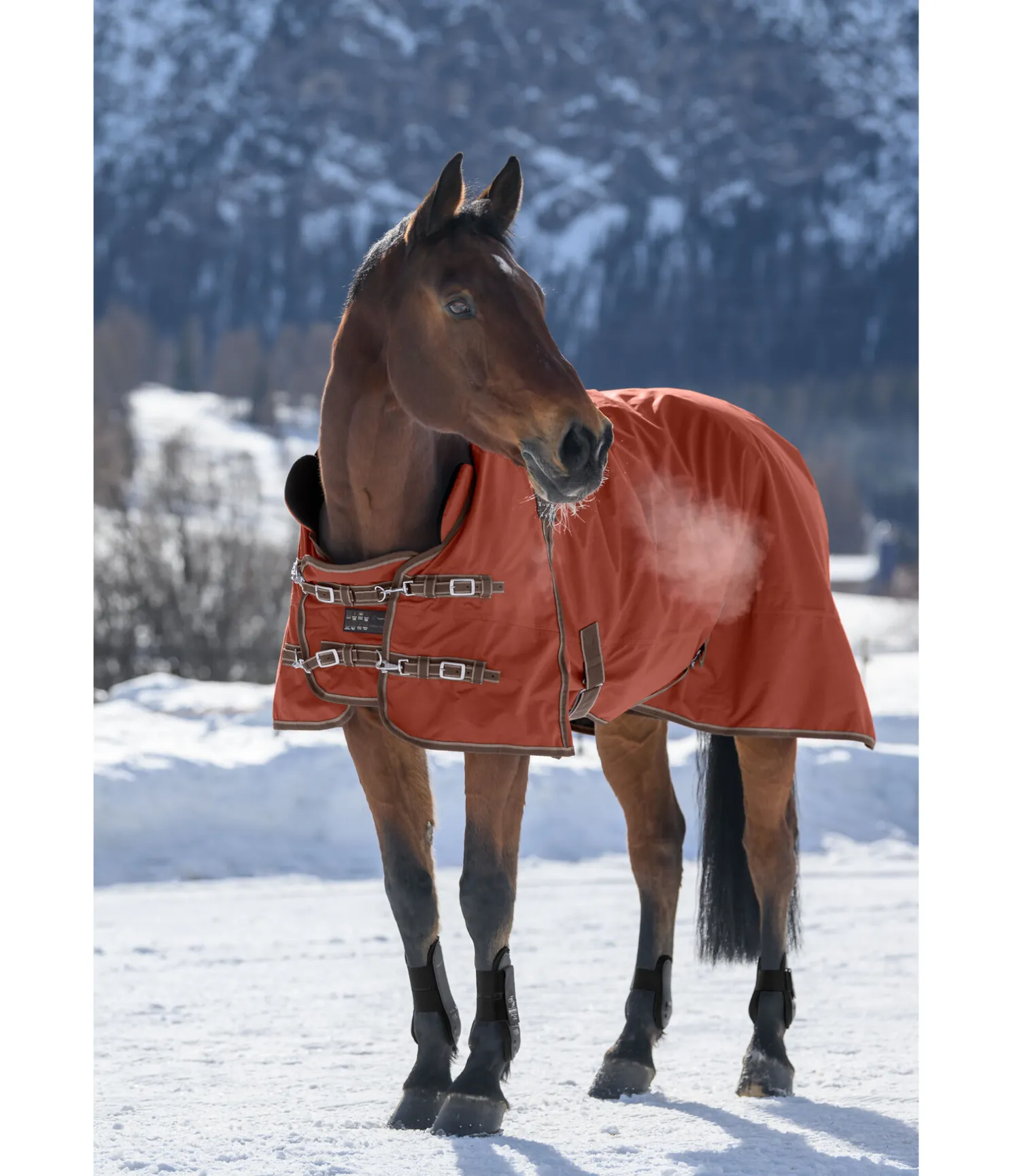 Couverture d’extérieur innovante dans une coupe Highneck, empêchant l’infiltration d’eau dans la zone des épaules et permettant d’éviter les pressions dans la zone du garrot. Coussins moelleux doublés de polaire de part et d’autre des épaules, permettant une répartition optimale des pressions lorsque le cheval baisse la tête. Matière Ripstop 600 deniers imperméable (colonne d’eau 3.000 mm) avec motifs en filigrane discrets. Garnissage 100g chaud. Doublure en polaire douce et doublure lisse protégeant la robe au niveau des épaules et du poitrail. Double fermeture de poitrail réglable avec mousquetons, anneaux en D et patte auto-agrippante supplémentaire, sursangles croisées réglables. Anneaux permettant la fixation de courroies de cuisses (non incluses), rabat de queue et courroie de queue réglable inclus. 100 % polyester.