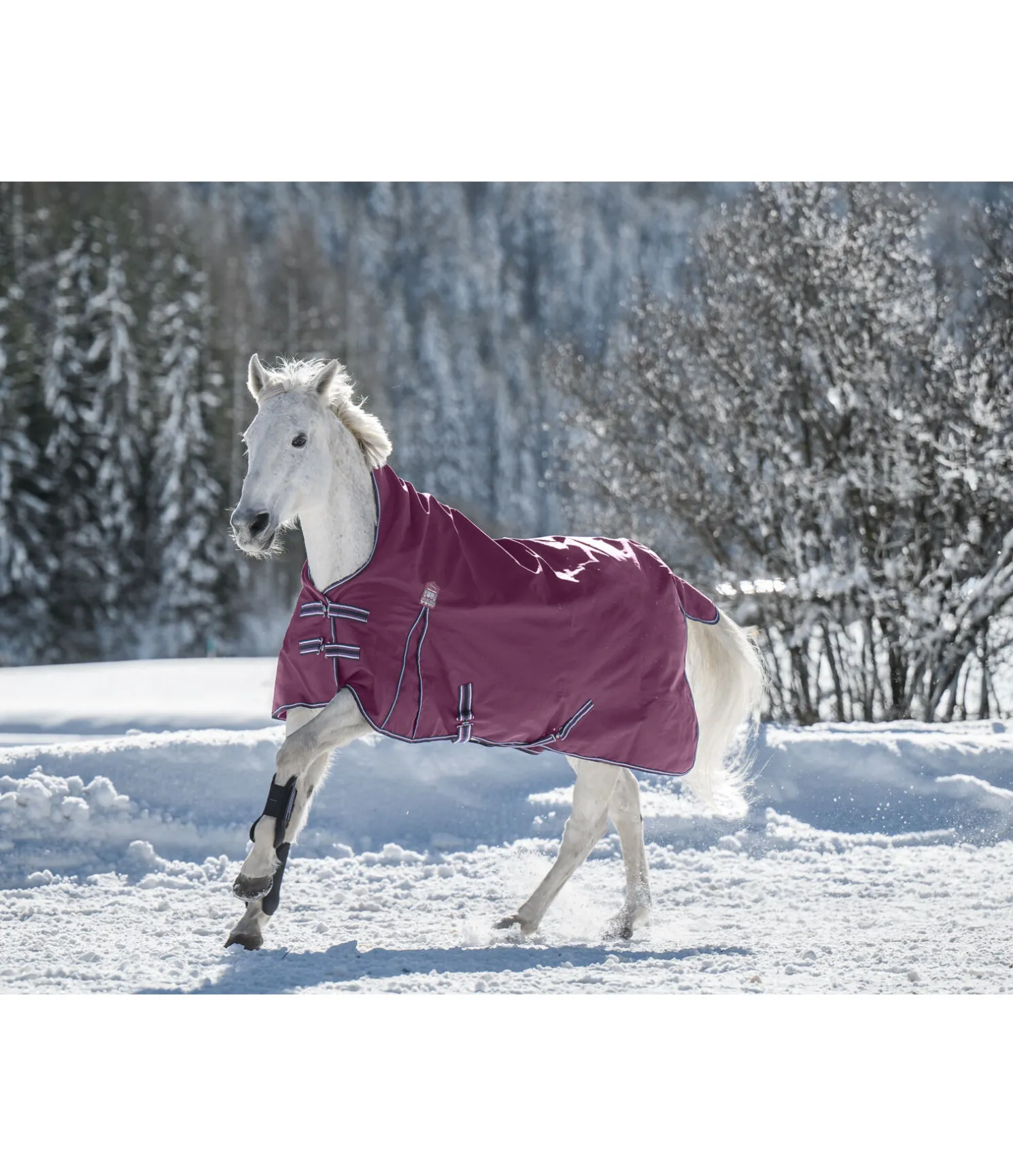 Couverture d’extérieur technique dans une coupe Highneck. Imperméable (3.000 mm). Matière Ripstop 600 deniers avec garnissage 200 g. La coupe moderne Highneck empêche l’infiltration d’eau au niveau des épaules et protège ainsi de manière fiable en cas de forte averse. Elle permet également d’éviter les pressions au niveau du garrot. Avec plis d’aisance pour une liberté de mouvement optimale, double fermeture de poitrail avec crochets en T et patte auto-agrippante supplémentaire, sursangles croisées réglables et rabat de queue. Anneaux permettant la fixation de courroies de cuisses (non incluses), courroie de queue réglable incluse. Doublure lisse protégeant la robe. 100 % polyester.
