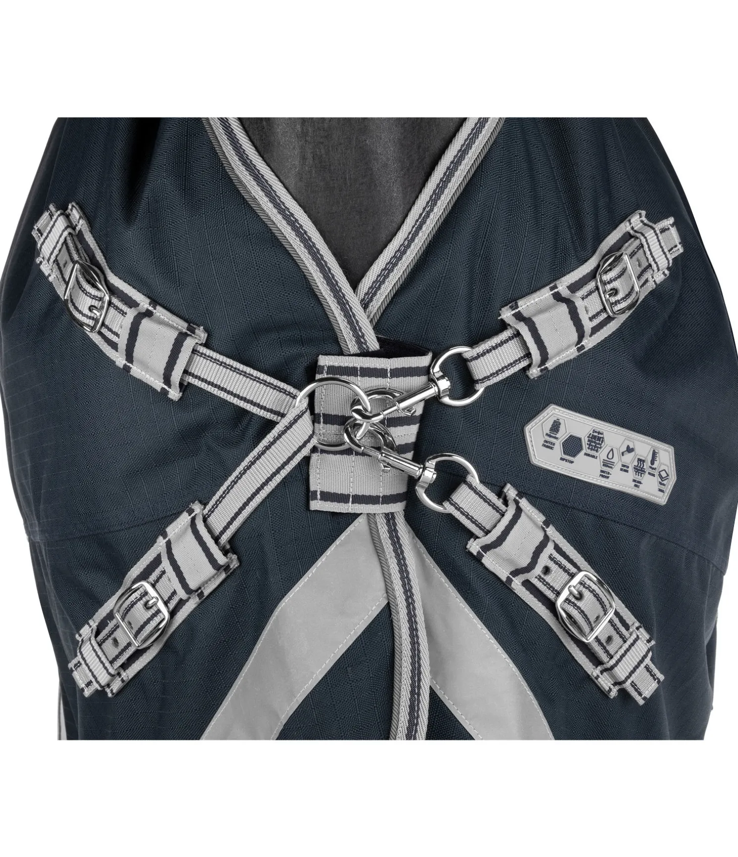 Chemise d’extérieur de grande qualité dans une coupe Highneck protectrice, en matière Ripstop 1.200 deniers particulièrement imperméable (5.000 mm), qui protège efficacement en cas d’averse. Garnissage 100g chaud. Les nombreux éléments réfléchissants tels que le passepoil en bordure et les bandes sur le poitrail, l’arrière-main et le rabat de queue assurent une bonne visibilité et une sécurité optimale. Double fermeture de poitrail équilibrée en plusieurs points avec patte auto-agrippante supplémentaire, sursangles croisées réglables. Doublure lisse protégeant la robe. Anneaux permettant la fixation de courroies de cuisses (non incluses). Rabat de queue et courroie de queue réglable. 100 % polyester.