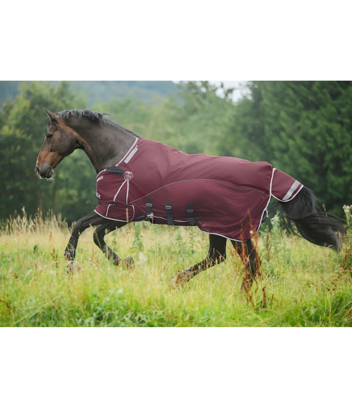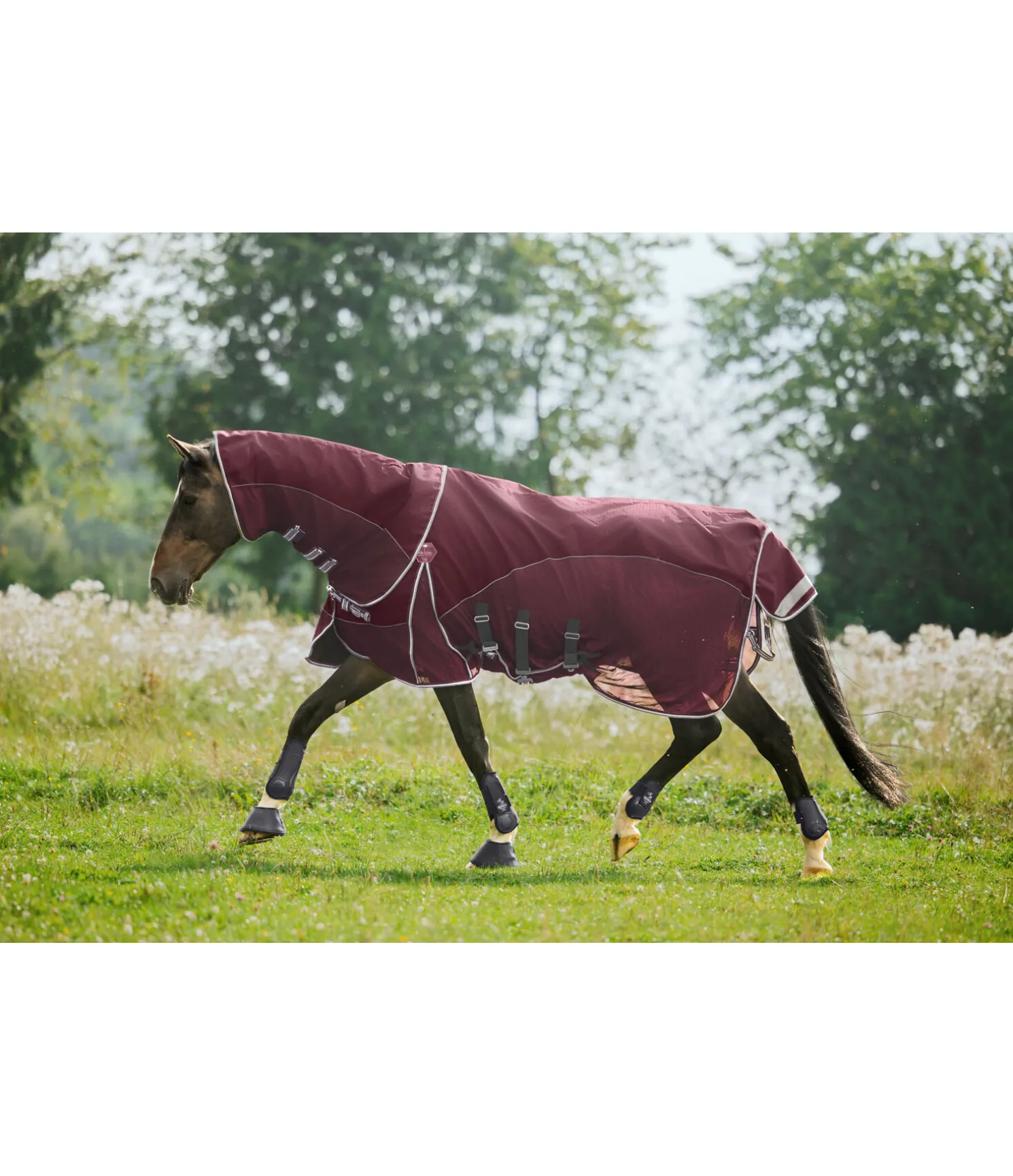 Notre collection Perfect Fit est enfin disponible en couverture anti-mouches combinée avec dos imperméable et mesh aéré sur les côtés. Couvre-cou amovible qui se ferme en toute sécurité grâce à trois pattes auto-agrippantes. La partie dorsale imperméable est en matériau Oxford 1.200D respirant et robuste (3.000 mm, coutures soudées) et est complétée par une matière mesh à mailles serrées pour une protection optimale contre les mouches. Cette couverture est idéale pour une utilisation lors des journées d’été changeantes ou pour la mi-saison, lorsque les nuits sont déjà fraîches mais que les journées sont encore très chaudes. Le dos sensible du cheval reste ainsi protégé de manière optimale, sans que le cheval ne surchauffe. Autre point fort de cette couverture, le rabat ventral peut être fermé par 3 crochets en T élastiques. L’empiècement élastiqué en softshell déperlant assure un ajustement parfait, une liberté de mouvement optimale, même au pré, et enlève à la couverture les points de pression indésirables. La double fermeture de poitrail réglable est équilibrée en plusieurs points et sa patte auto-agrippante supplémentaire maintient la couverture en place de manière fiable. Si nécessaire, les mousquetons peuvent être facilement remplacés. Bandes réfléchissantes sur le rabat de queue pour une visibilité optimale. Doublure douce pour les crins au niveau des épaules, de la crinière et du dos, ainsi qu’au niveau du rabat de queue, pour une robe brillante et une protection contre la casse des crins. Courroie de queue réglable. 100 % polyester.