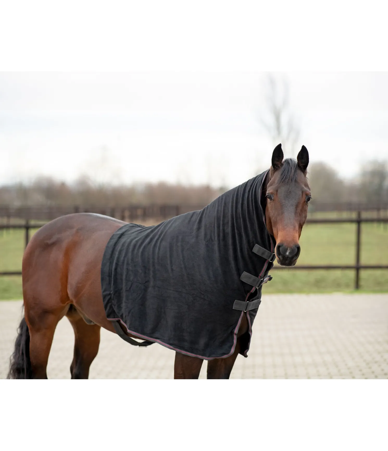 Couvre-cou respirant en polaire douce. Idéal pour les chevaux qui transpirent beaucoup de l’encolure. À combiner avec une chemise séchante ou à utiliser seul. 3 fermetures à l’avant et sangle ventrale pour un maintien optimal. 100 % polyester.