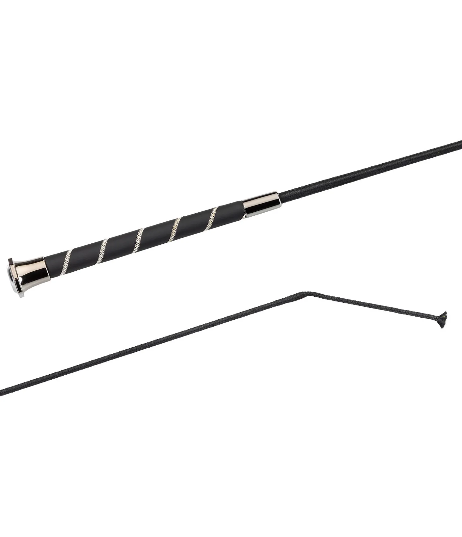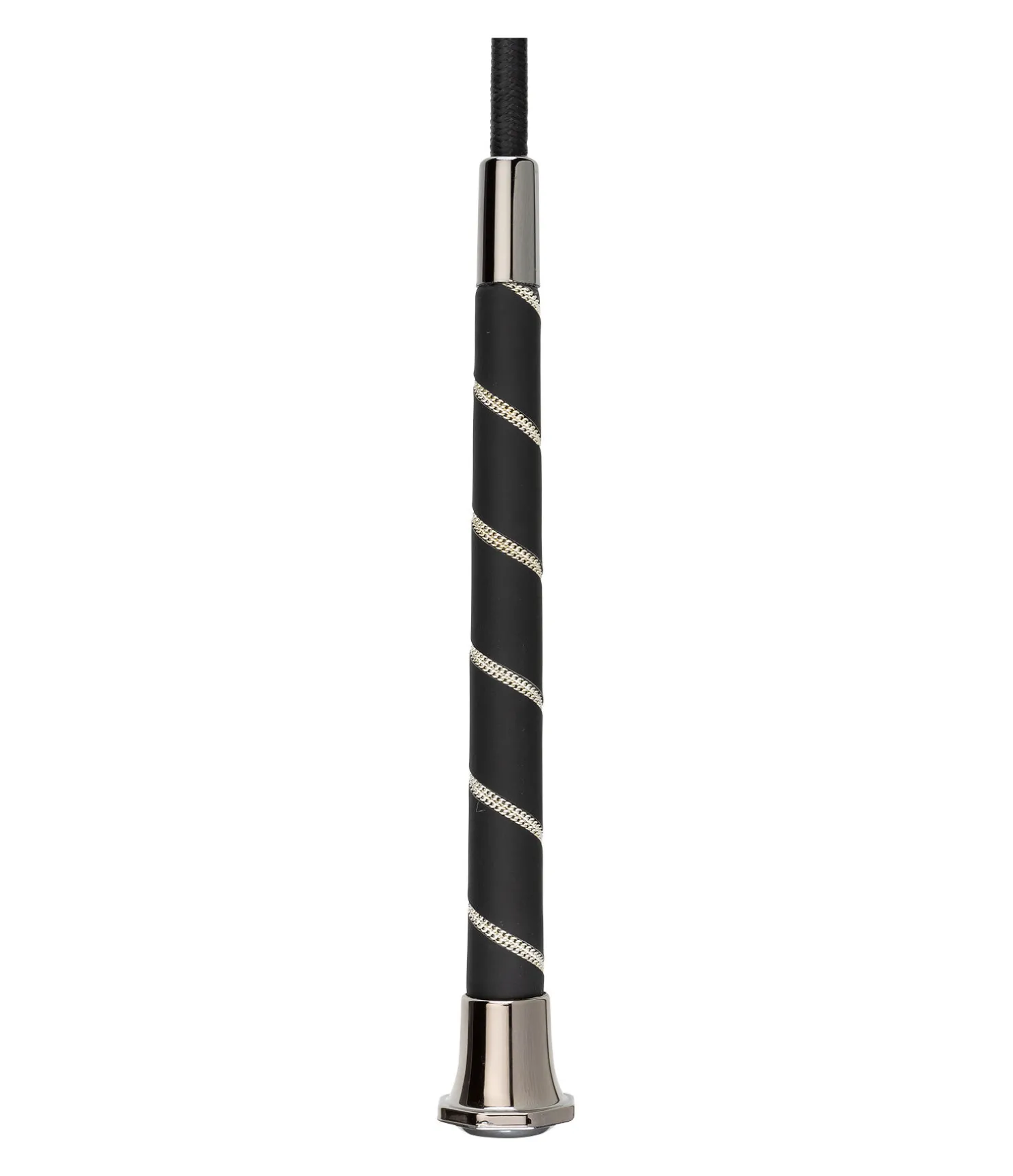 Cravache de dressage élégante avec poignée décorée d’un cordon torsadé argenté. Pommeau hexagonal avec badge logo. Tige en fibre de verre avec revêtement en nylon.