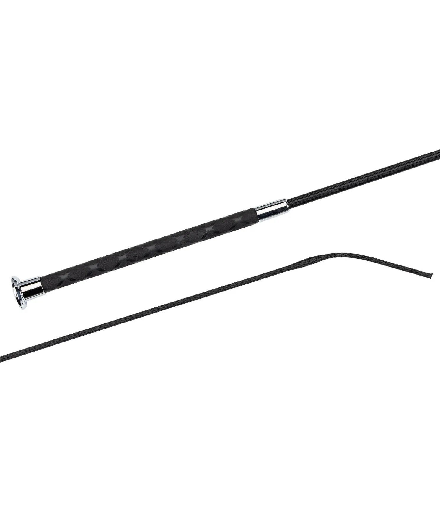 Cravache de dressage avec motifs sur la poignée. Tige en fibre de verre recouverte de nylon.