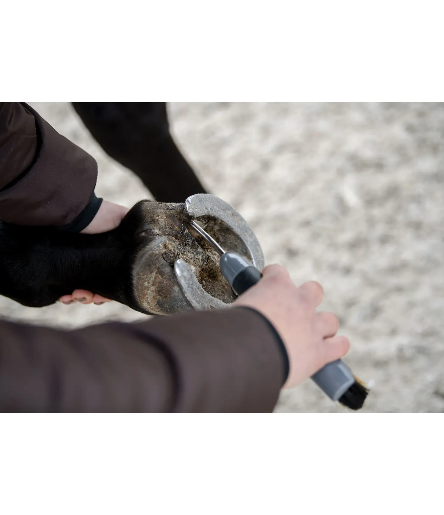 Cure-pied robuste avec poils métalliques et synthétiques. Les poils métalliques permettent d’enlever les saletés tenaces ou incrustées dans le sabot. La poignée antidérapante en caoutchouc permet une bonne prise en main. 22 cm.