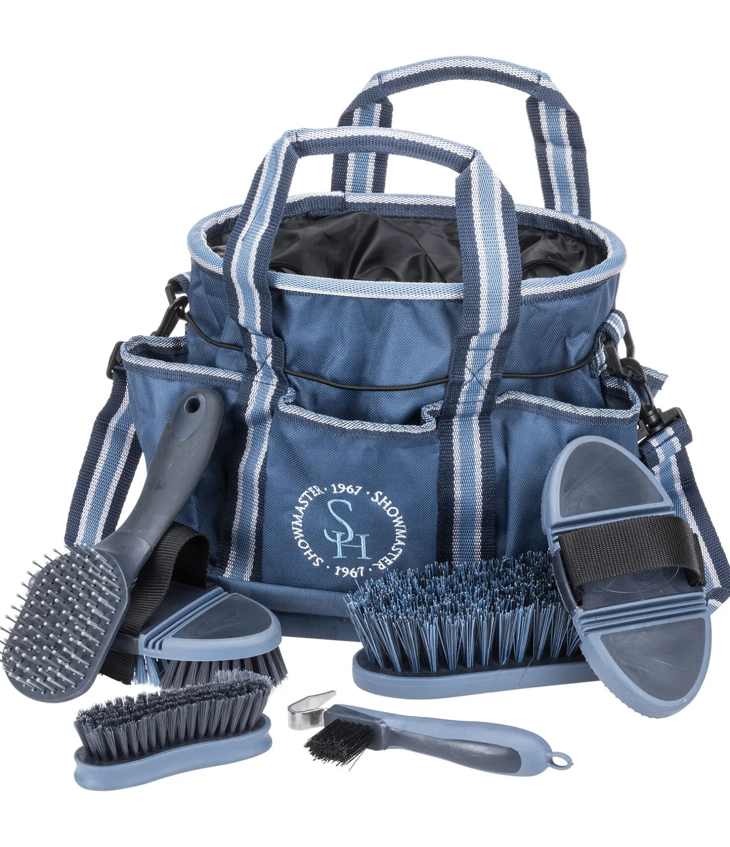Ensemble composé d’un sac de pansage en tissu anti-taches contenant : brosse de pansage, bouchon, brosse pour sabots, brosse douce, brosse pour crinière et queue, cure-pieds. Sac de pansage avec 6 poches extérieures, 2 anses et une bandoulière amovible. Refermable par le haut au moyen d’un cordon de serrage. 28 x 18 x 25 cm.