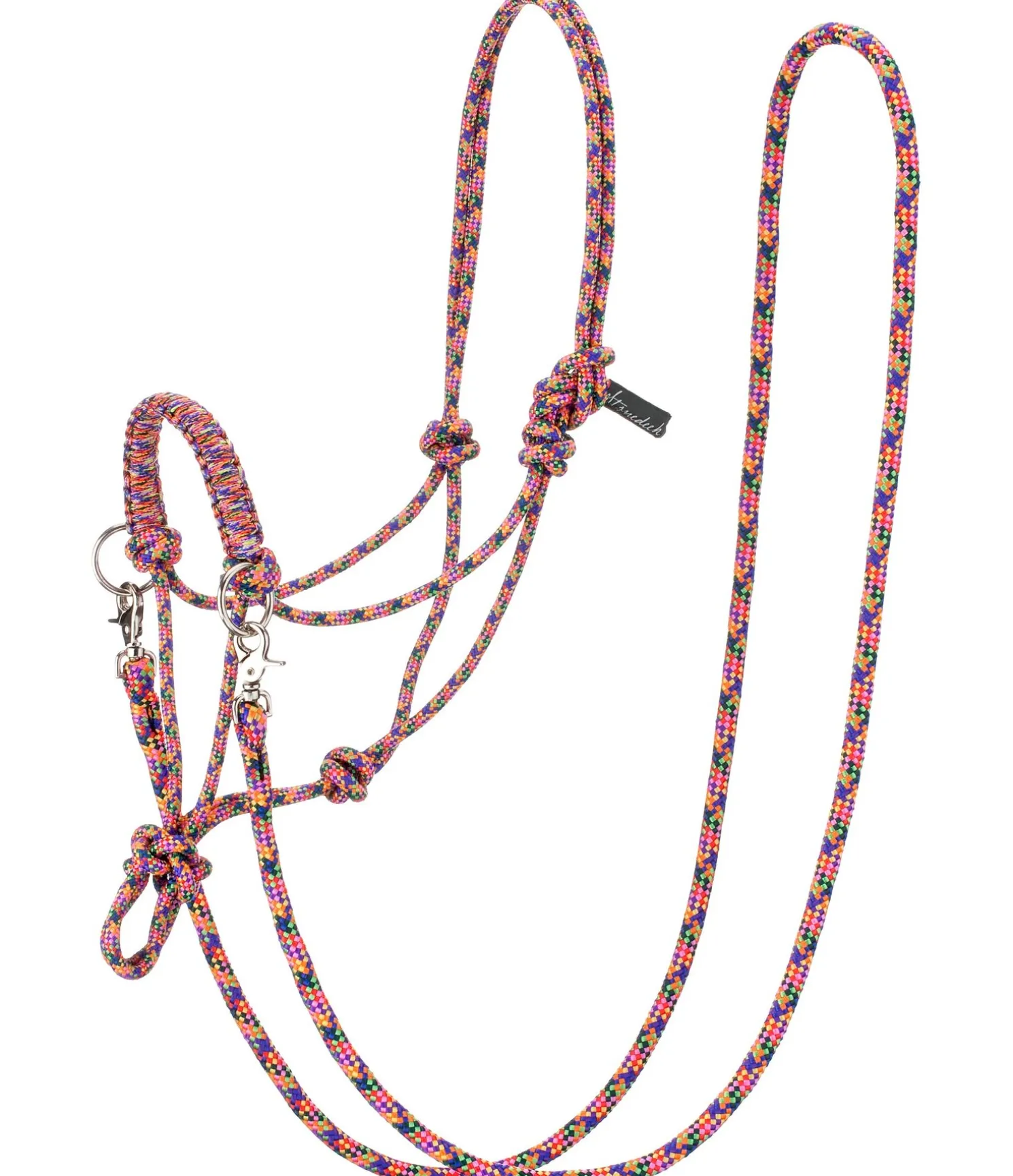 Licol à noeuds haut de gamme. Pour le travail au sol ou monté. En matière souple et résistante. Avec anneaux pour les rênes et muserolle tressée. Épaisseur de la corde 8 mm. Livré avec rênes à mousquetons et longe assorties. Longueur des rênes, mousquetons compris 2,6 m, épaisseur des rênes et de la longe 16 mm. Longueur de la longe 2,4 m.