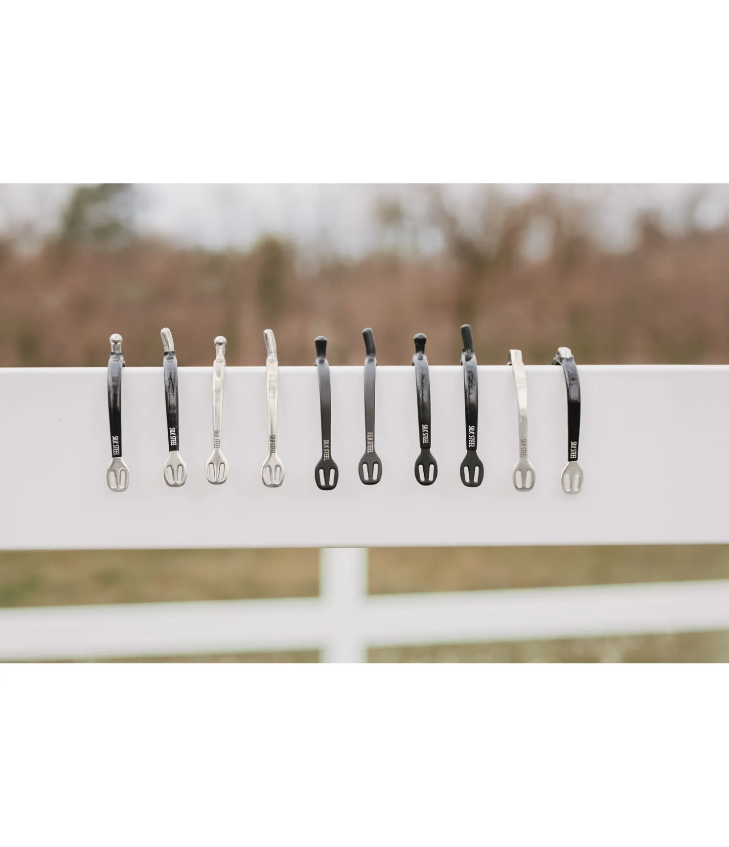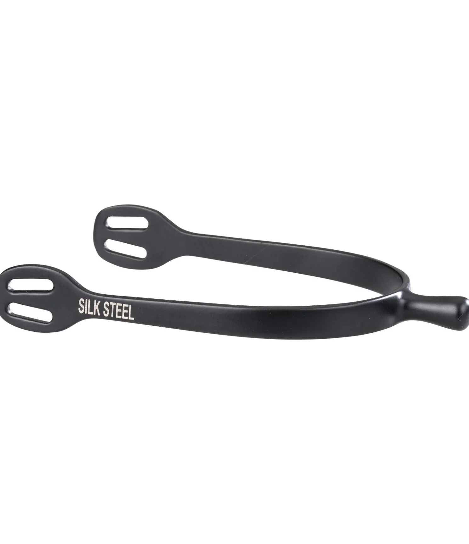 Éperons à bout rond en acier inoxydable noir mat avec logo SILK STEEL gravé. Forme améliorée des oeillets pour faciliter le passage des lanières. Longueur de tige 20 mm.