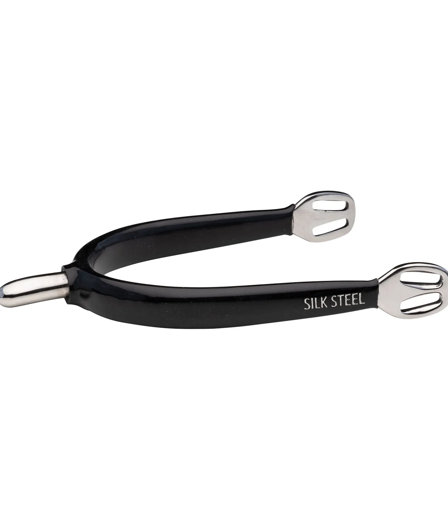 Éperons en acier inoxydable. Forme améliorée des oeillets facilitant le passage des lanières. Revêtement en silicone avec inscription SILK STEEL. Tige d’éperon légèrement arrondie.