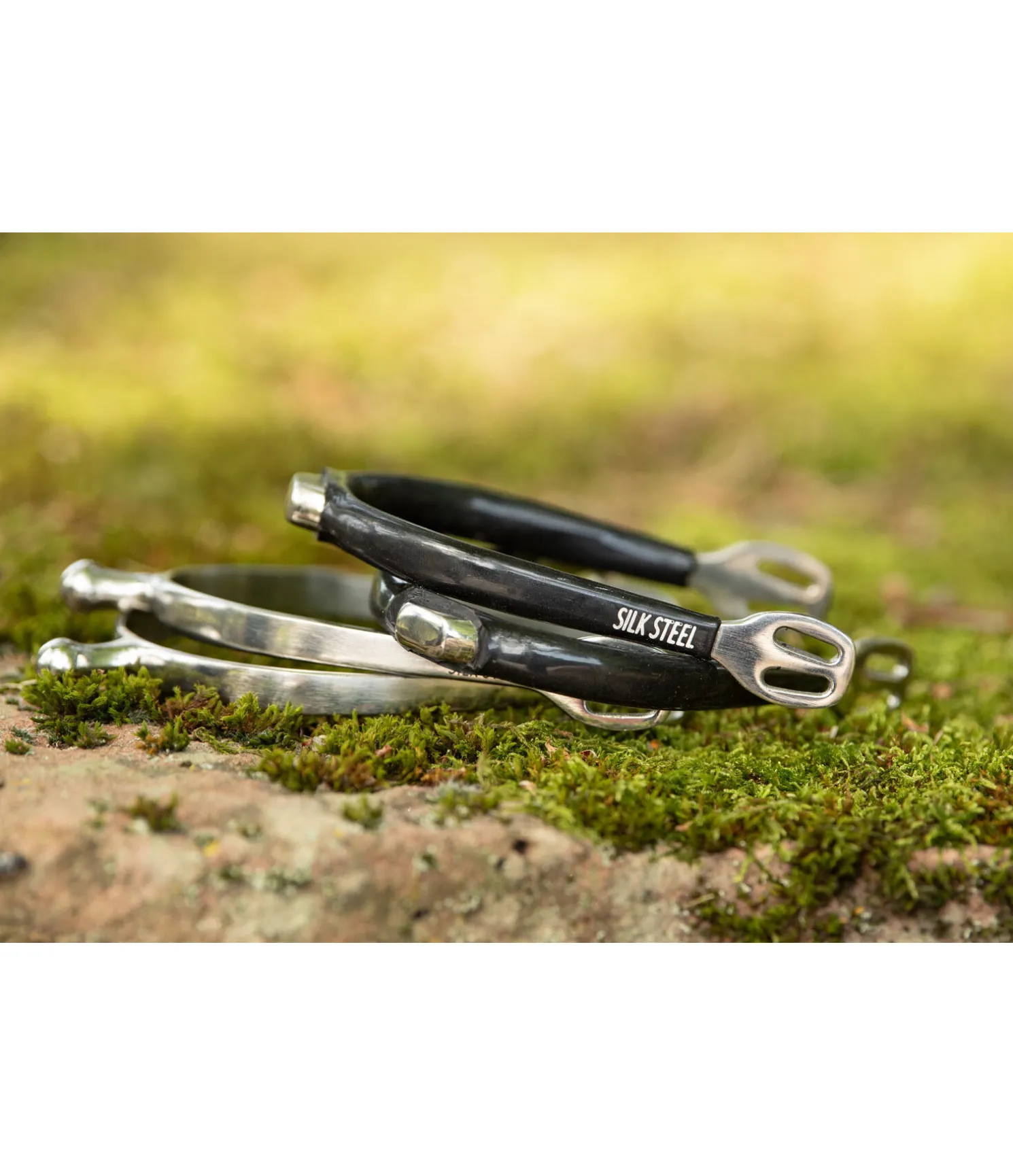 En acier. Revêtement en silicone avec inscription SILK STEEL. Tige de 10 mm de long, parfait pour habituer le cheval et le cavalier. Passants de lanière obliques pour empêcher tout glissement.