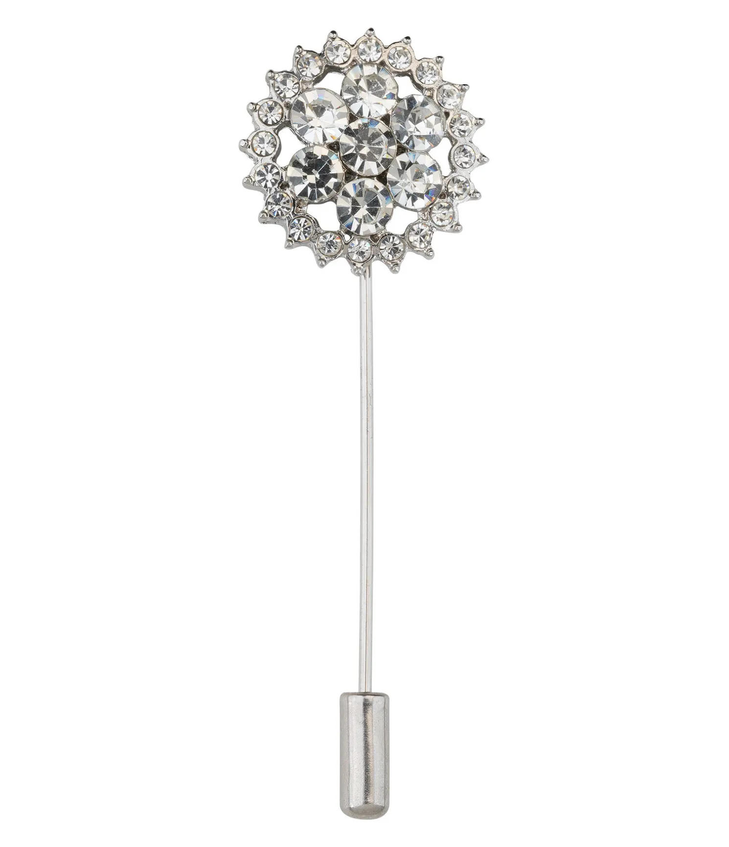 Épingle de plastron avec des pierres scintillantes argentées agencées en forme de fleur.
