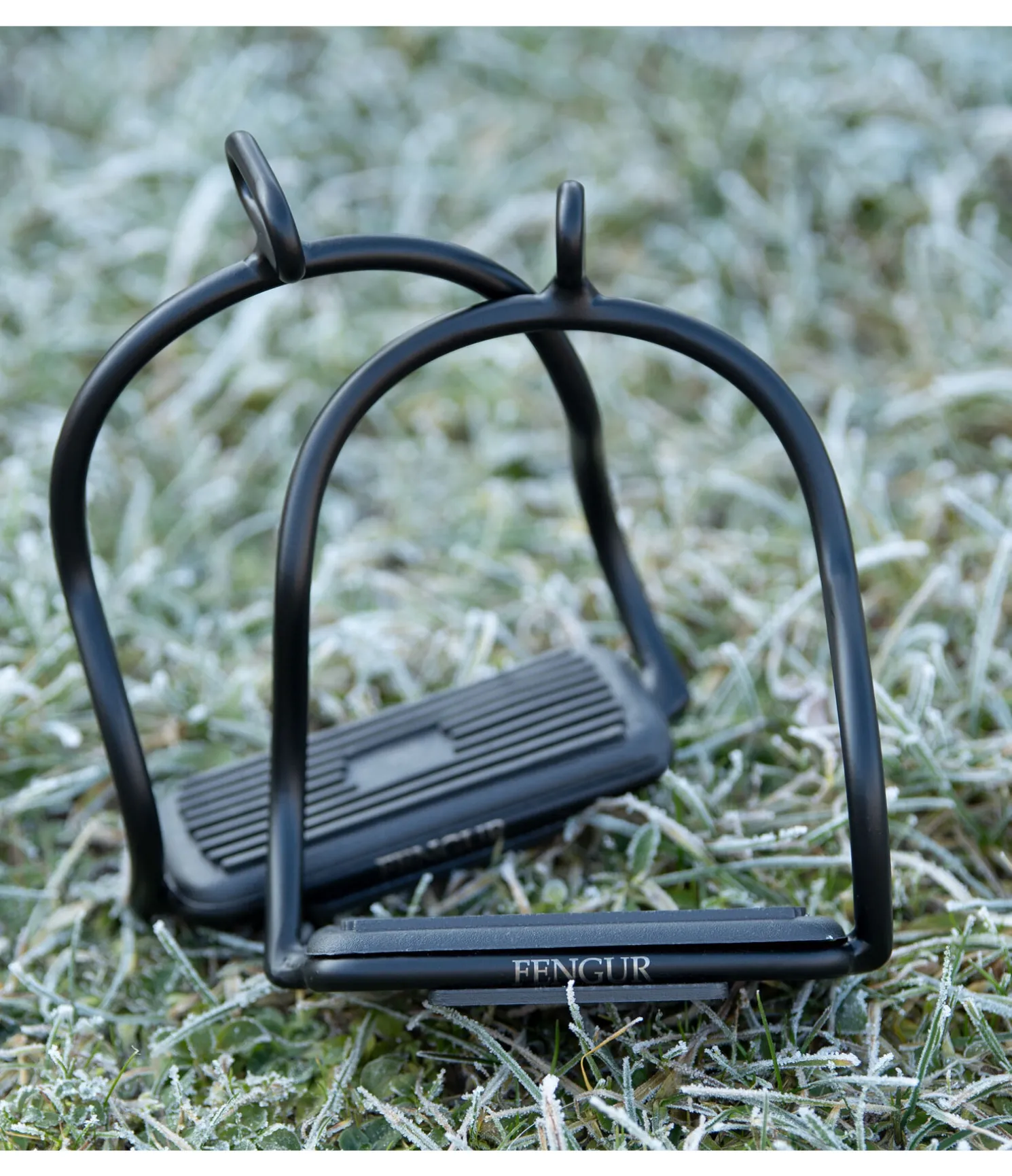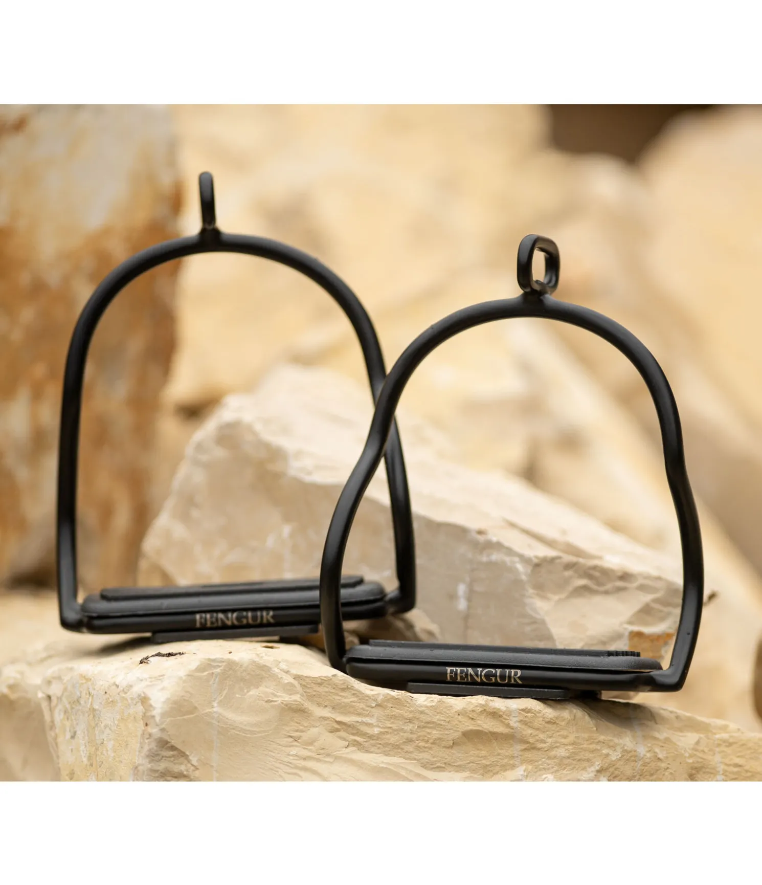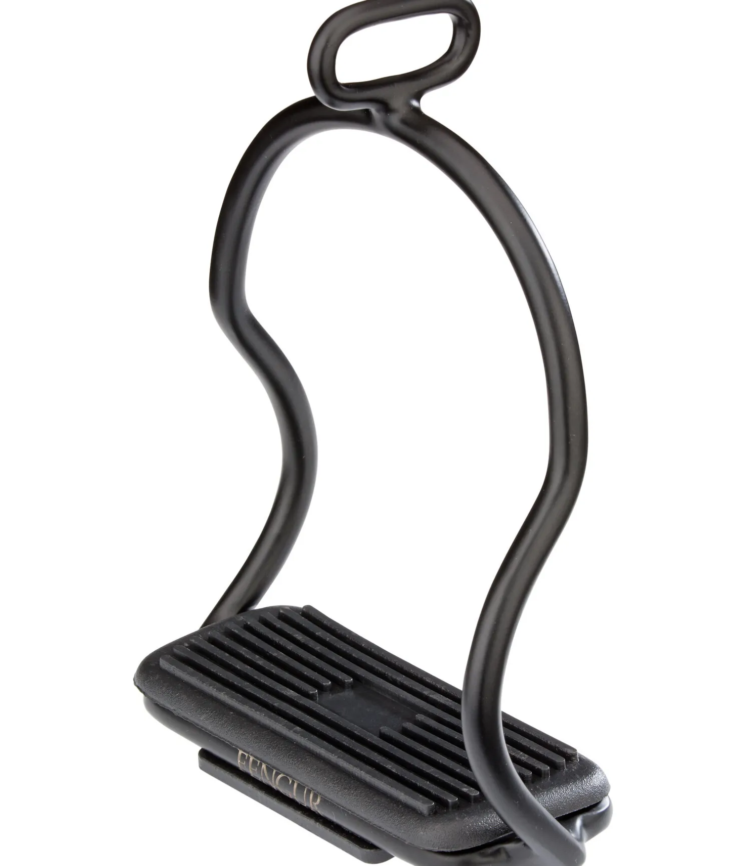 Étriers de sécurité en S en acier inoxydable. L’oeil tourné à 90° et la forme en S des branches permettent au cavalier de se dégager rapidement des étriers en cas de chute. Revêtement par poudre noir et semelles d’étriers en caoutchouc antidérapantes.