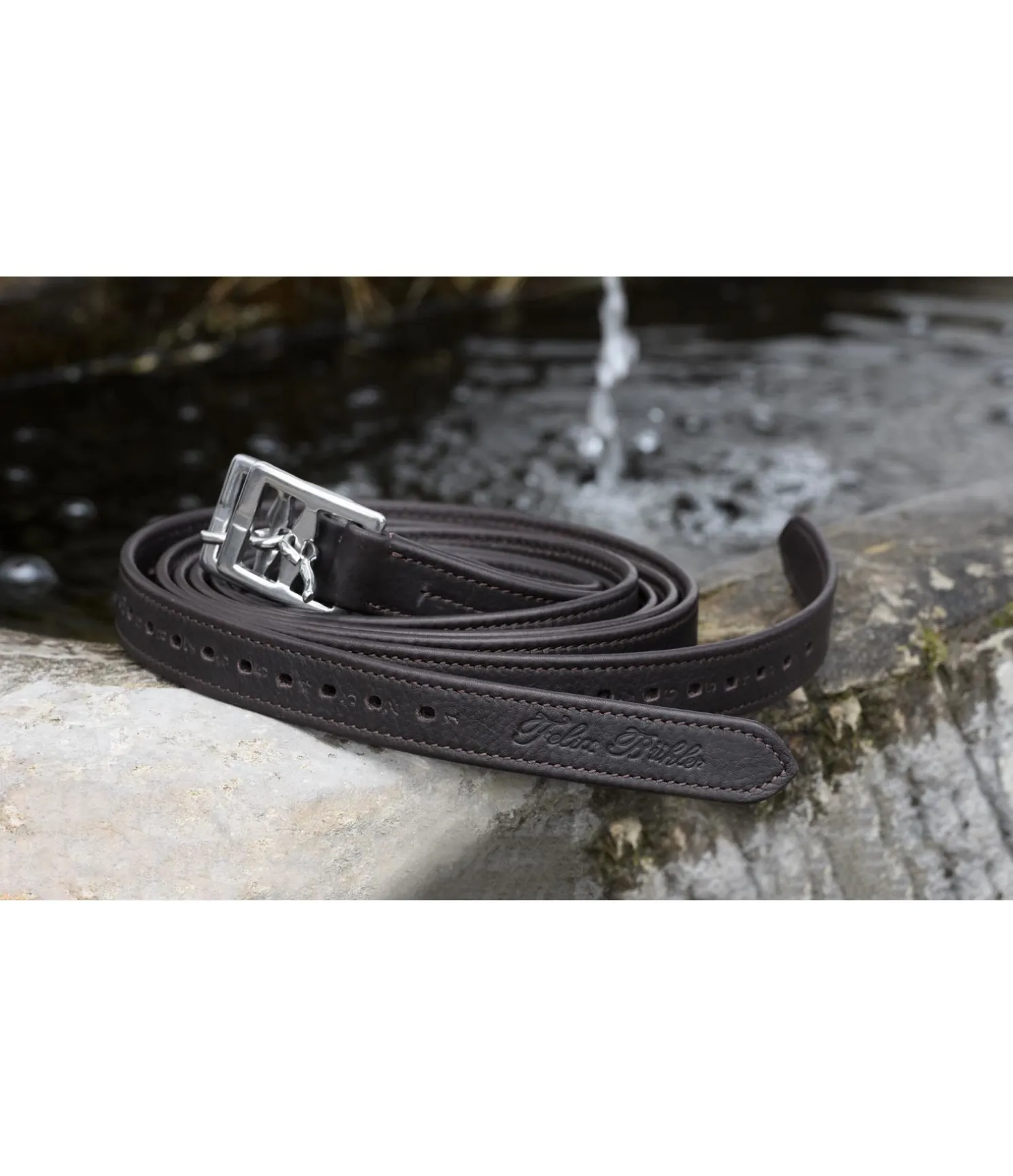 Étrivières de grande qualité en cuir de veau souple ciré. Extrêmement résistantes à la déchirure grâce à une coeur en nylon. Boucles argentées en acier inoxydable légèrement incurvées. Largeur 2,5 cm. Vendues par paire.