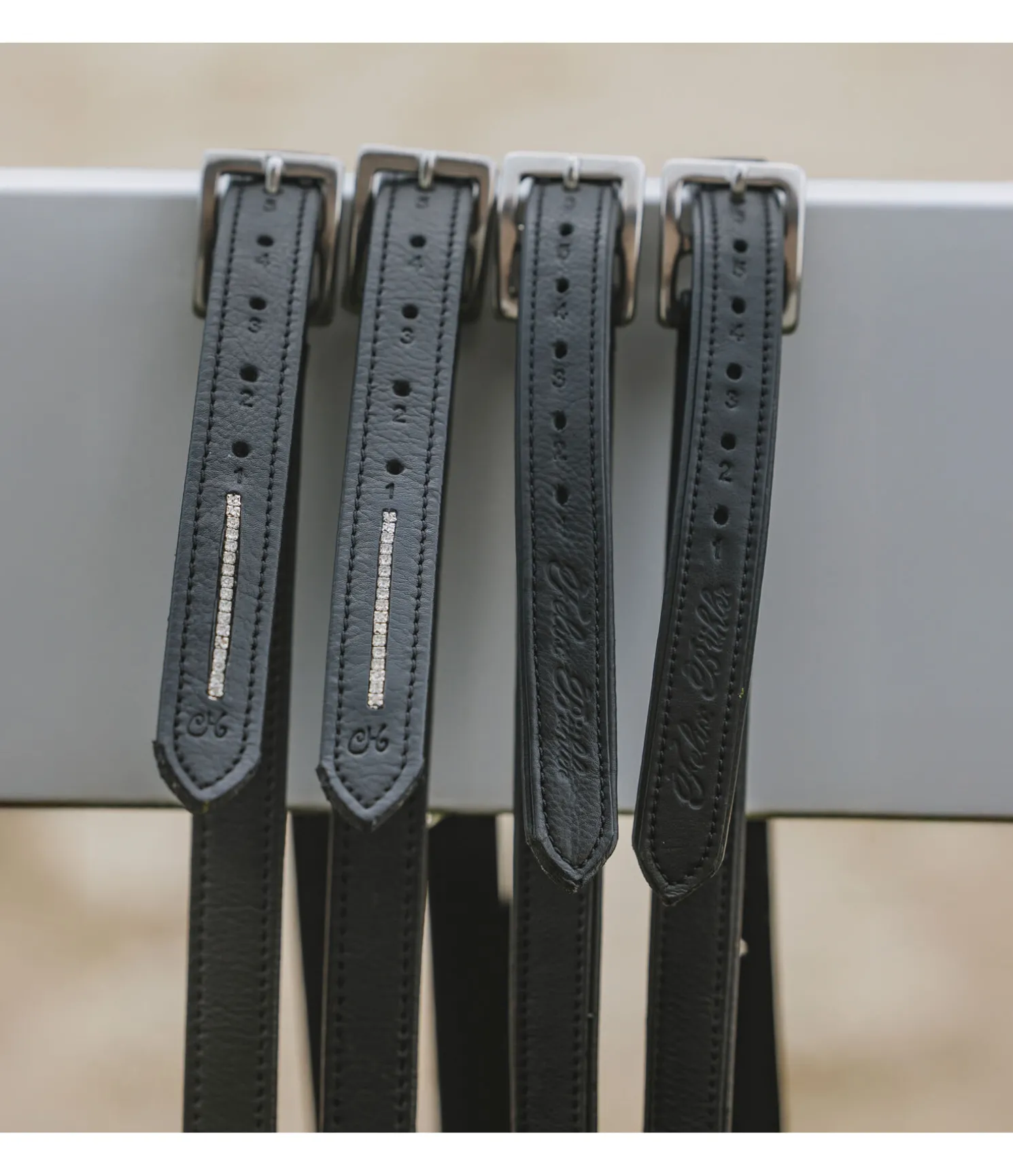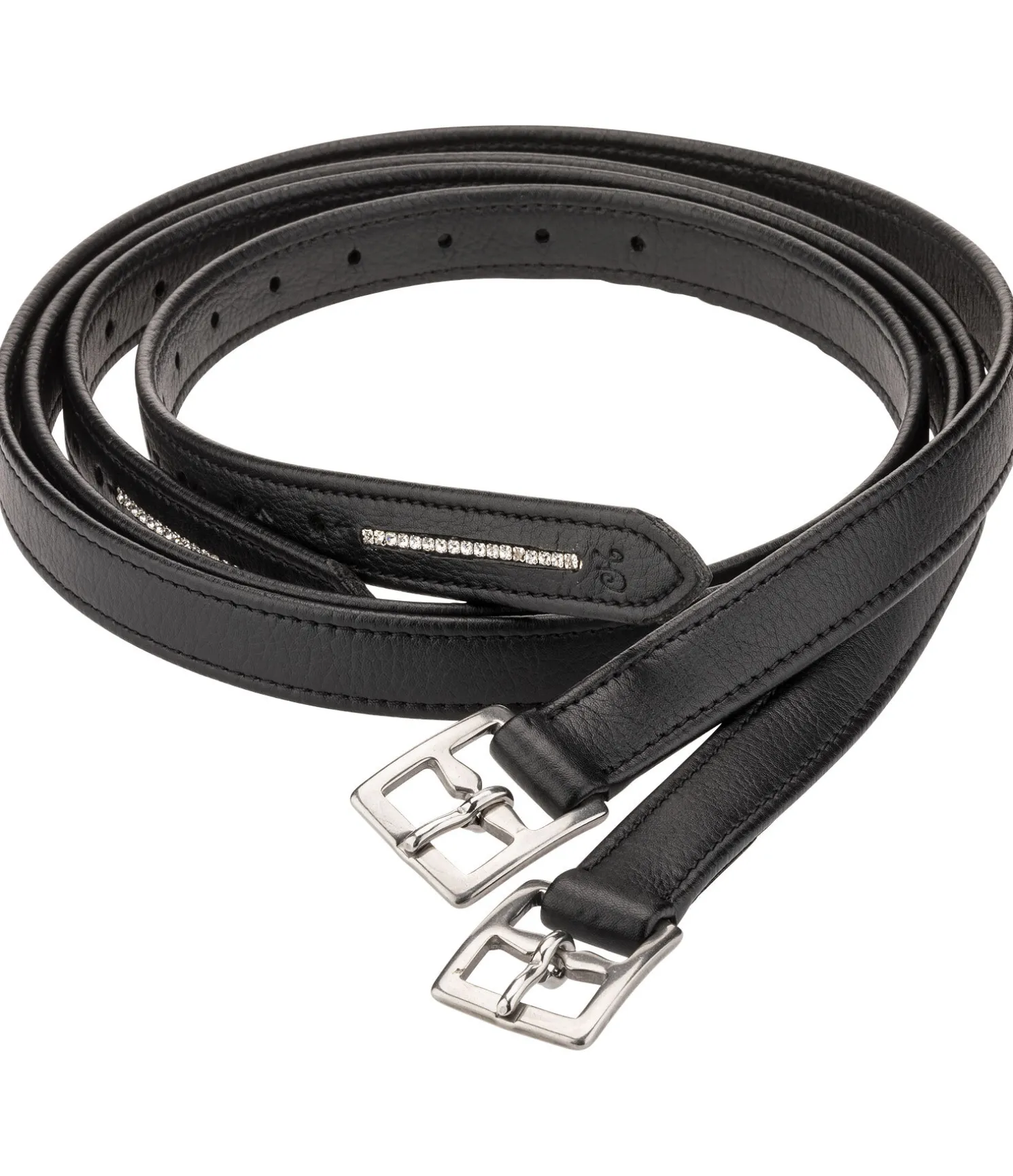 Étrivières en synthétique SYLKA particulièrement résistant, solide, facile d’entretien et souple. Ornées d’une rangée de petits strass blancs. Bouclerie en acier argenté lègerement courbée. Largeur 2,5 cm. Vendues par paire.