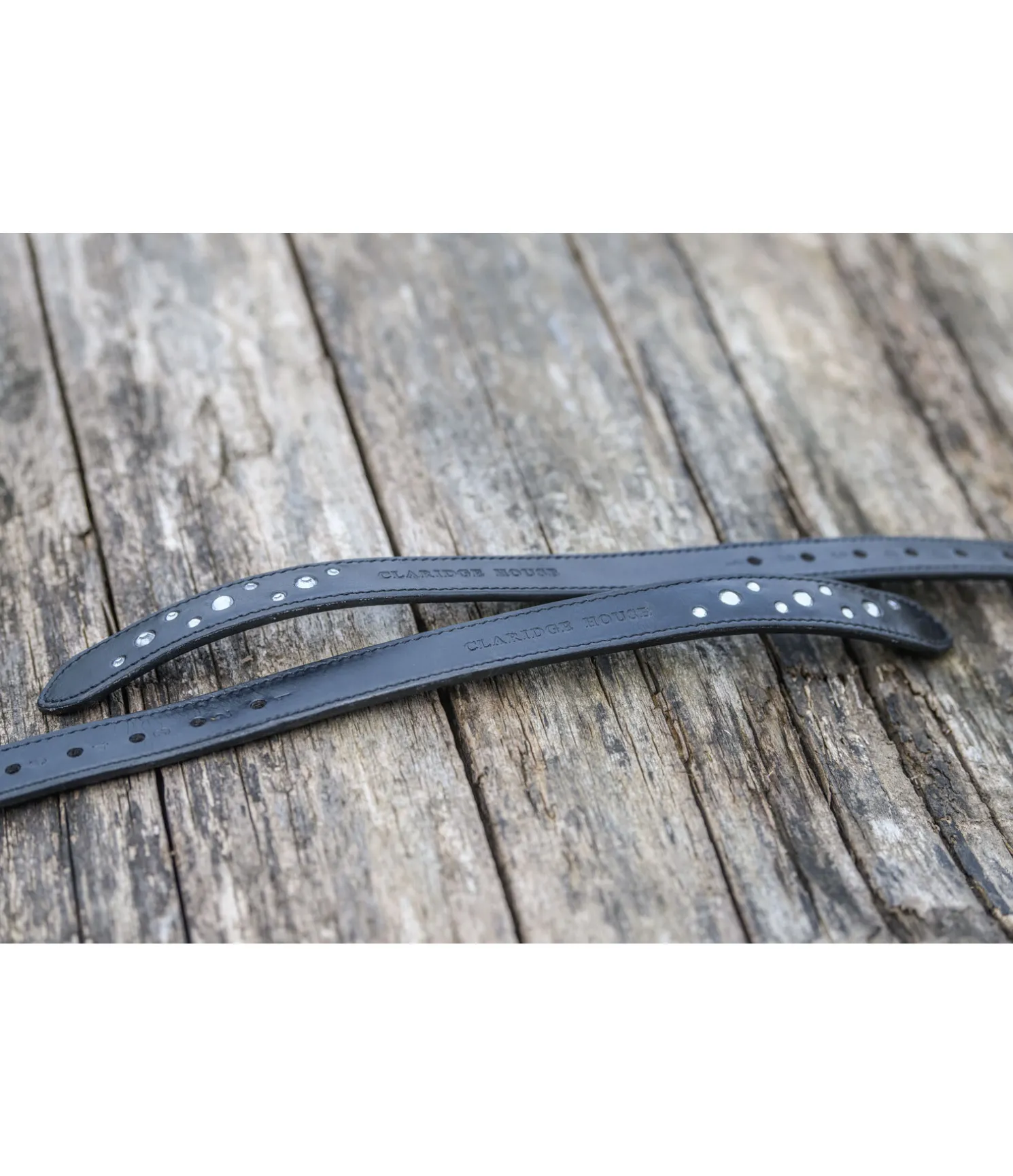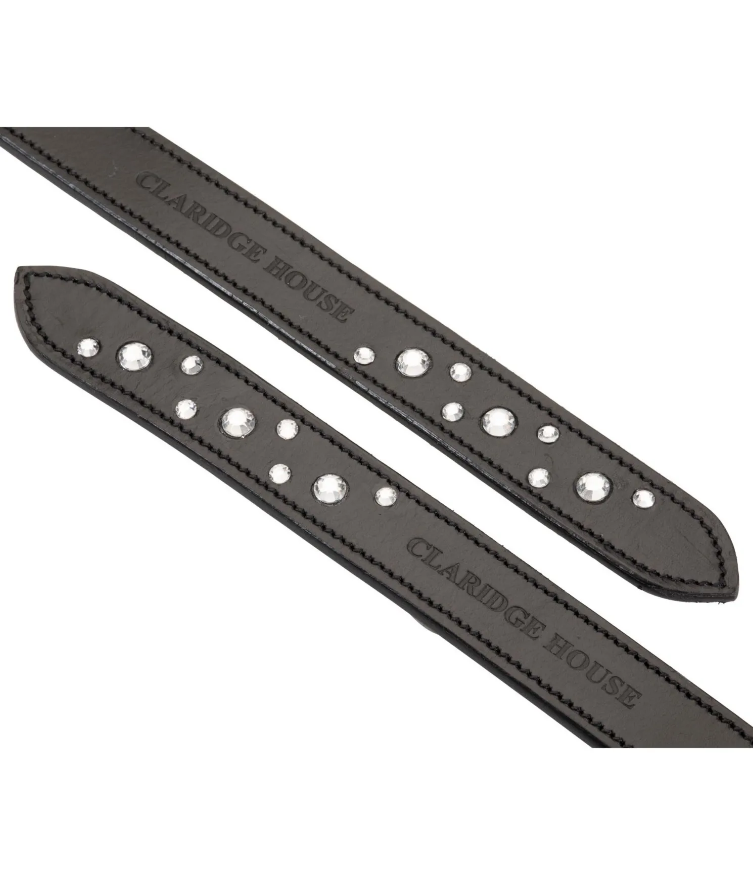 Étrivières en cuir décorées de nombreux strass scintillants. Boucles argentées en acier inoxydable. Largeur 2,55 cm. Vendues par paire.