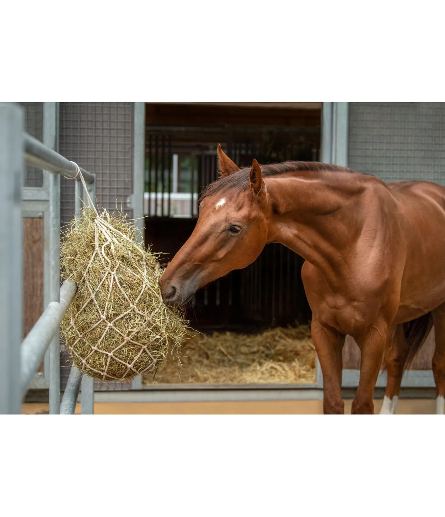 Filet à foin en coton. Largeur de maille 10 x 10 cm. Dimension du filet vide : 100 x 80 cm. Capacité : environ 6 kg.