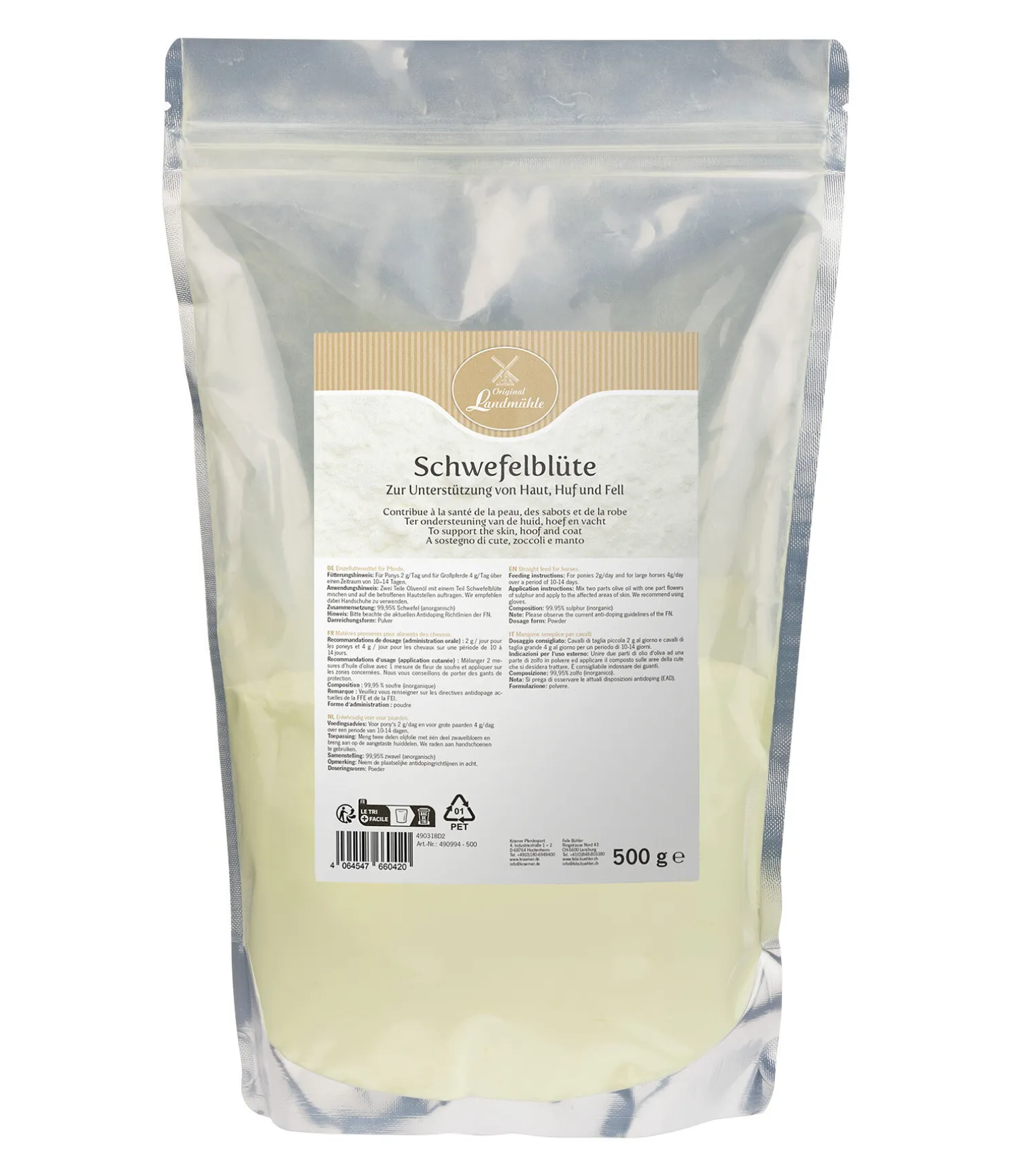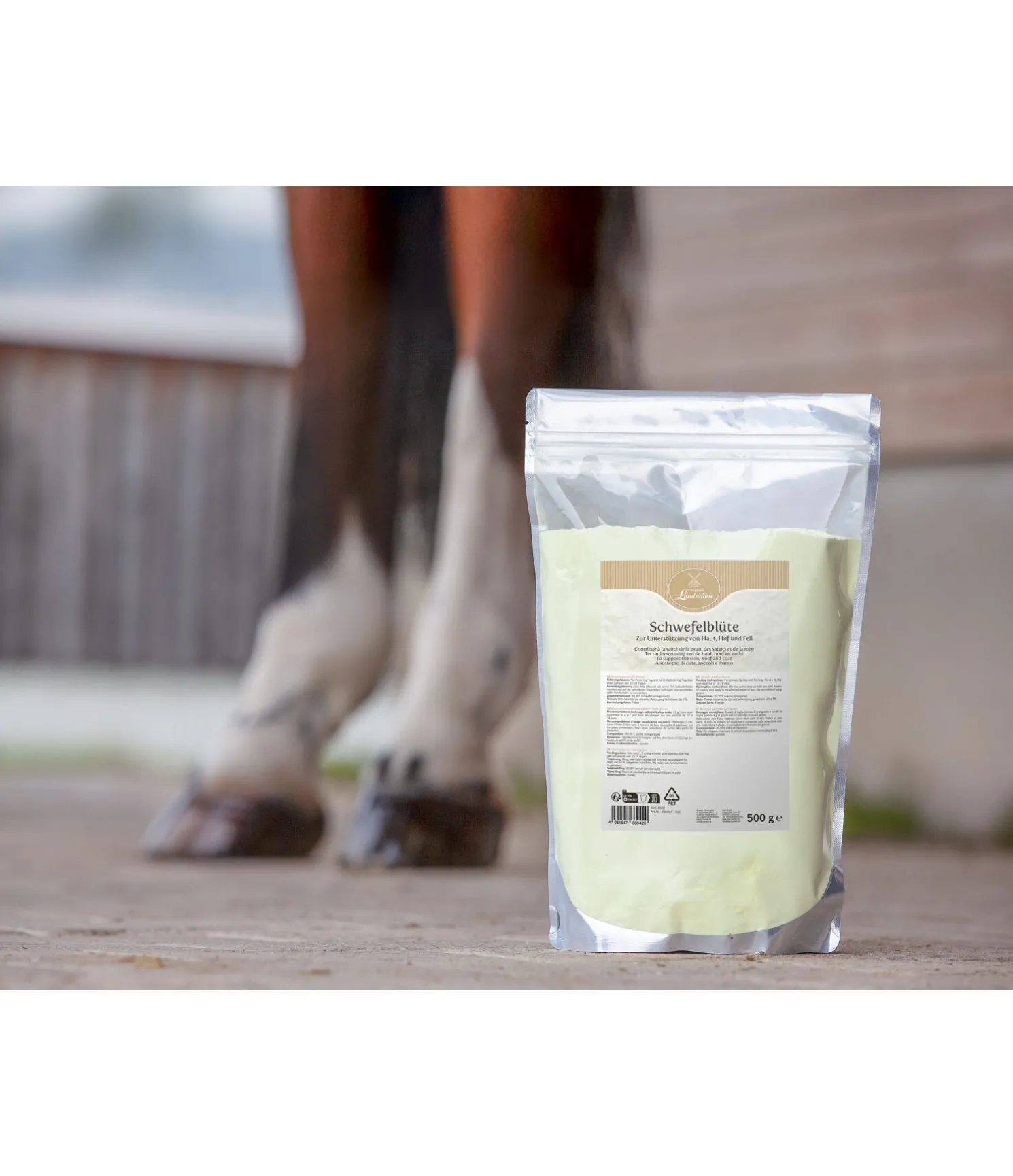 Matière première pour aliments des chevaux. Le soufre fait partie des minéraux essentiels et peut contribuer à faire briller la robe et maintenir la bonne santé de la peau et des sabots.