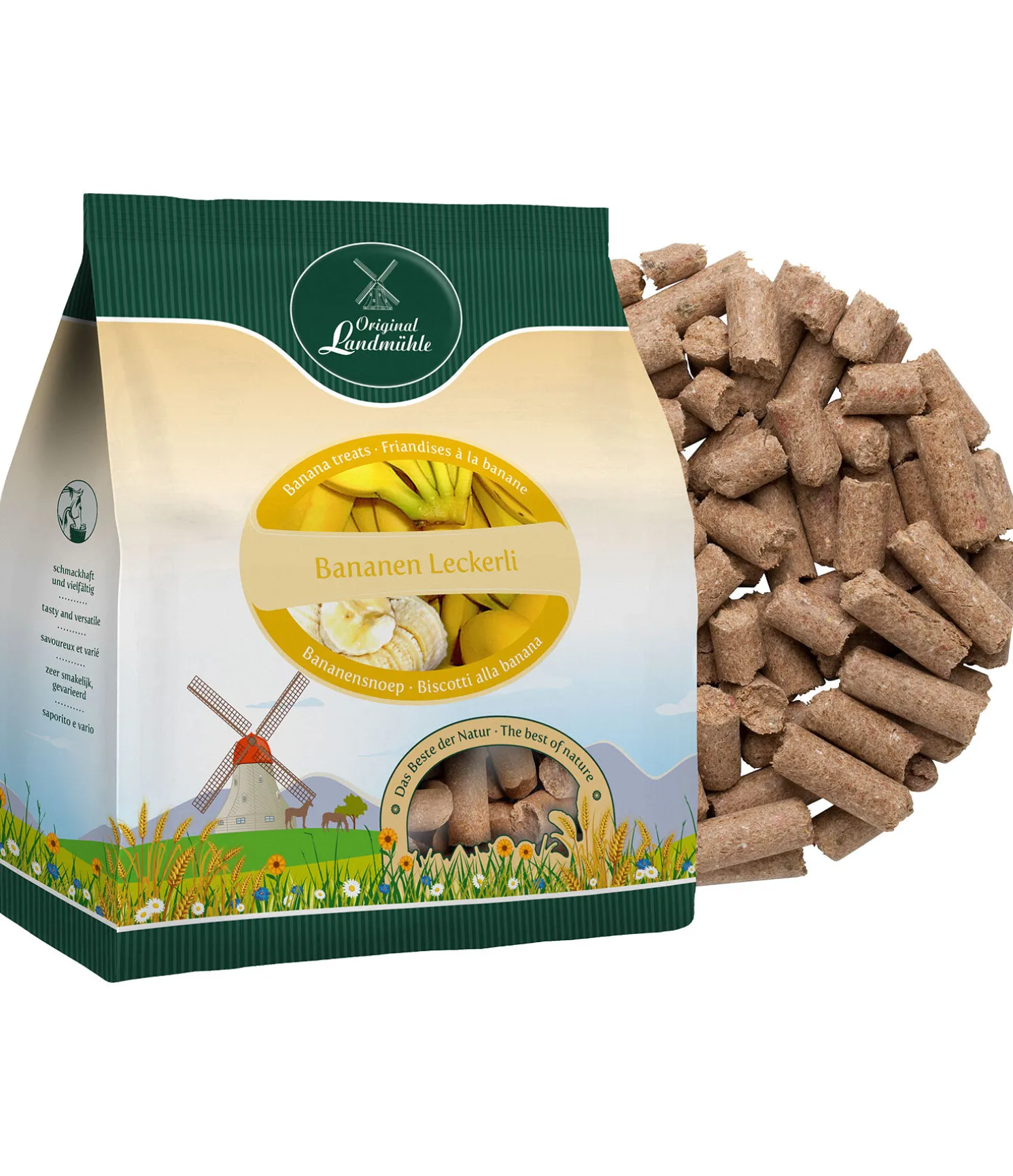 Composition : Son d’avoine, son de blé, carbonate de calcium, orge, mélasse de canne à sucre, maïs, 0,2 % banane (séchée).