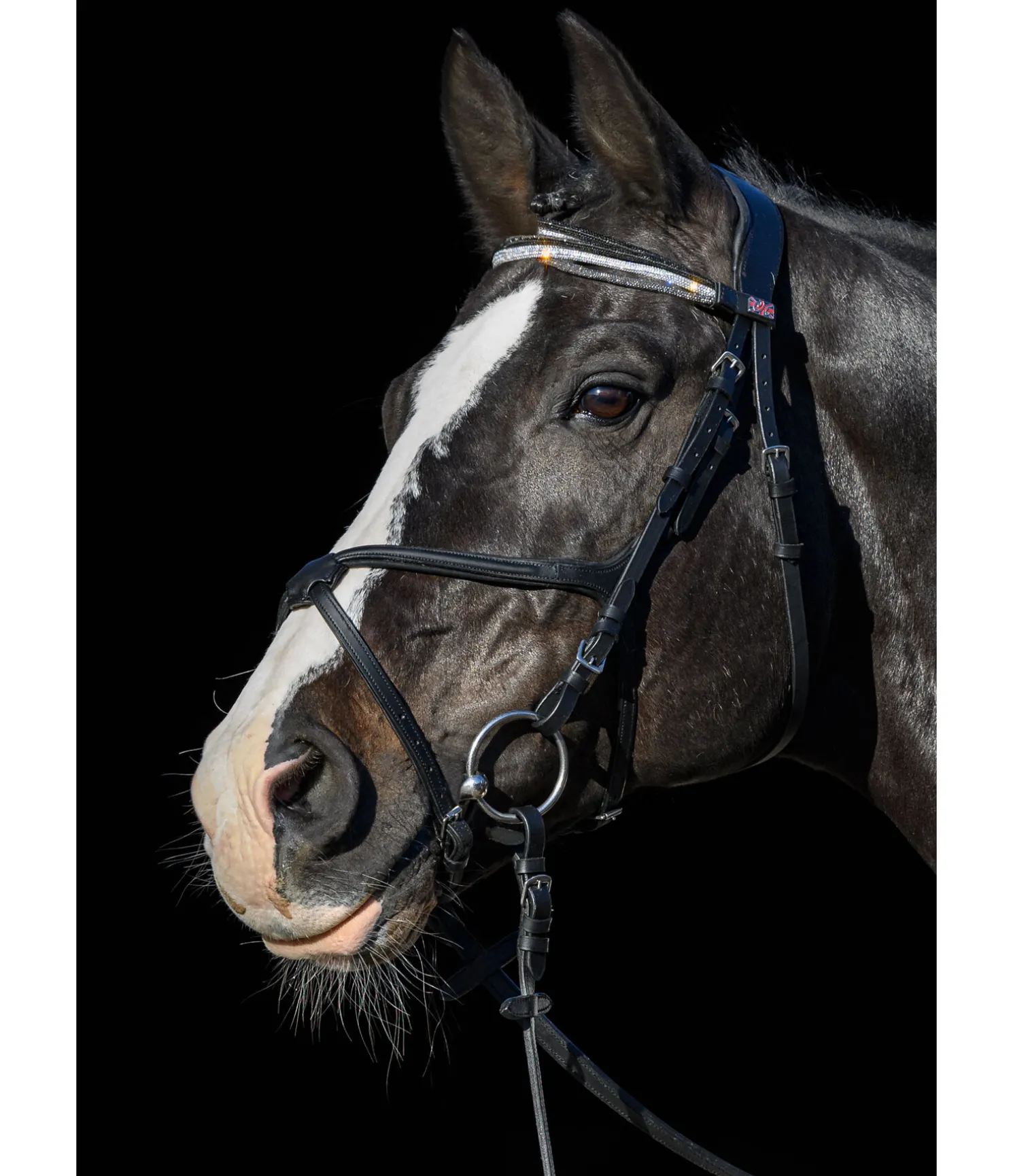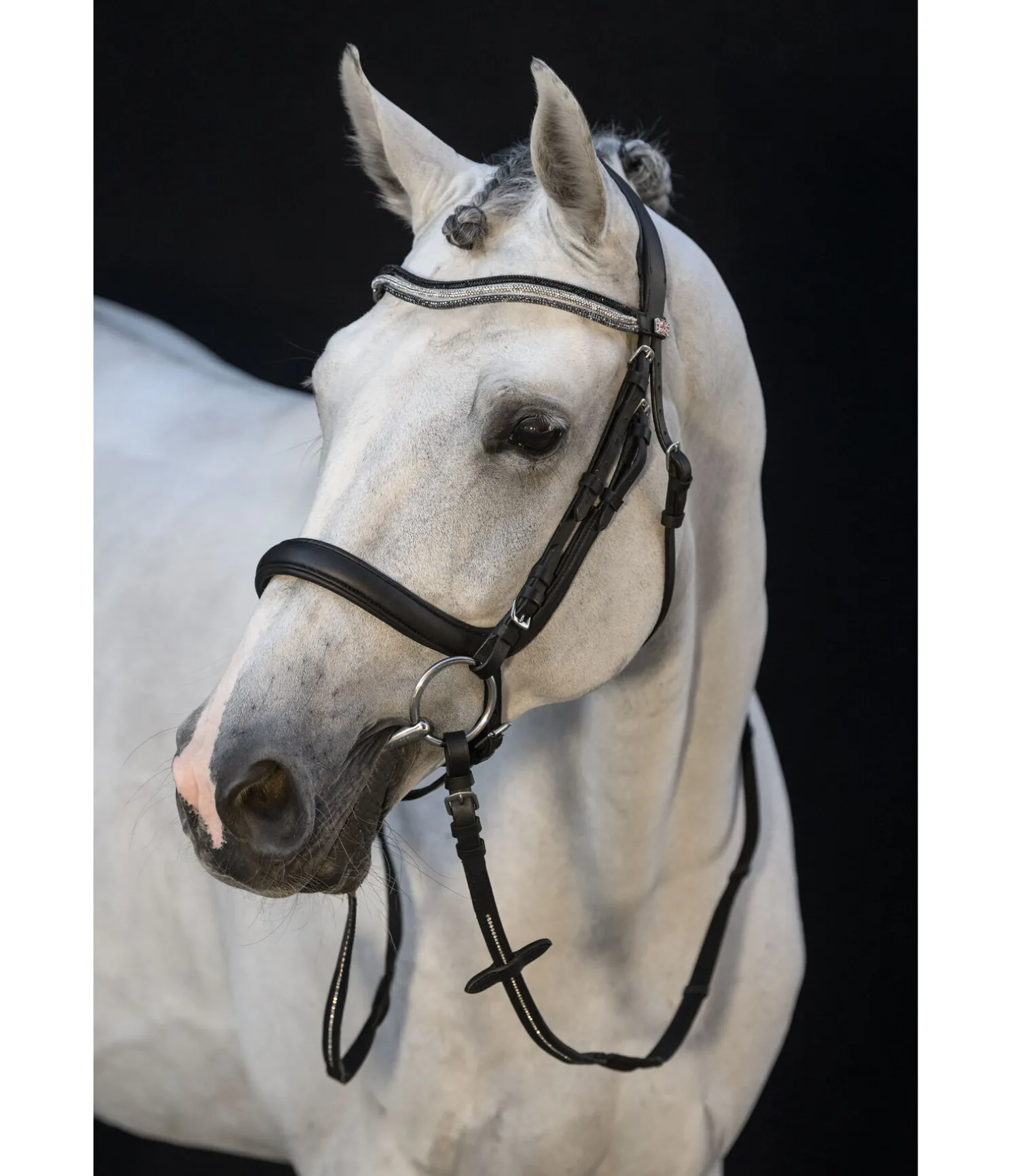 Frontal vague triple original. Composé de trois bandes de strass gris, blancs et noirs qui forment un dégradé étincelant. Cuir gras.