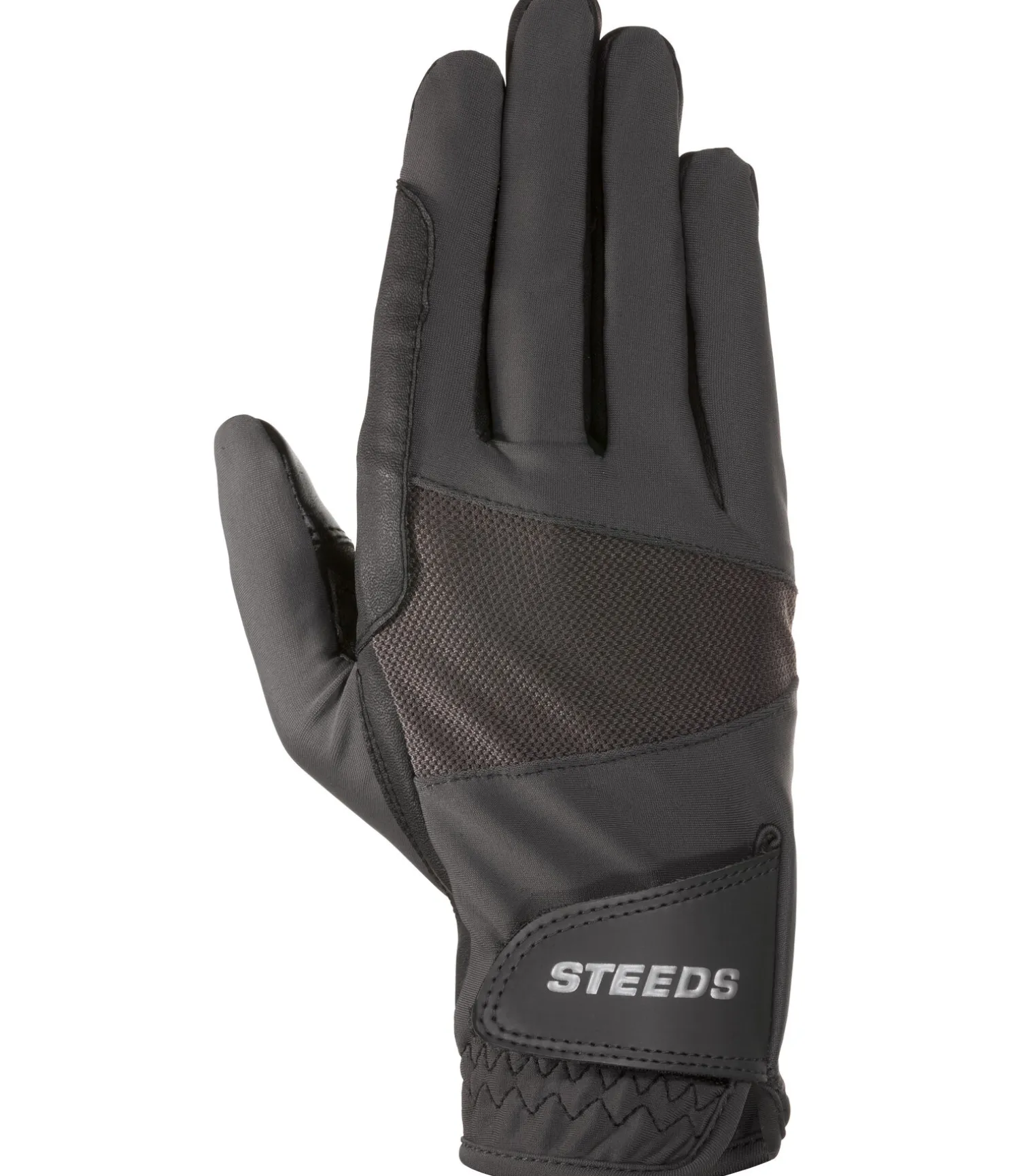 Gants d’équitation d’été légers au look sportif. Dos de la main extensible en tissus mesh respirant et en nylon fin. Paume antidérapante en matière PU pour une bonne prise en main des rênes. Poignets élastiqués avec logo STEEDS métallisé imprimé sur la fermeture auto-agrippante. Renforts aux passages de rênes. Dessus : 70 % nylon, 30 % élasthanne. Paume: 80 % polyuréthane, 20 % polyester.