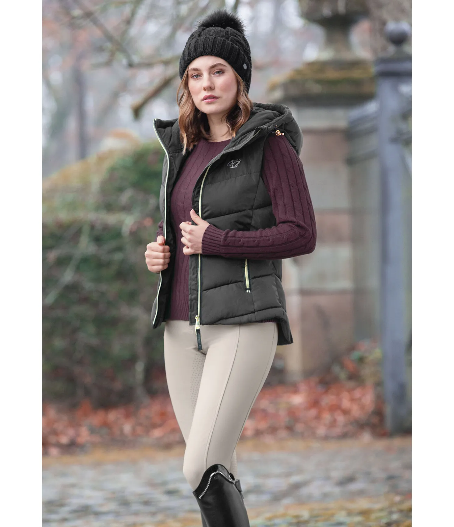 Gilet d’équitation avec doublure chaude. Capuche haute réglable doublée en polaire. Bouton-pression pour fixer la capuche dans le dos. Coupe cintrée légèrement plus longue à l’arrière. 2 poches avant zippées. Fermeture à glissière double sens avec sous-patte et protège-menton. 2 fentes cavalières avec boutons-pression à l’arrière. Garnissage doux imitation duvet. Broderie sur la poitrine et sur la capuche. 100 % polyester.