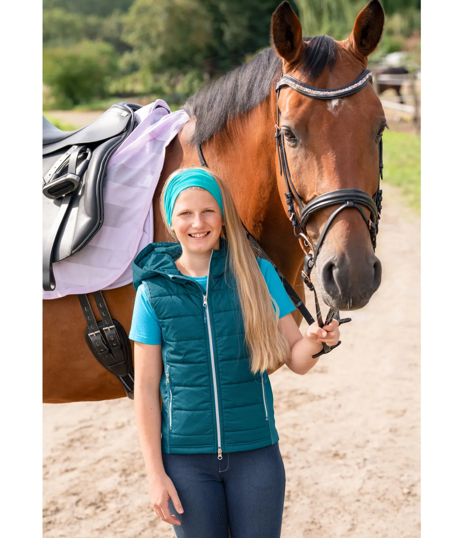 Gilet d’équitation à capuche. Inserts latéraux en stretch Performance doux et matelassés à l’avant et au dos. Capuche matelassée. Bouton-pression pour fixer la capuche dans le dos. Fermeture à glissière bidirectionnelle avec protège-menton. Deux poches latérales zippées. Badge STEEDS sur la poitrine. 100 % polyester, inserts stretch 96 % polyester, 4 % élasthanne.