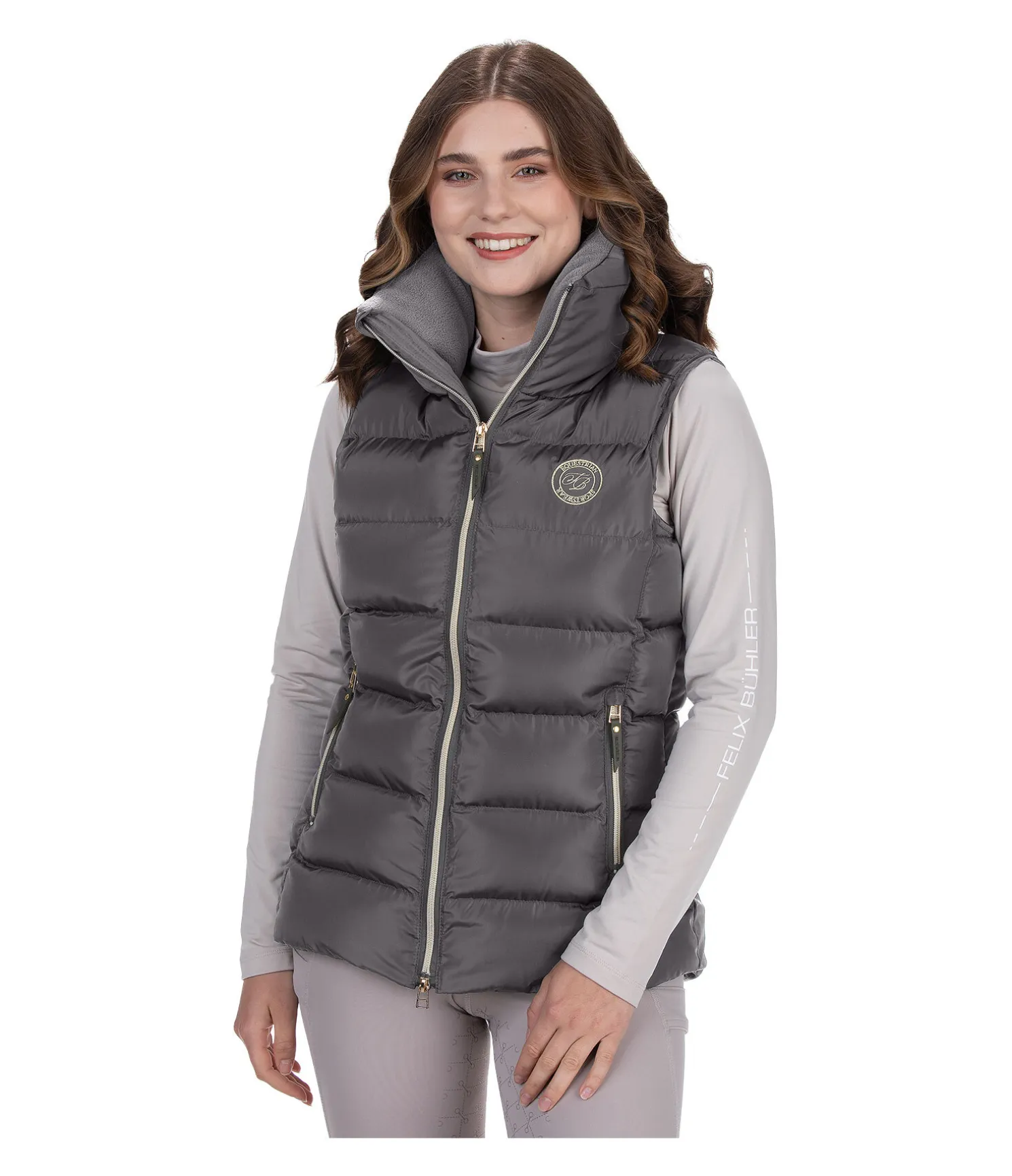 Élégant gilet d’équitation classique avec large col extra haut, chaud et doublé de polaire douce. Coupe plus longue à l’arrière. Rembourrage douillet, fermeture à glissière double sens avec sous-patte et protège-menton, 2 poches zippées devant et 1 poche intérieure zippée. Broderie Felix Bühler sur la poitrine et le col. 100 % polyester.