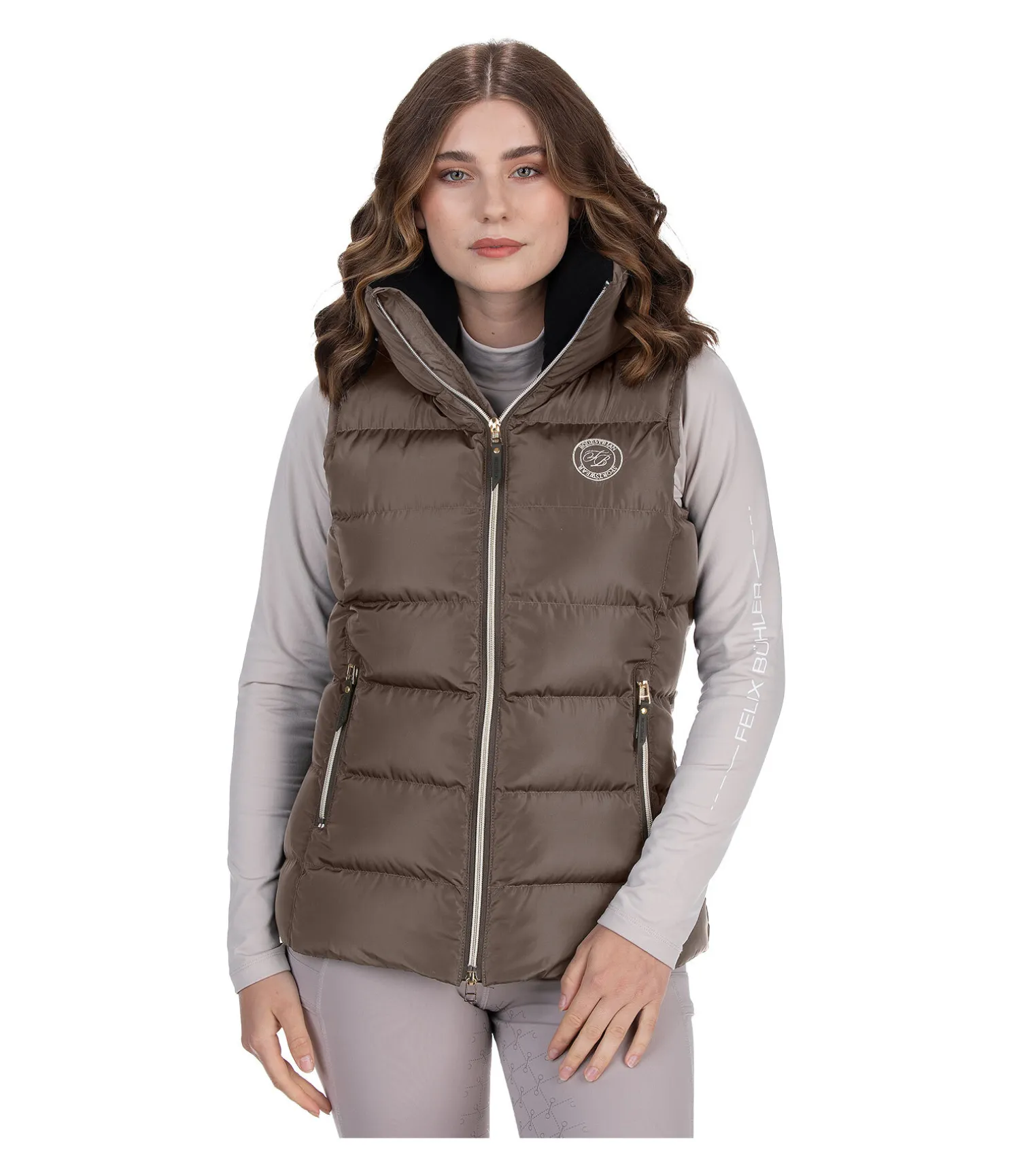 Élégant gilet d’équitation classique avec large col extra haut, chaud et doublé de polaire douce. Coupe plus longue à l’arrière. Rembourrage douillet, fermeture à glissière double sens avec sous-patte et protège-menton, 2 poches zippées devant et 1 poche intérieure zippée. Broderie Felix Bühler sur la poitrine et le col. 100 % polyester.