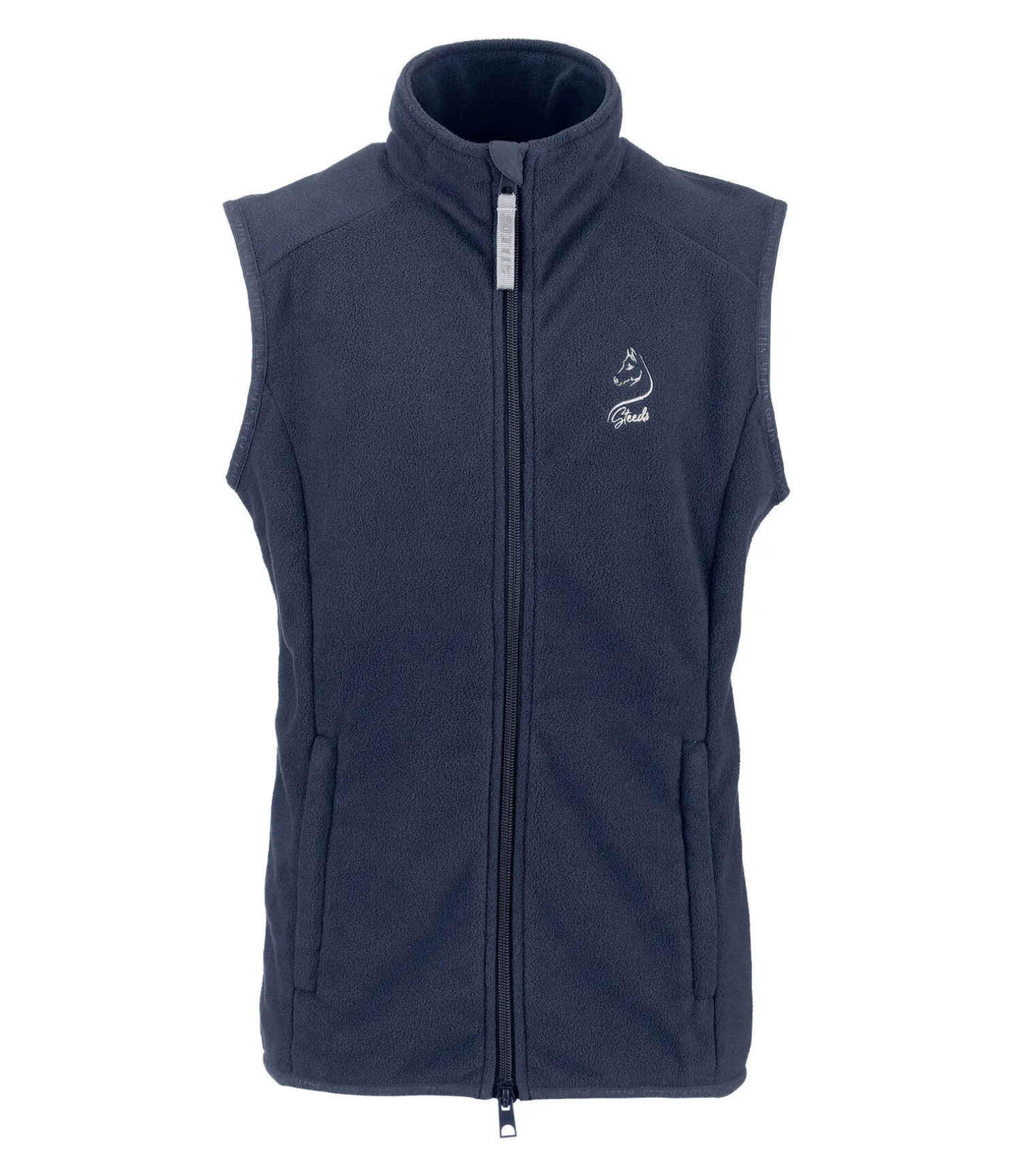 Gilet d’équitation polaire basique pour enfant. Col montant. Fermeture à glissière double sens avec sous-patte et protège-menton, 2 poches zippées à l’avant, emmanchures et taille élastiquée et logo STEEDS brodé sur la poitrine. Traitement anti-bouloches. 100 % polyester.