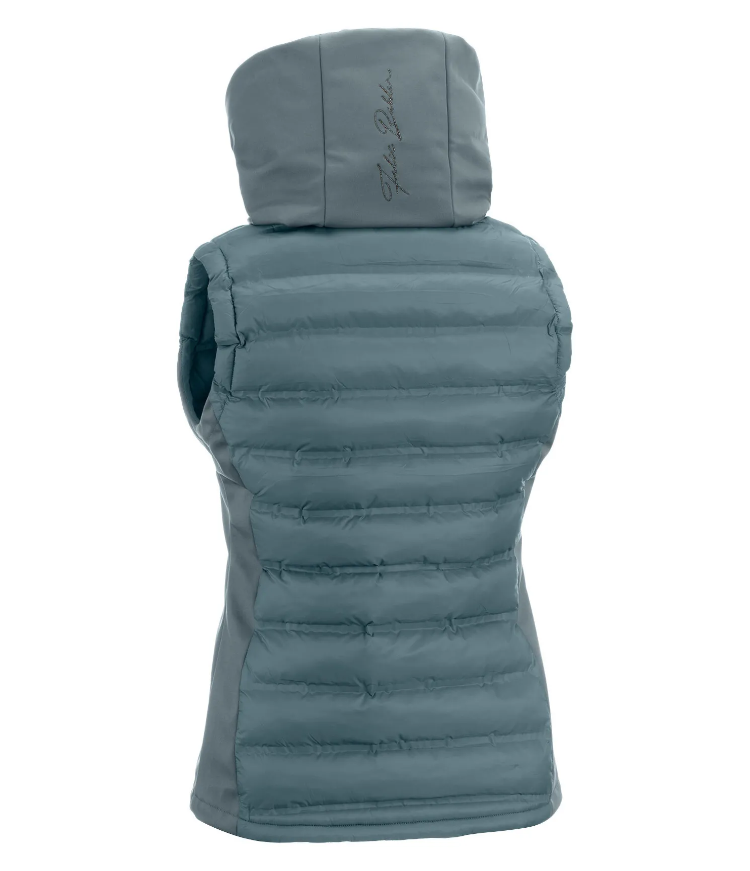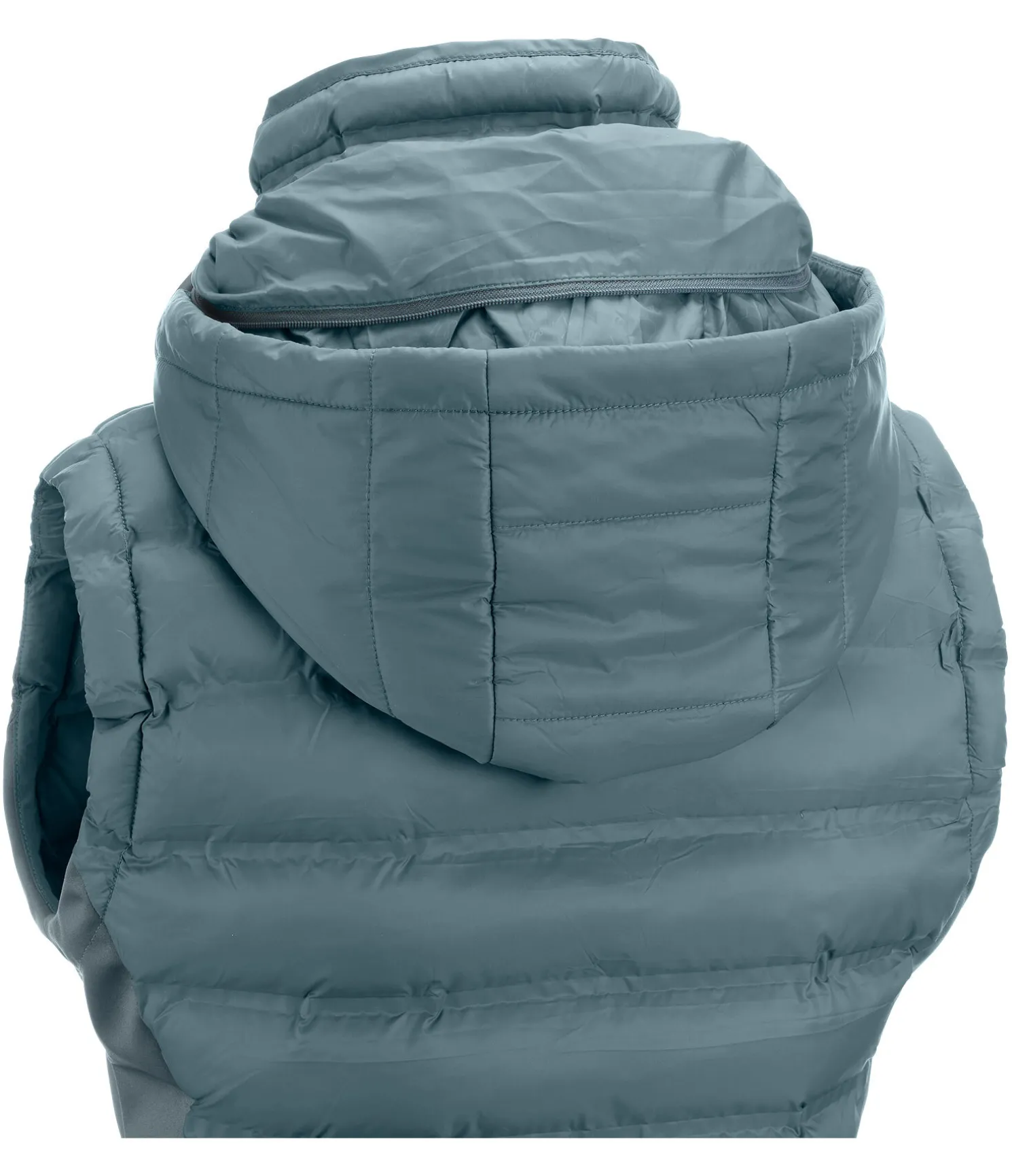 Superbe gilet en softshell extensible et nylon avec un garnissage très doux en imitation duvet devant et derrière. Coupe-vent. Double col et capuche rembourrée repliable dans le large col extérieur par fermeture à glissière, coutures thermosoudées, fermeture à glissière double sens avec sous-patte et protège-menton, 2 poches zippées devant. Logo élaboré sur la manche et le col. Avant, dos, col intérieur et capuche 100 % nylon, matière softshell 92 % polyester, 8 % élasthanne.