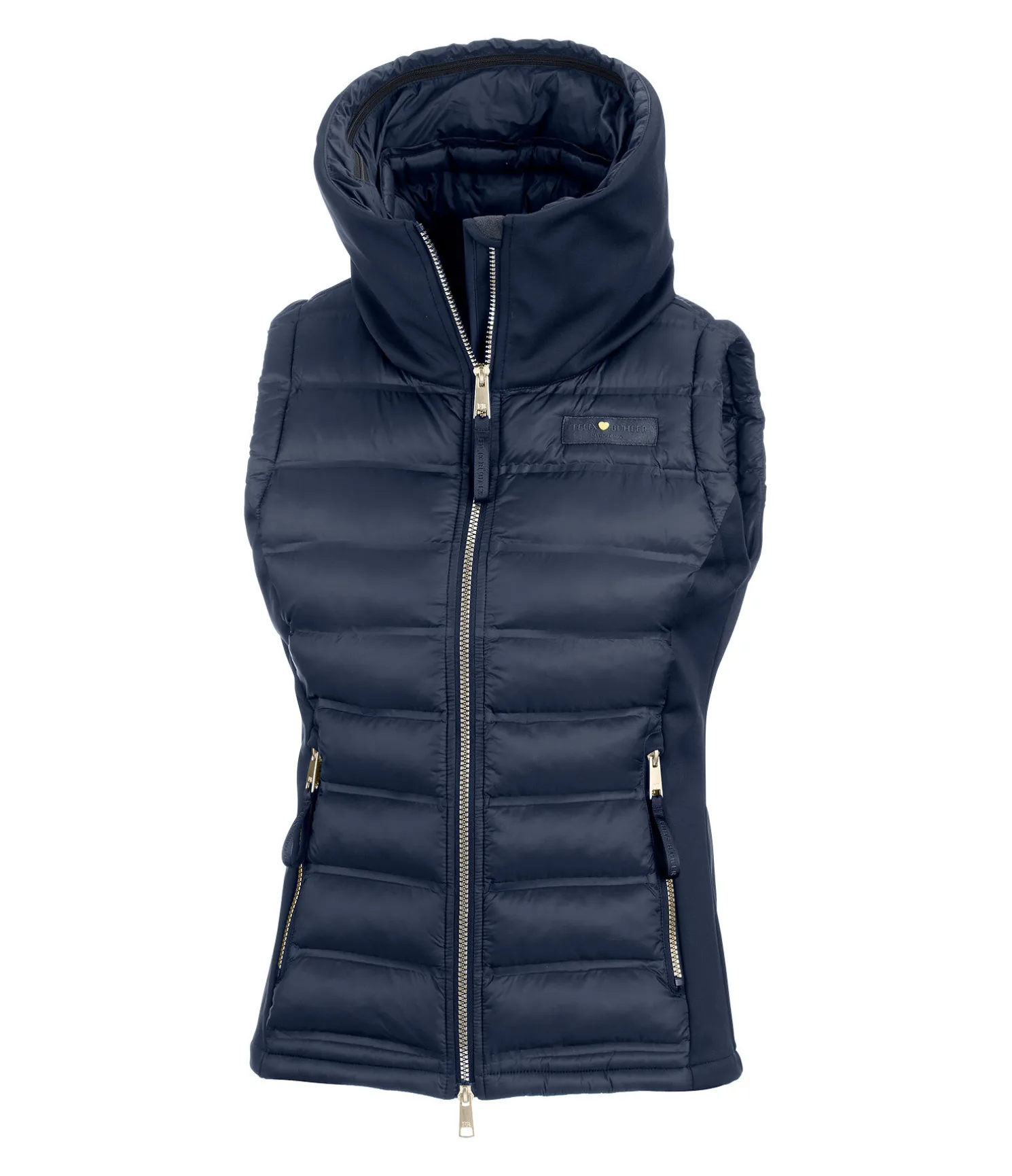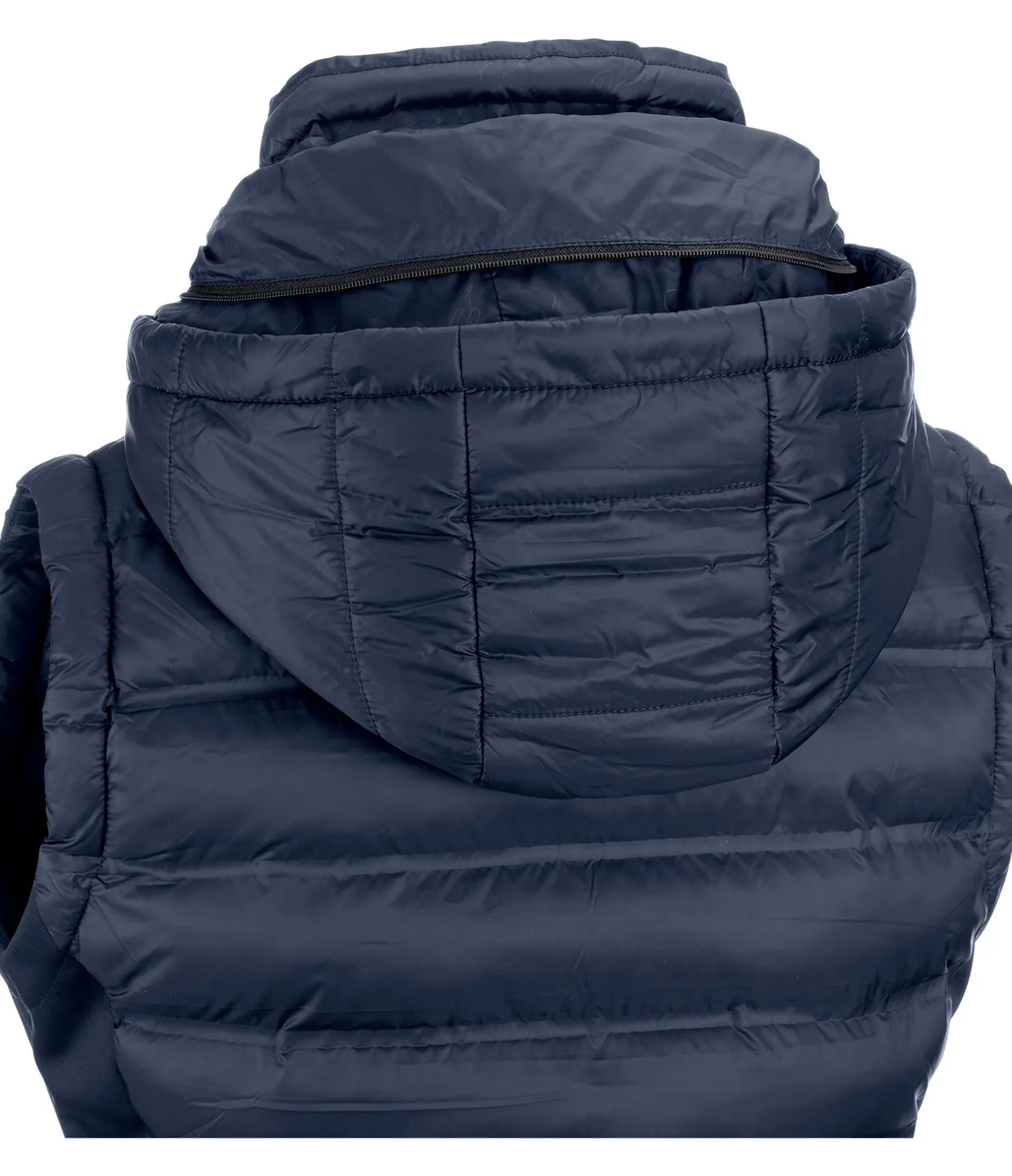 Superbe gilet en softshell extensible et nylon avec un garnissage très doux en imitation duvet devant et derrière. Coupe-vent. Double col et capuche rembourrée repliable dans le large col extérieur par fermeture à glissière, coutures thermosoudées, fermeture à glissière double sens avec sous-patte et protège-menton, 2 poches zippées devant. Logo élaboré sur la manche et le col. Avant, dos, col intérieur et capuche 100 % nylon, matière softshell 92 % polyester, 8 % élasthanne.